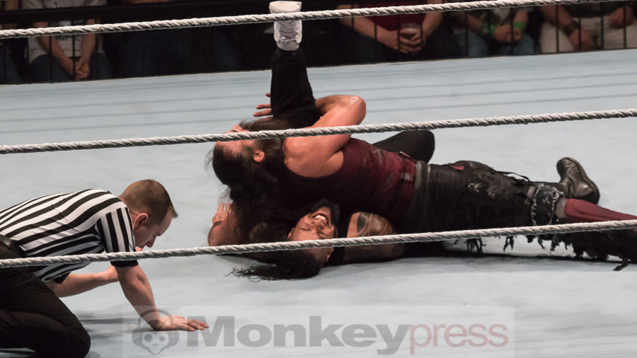 Das nun folgende Frauenmatch fand sogar weltweite Beachtung – das aber aus einem unschönen Grund. Championesse Carmella erwischte ihre Kontrahentin Charlotte Flair mit einem Kick derart unglücklich am Kiefer, dass dieser ein Zahn heraussprang. Was eine Profi-Wrestlerin natürlich nicht davon abhält, das Duell professionell zu Ende zu führen. Am Ende war jedoch alle Mühe umsonst, Carmella ließ sich absichtlich disqualifizieren – das reicht im Wrestling zur Titelverteidigung.