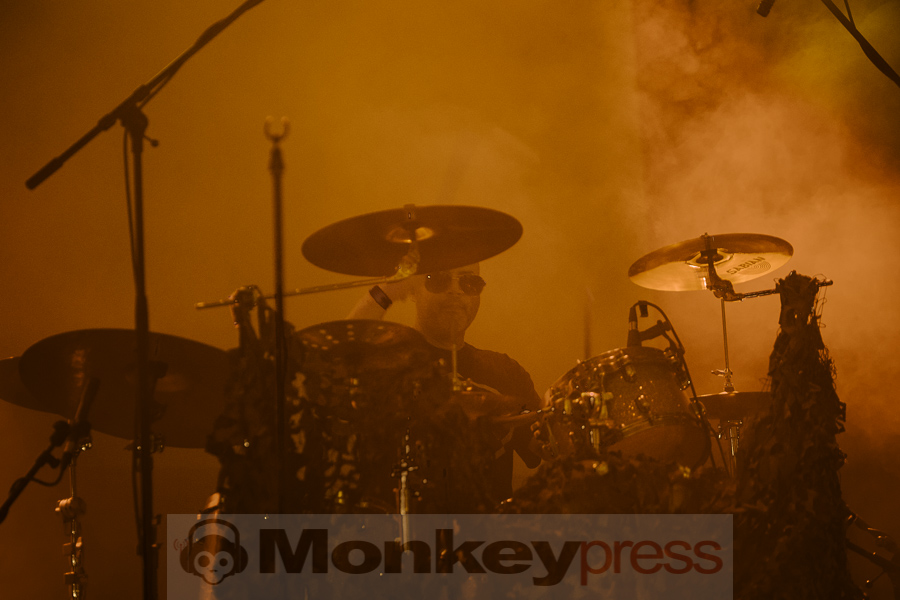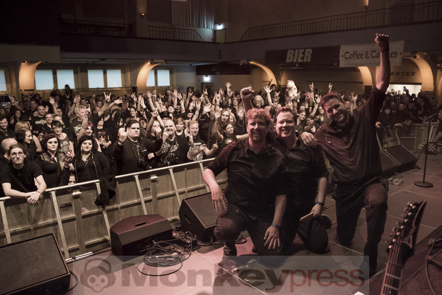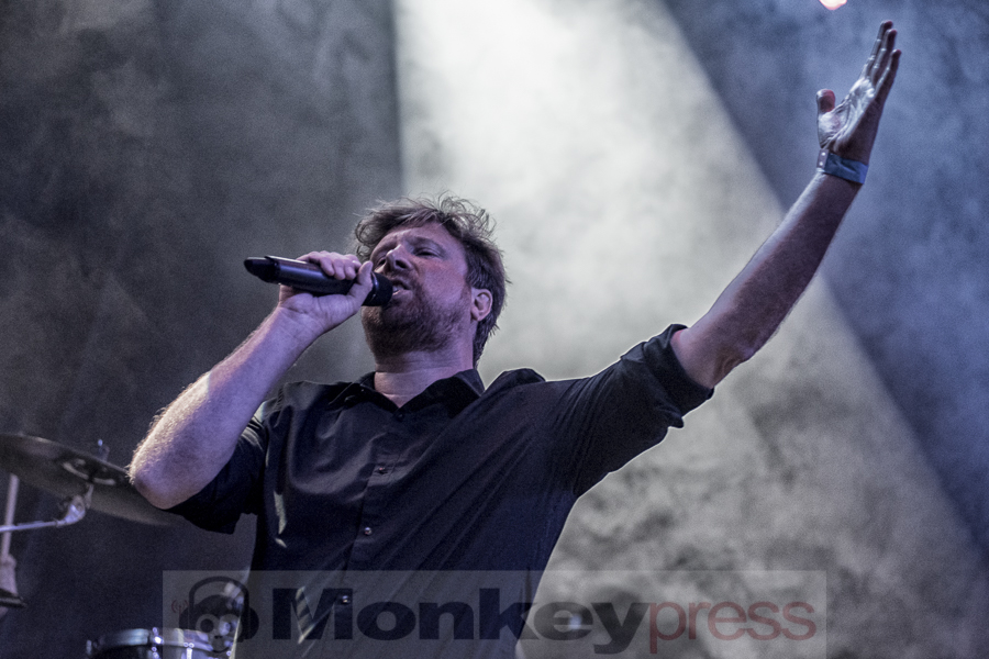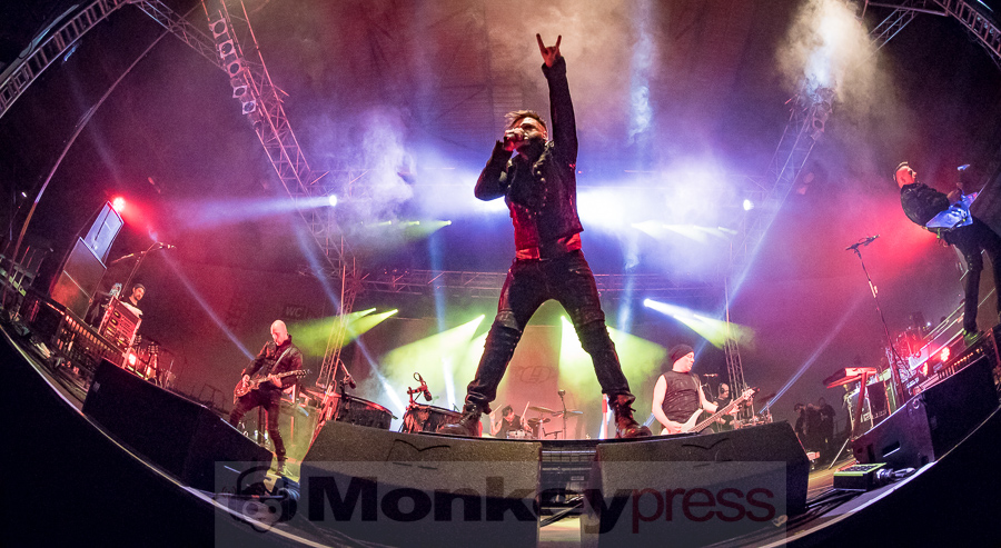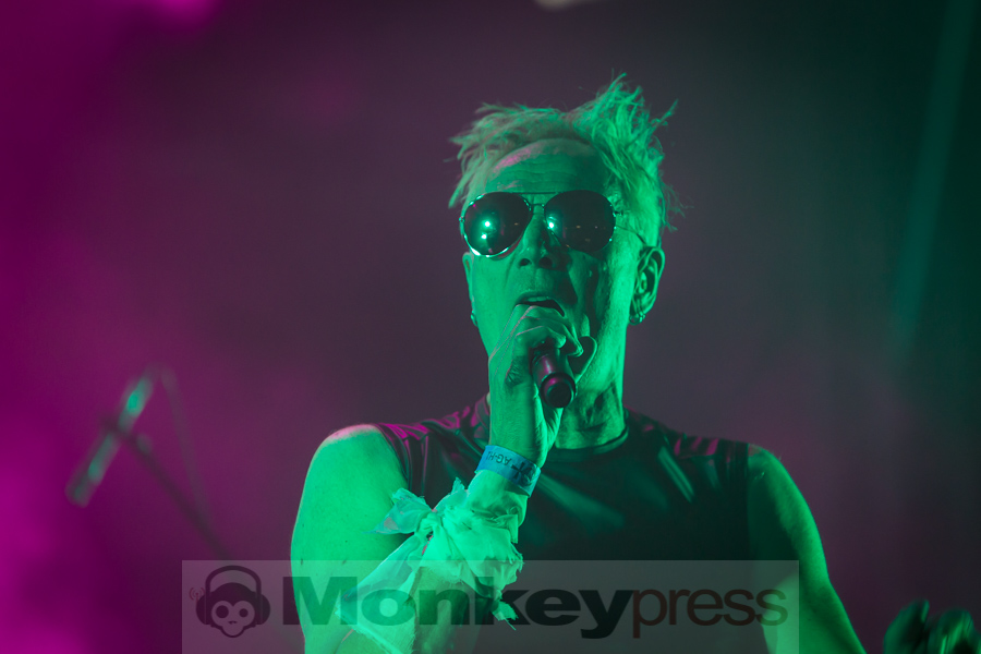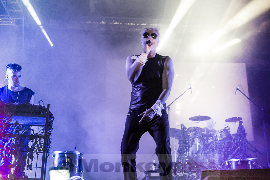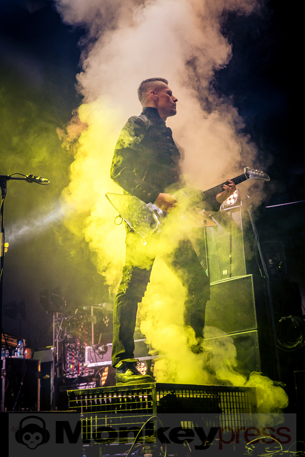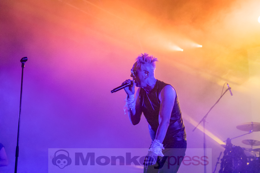 Große Bands finden ihren Weg in die Agra und so muss man, will man zwischen den Acts nicht die Location wechseln, gerade heute, gerade hier ständig und ganz empfindlich die Gefühle wechseln und sich auf abrupte Kehrtwendungen bei den präsentierten Genres einstellen. Mit über 30 Jahren auf dem Buckel und einer Besetzungshistorie, die sogar ein eigenes Organigramm hat, genießen Front Line Assembly im Spannungsfeld von EBM und Industrial Legendenstatus. Das letzte Album Echos hat für Bandverhältnisse auch schon wieder ein ziemlich hohes Alter erreicht, aber der Wahlkanadier Bill Leeb wird uns noch im Juni mit Warmech was Neues in die Regale stellen. Die Agra ist nach wie vor voll. Man merkt es den Leuten an, dass sie hauptsächlich wegen Front Line Assembly da sind. Alles fühlt sich nach der Vorwegnahme des heutigen Headliners unter einer Dunstglocke an. Hier haben vor allem Brillenträger und Fotografen ihre liebe Not. Die Show beginnt pünktlich mit einem gefühlt ewigen Intro, bei dem auf der Bühne erst einmal nicht viel passiert. An den Keyboards stehen zwei Musiker, alles wirkt etwas statisch und abgeklärt, auch der Drummer, der wenig später dazukommt ändert daran erst einmal wenig. Erst als der Meister selbst die Bühne betritt, wirkt die Show wie entfesselt. Bill Leeb, so scheint es, hat die letzten 30 Jahre einfach so an sich vorbeiziehen lassen, ohne sichtbare Spuren, dafür aber mit haufenweise hämmernden, sägenden Beats, harte Riffs und einer Setlist, an der man sehr gut das Repertoire dieser Zeit durchexerzieren kann. Der Chef lässt seinem Bewegungsdrang freien Lauf, was Dank der großzügigen Bühne auch möglich ist. Der Sound ist für Agra-Verhältnisse auch in Ordnung und die Elektroheads ganz aus dem Häuschen. Ja, was will man denn mehr? (DS)