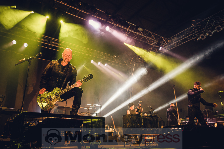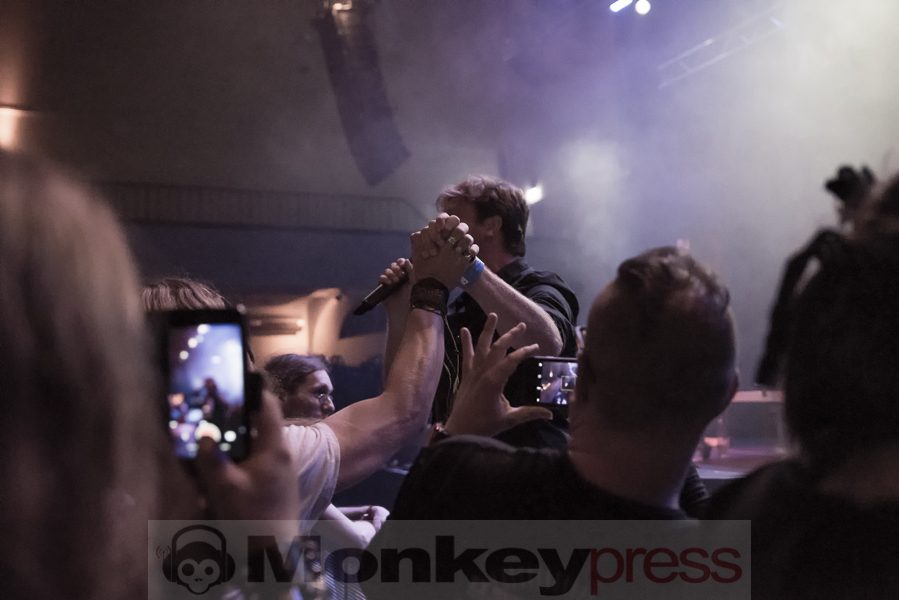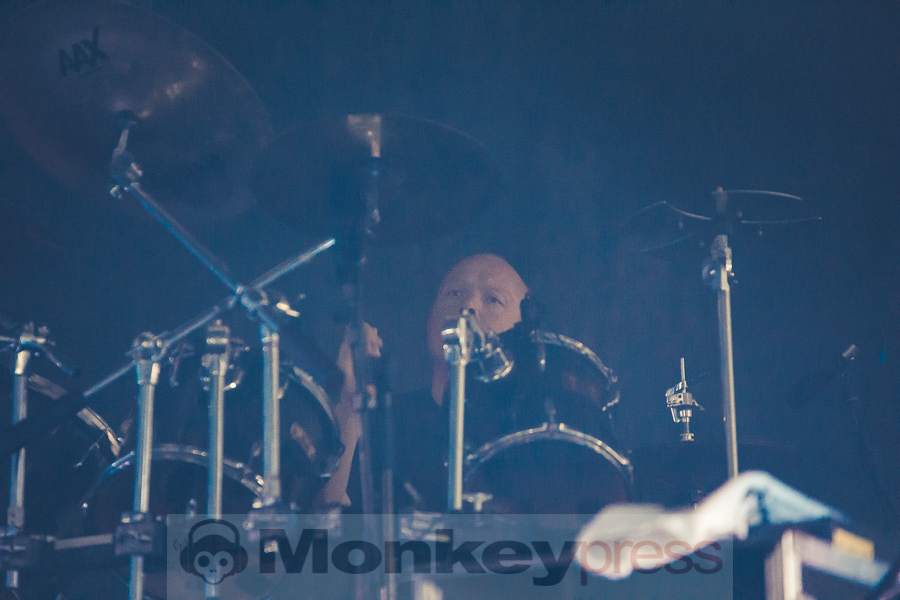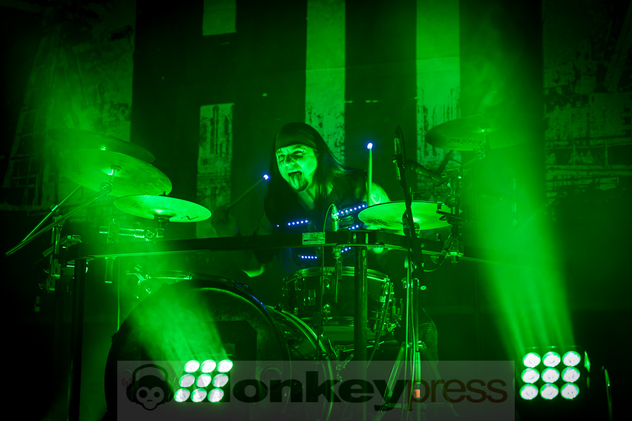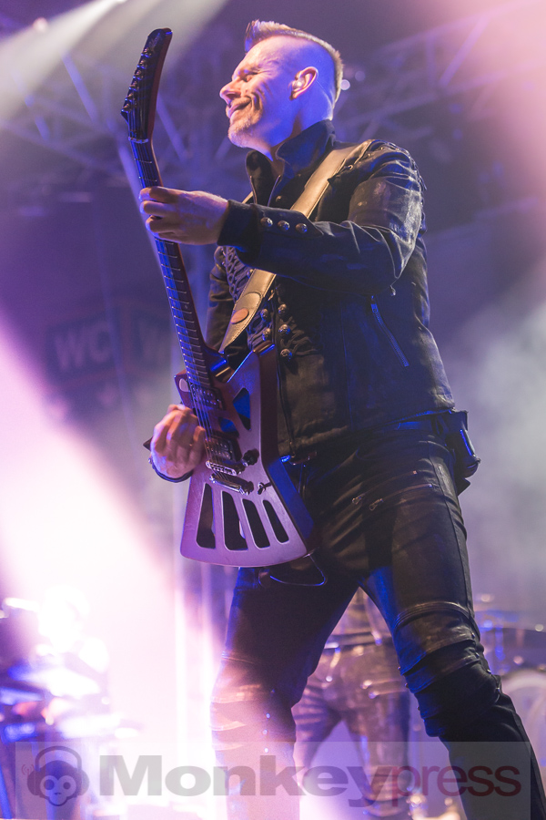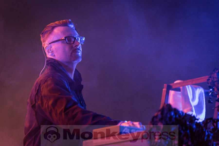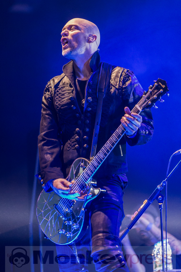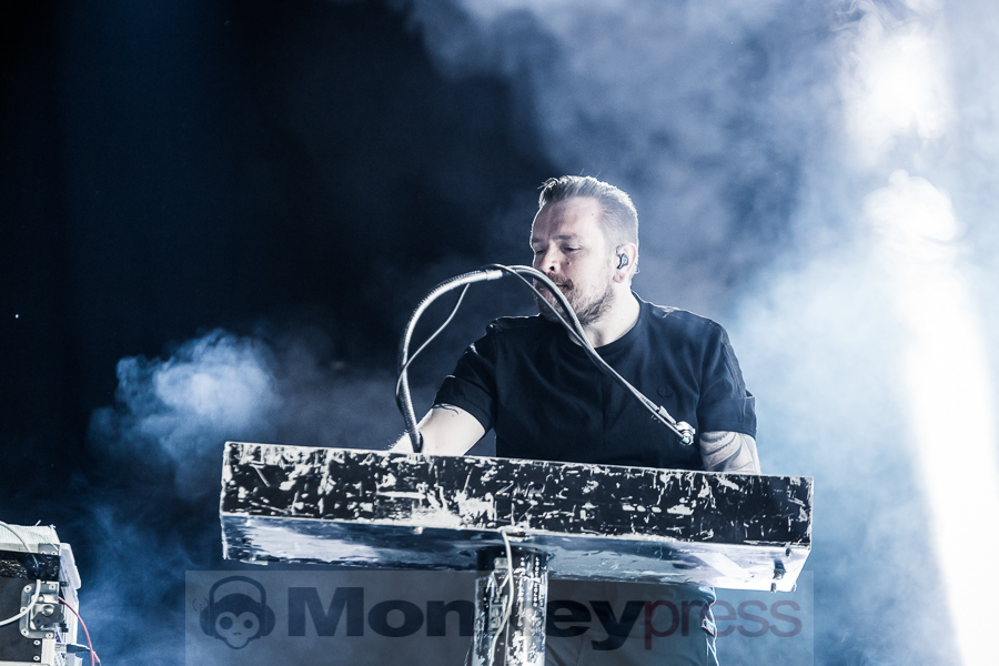 Große Bands finden ihren Weg in die Agra und so muss man, will man zwischen den Acts nicht die Location wechseln, gerade heute, gerade hier ständig und ganz empfindlich die Gefühle wechseln und sich auf abrupte Kehrtwendungen bei den präsentierten Genres einstellen. Mit über 30 Jahren auf dem Buckel und einer Besetzungshistorie, die sogar ein eigenes Organigramm hat, genießen Front Line Assembly im Spannungsfeld von EBM und Industrial Legendenstatus. Das letzte Album Echos hat für Bandverhältnisse auch schon wieder ein ziemlich hohes Alter erreicht, aber der Wahlkanadier Bill Leeb wird uns noch im Juni mit Warmech was Neues in die Regale stellen. Die Agra ist nach wie vor voll. Man merkt es den Leuten an, dass sie hauptsächlich wegen Front Line Assembly da sind. Alles fühlt sich nach der Vorwegnahme des heutigen Headliners unter einer Dunstglocke an. Hier haben vor allem Brillenträger und Fotografen ihre liebe Not. Die Show beginnt pünktlich mit einem gefühlt ewigen Intro, bei dem auf der Bühne erst einmal nicht viel passiert. An den Keyboards stehen zwei Musiker, alles wirkt etwas statisch und abgeklärt, auch der Drummer, der wenig später dazukommt ändert daran erst einmal wenig. Erst als der Meister selbst die Bühne betritt, wirkt die Show wie entfesselt. Bill Leeb, so scheint es, hat die letzten 30 Jahre einfach so an sich vorbeiziehen lassen, ohne sichtbare Spuren, dafür aber mit haufenweise hämmernden, sägenden Beats, harte Riffs und einer Setlist, an der man sehr gut das Repertoire dieser Zeit durchexerzieren kann. Der Chef lässt seinem Bewegungsdrang freien Lauf, was Dank der großzügigen Bühne auch möglich ist. Der Sound ist für Agra-Verhältnisse auch in Ordnung und die Elektroheads ganz aus dem Häuschen. Ja, was will man denn mehr? (DS)
