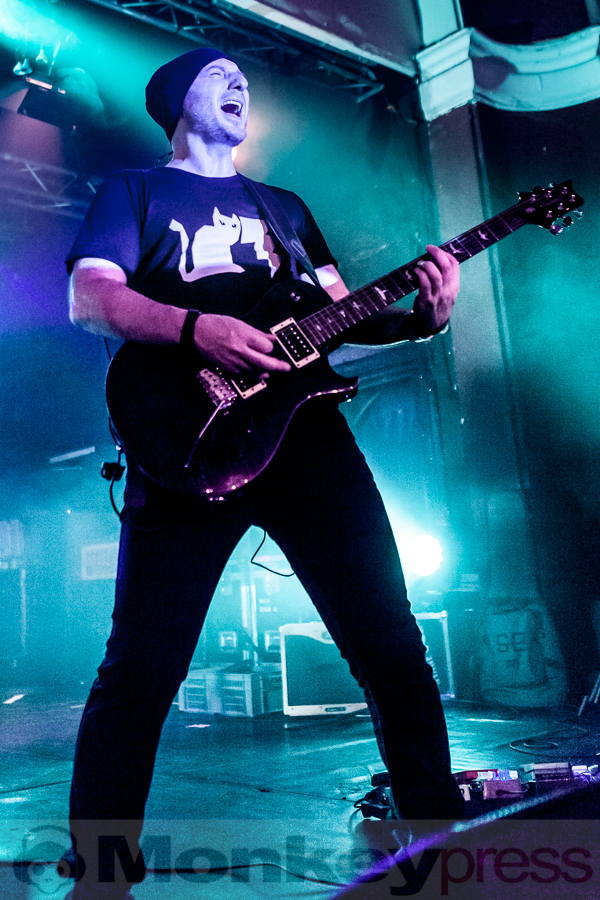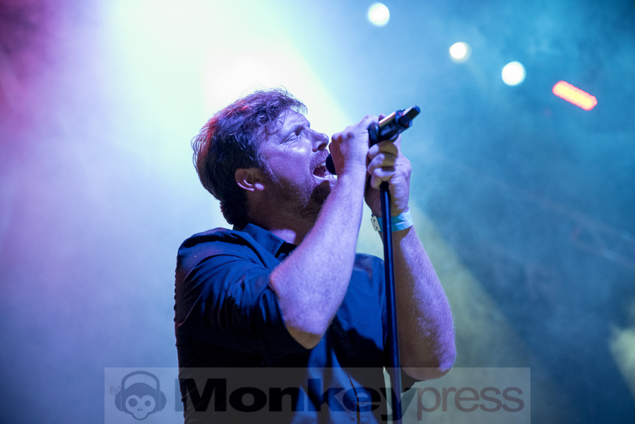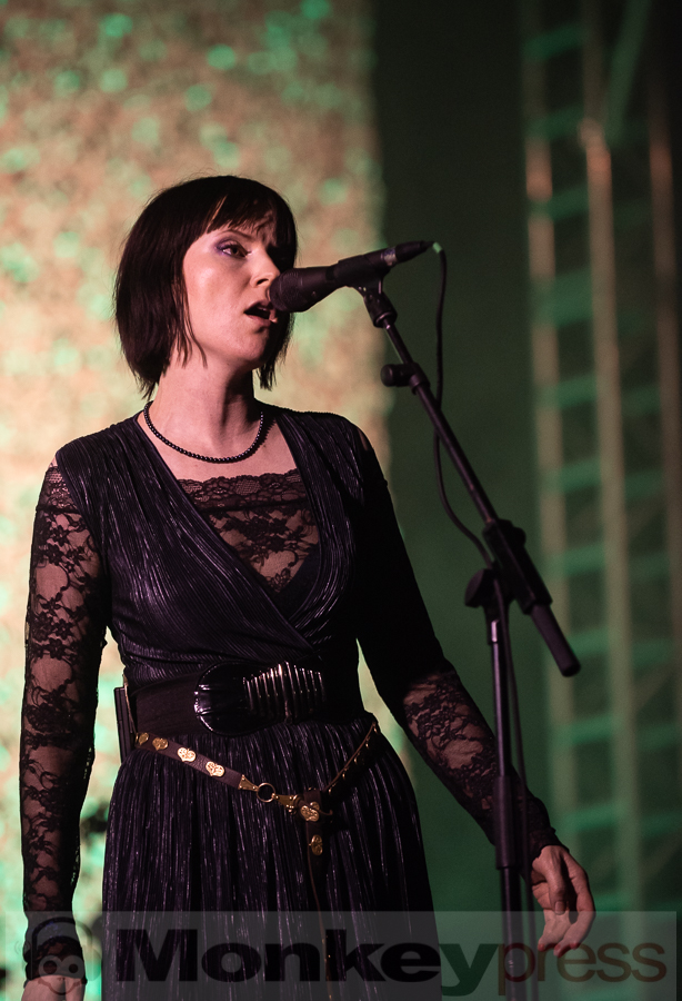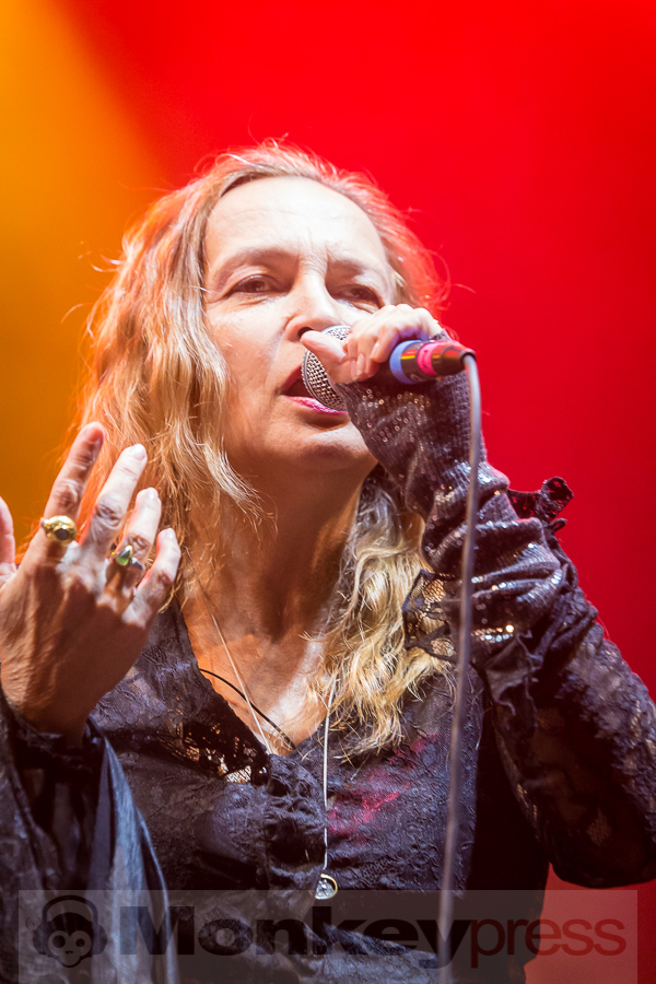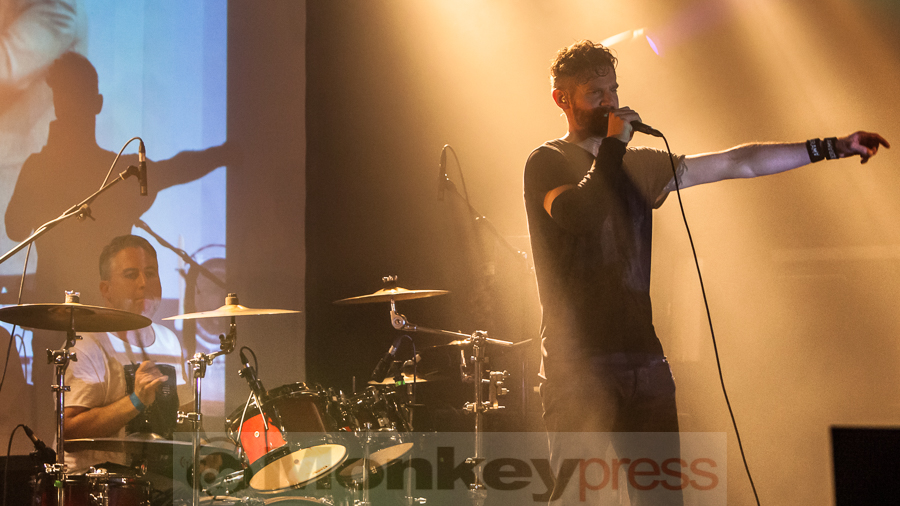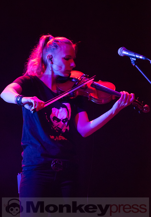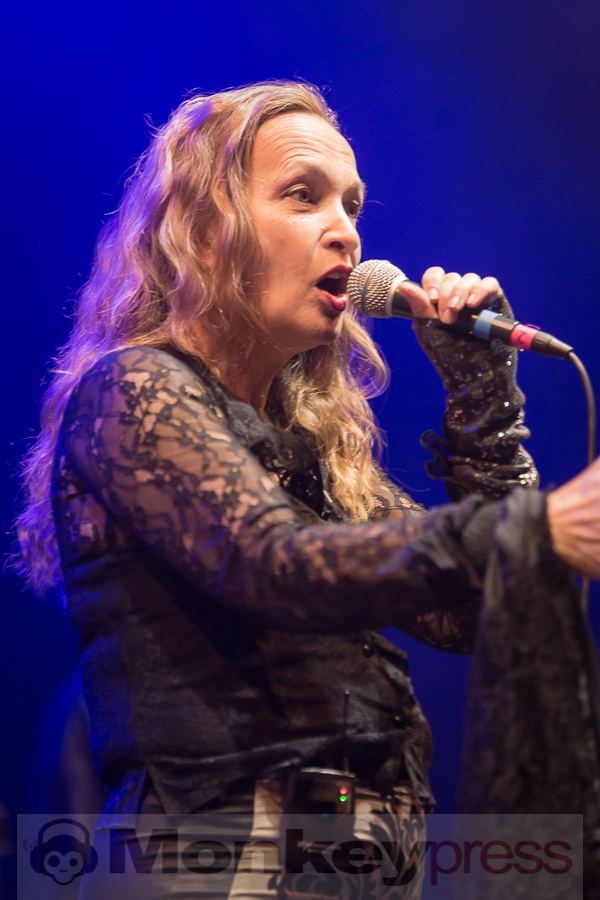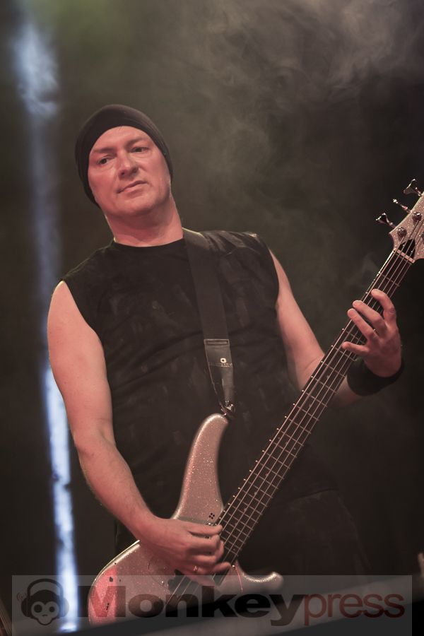 Große Bands finden ihren Weg in die Agra und so muss man, will man zwischen den Acts nicht die Location wechseln, gerade heute, gerade hier ständig und ganz empfindlich die Gefühle wechseln und sich auf abrupte Kehrtwendungen bei den präsentierten Genres einstellen. Mit über 30 Jahren auf dem Buckel und einer Besetzungshistorie, die sogar ein eigenes Organigramm hat, genießen Front Line Assembly im Spannungsfeld von EBM und Industrial Legendenstatus. Das letzte Album Echos hat für Bandverhältnisse auch schon wieder ein ziemlich hohes Alter erreicht, aber der Wahlkanadier Bill Leeb wird uns noch im Juni mit Warmech was Neues in die Regale stellen. Die Agra ist nach wie vor voll. Man merkt es den Leuten an, dass sie hauptsächlich wegen Front Line Assembly da sind. Alles fühlt sich nach der Vorwegnahme des heutigen Headliners unter einer Dunstglocke an. Hier haben vor allem Brillenträger und Fotografen ihre liebe Not. Die Show beginnt pünktlich mit einem gefühlt ewigen Intro, bei dem auf der Bühne erst einmal nicht viel passiert. An den Keyboards stehen zwei Musiker, alles wirkt etwas statisch und abgeklärt, auch der Drummer, der wenig später dazukommt ändert daran erst einmal wenig. Erst als der Meister selbst die Bühne betritt, wirkt die Show wie entfesselt. Bill Leeb, so scheint es, hat die letzten 30 Jahre einfach so an sich vorbeiziehen lassen, ohne sichtbare Spuren, dafür aber mit haufenweise hämmernden, sägenden Beats, harte Riffs und einer Setlist, an der man sehr gut das Repertoire dieser Zeit durchexerzieren kann. Der Chef lässt seinem Bewegungsdrang freien Lauf, was Dank der großzügigen Bühne auch möglich ist. Der Sound ist für Agra-Verhältnisse auch in Ordnung und die Elektroheads ganz aus dem Häuschen. Ja, was will man denn mehr? (DS)