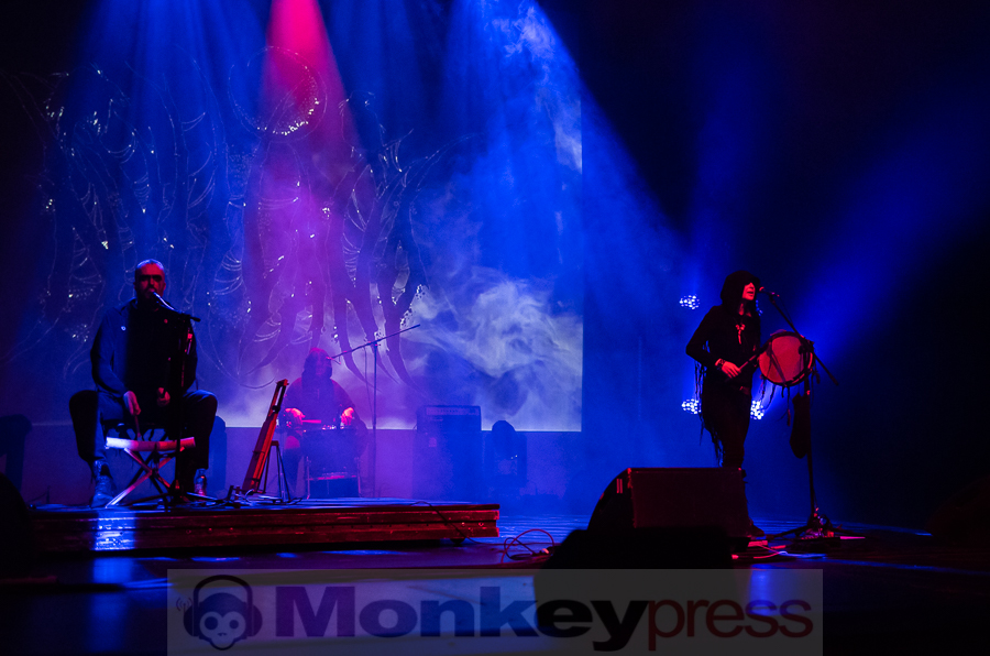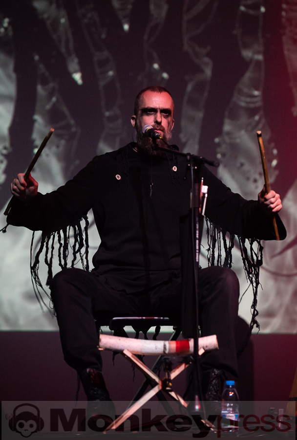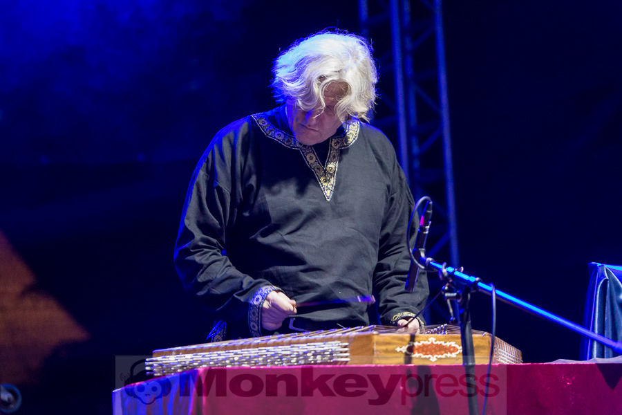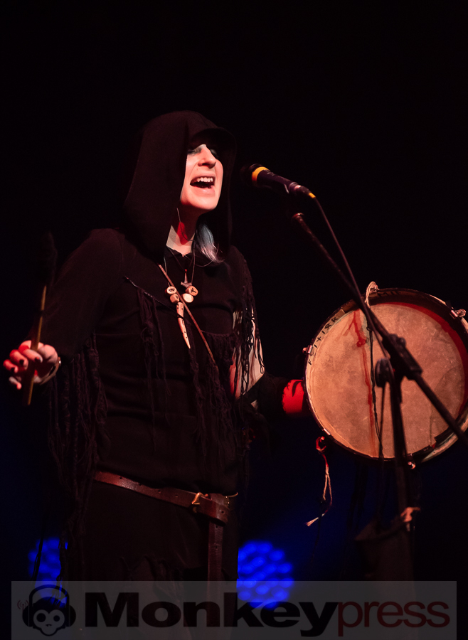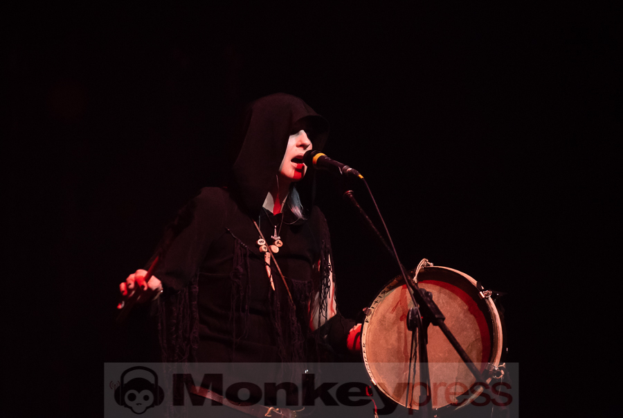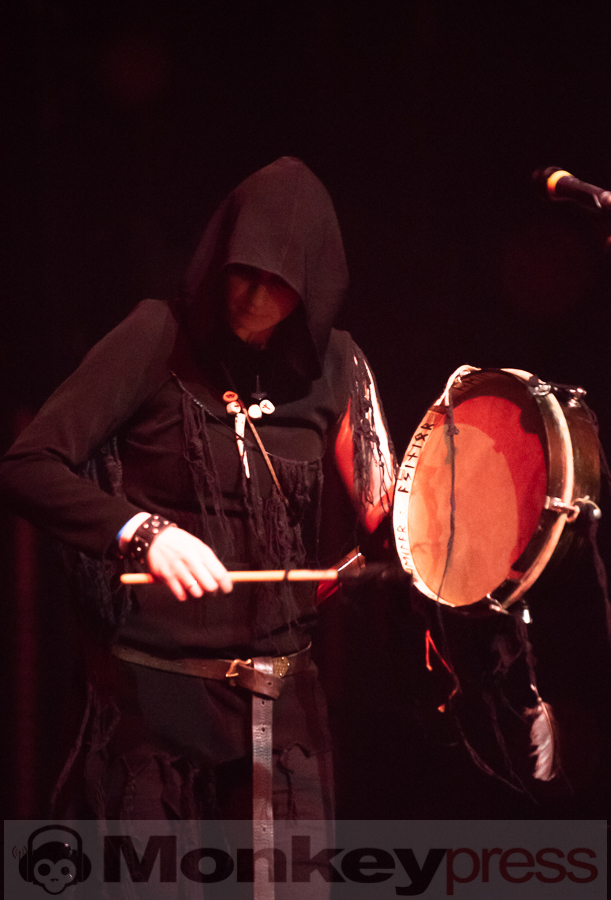 Aus dem Herzen von Sibirien kommen Natalia und Anatoli Packalenko, die zusammen das Projekt Nytt Land 2013 aus der Taufe gehoben haben. Nun ist es ja so, dass der Norden Europas, und das schließt Russland ja ein, über einen reichen Sagenschatz unserer Ahnen verfügt. Wie eng die Verknüpfungspunkte zwischen Sibirien und Skandinavien, dem Sagenschatz der Tundra und der Edda sind, versucht uns das Projekt aufzuzeigen. Und so gibt es handgefertigte und traditionelle Instrumente, archaische Lyrik mit archaischem Inhalt, schamanistische Arrangements, schamanistische Bühnenoutfits und Make-ups und ein Band-Logo im Black-Metal Design. Die Bühne ist finster und neblig, es wird hingebungsvoll auf Birkenäste geschlagen, entrückt mit den Augen gerollt und beschwörerisch werden die Arme gehoben. Beide Protagonisten singen zudem im mongolischen Obertongesang, ein zugegebenermaßen äußerst schwieriger Gesangsstil, der jedoch noch obendrauf im ganzen üppigen Gesamtkonzept von Nytt Land den Eindruck erweckt, dass hier zu sehr gewollt auf die eingetretenen Pfade des archaisch-schamanistischen, um Authentizität bemühten Pagan-Folk eingebogen wird. Das Publikum (viele werde ich später am Abend noch bei Wardruna wiedersehen) lässt sich gefangen nehmen vom Trommelschlag, den naturalistisch-treibenden und pulsierenden Klängen und zelebrierten Ritual auf der Bühne. Nichtsdestotrotz eine gute Einstimmung auf den Headliner heute Abend. Es gibt sogar standing Ovations. (KS)