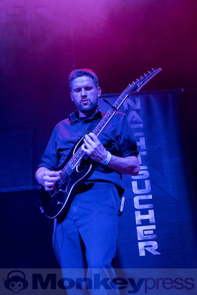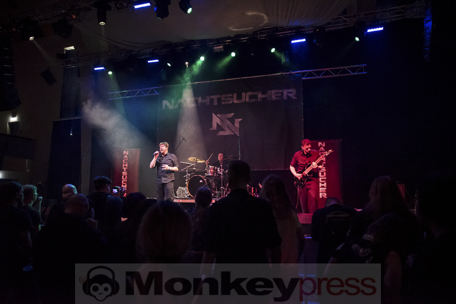 In der Ankündigung zum WGT wird von heroischen Synthi-Klängen gesprochen und bretthart-eingängigen Gitarrenriffs … und Gesang mit seelischen Abgründen … ich bin gespannt! Als ich im Westbad ankomme, ist die Halle schon fast halb voll. Für eine 17 Uhr Veranstaltung schon nicht schlecht. Pünktlich startet die Musik von Nachtsucher, jedoch den Sänger sucht man auf der Bühne vergeblich. Trotzdem ist Frontmann Christian Finks Gesang zu hören … Es ist eine Marotte von ihm, seine Show mitten im Publikum zu beginnen. Er performt den ersten Song Verlassen mitten unter den schwarzen Zuhörern. Die Ankündigung vom Gesang über seelische Abgründe ist gar nicht so abwegig, denn es nimmt einen schon ganz schön mit, wenn er von Such Nach mir über Angst und Komm mit mir singt. Christian erklärt zwischendurch, wie er seine Texte schreibt. Dass er oft Erlebnisse seines Alltags integriert und somit andere an seinem Leben teilhaben lässt. Die Besucher finden schnell Zugang zu seiner Musik, einige tanzen das gesamte Konzert hindurch und es wird auch kräftig Beifall geklatscht. Die Aussage des Sängers, dass er vor so vielen Leuten noch nie gespielt hat, macht ihn umso sympathischer und ich finde, das er sehr glaubwürdig seine Musik rüber bringt. (JBr)