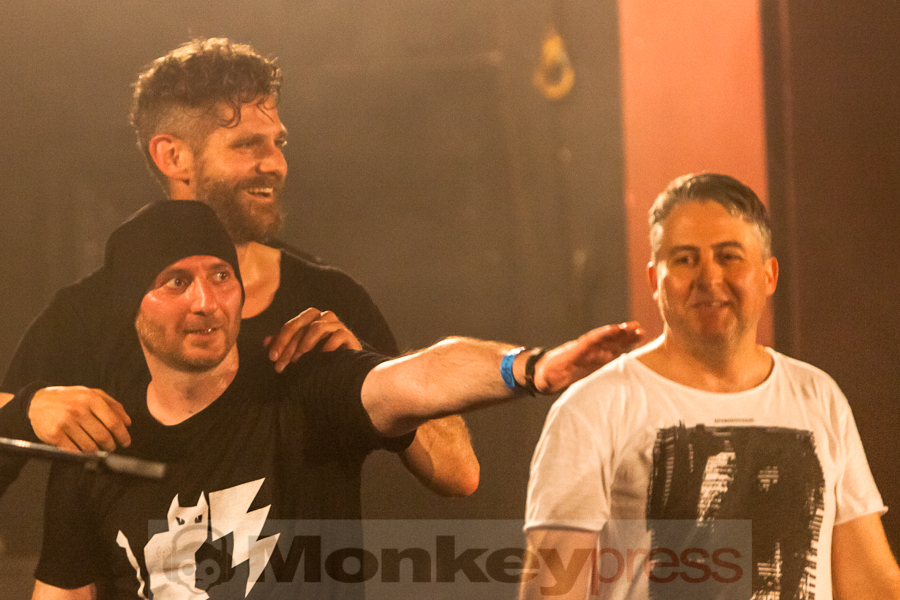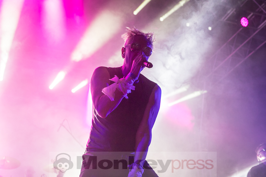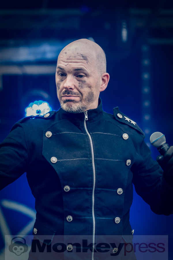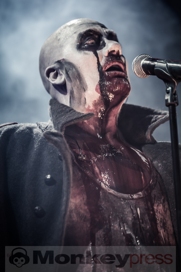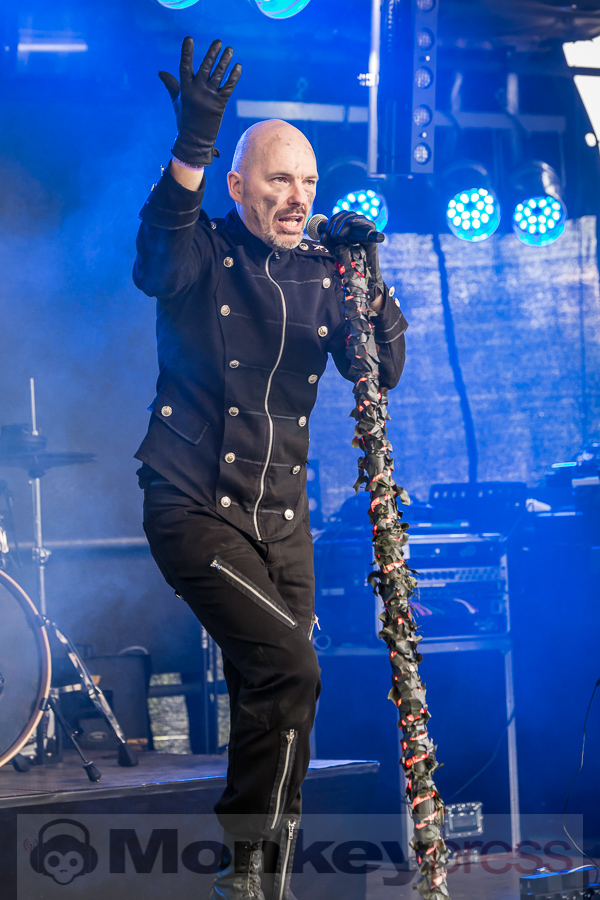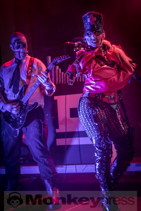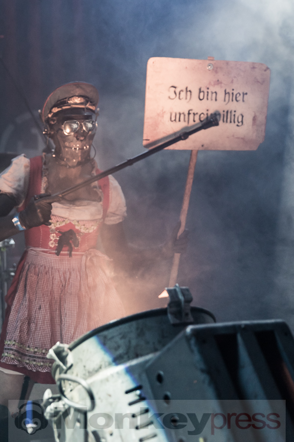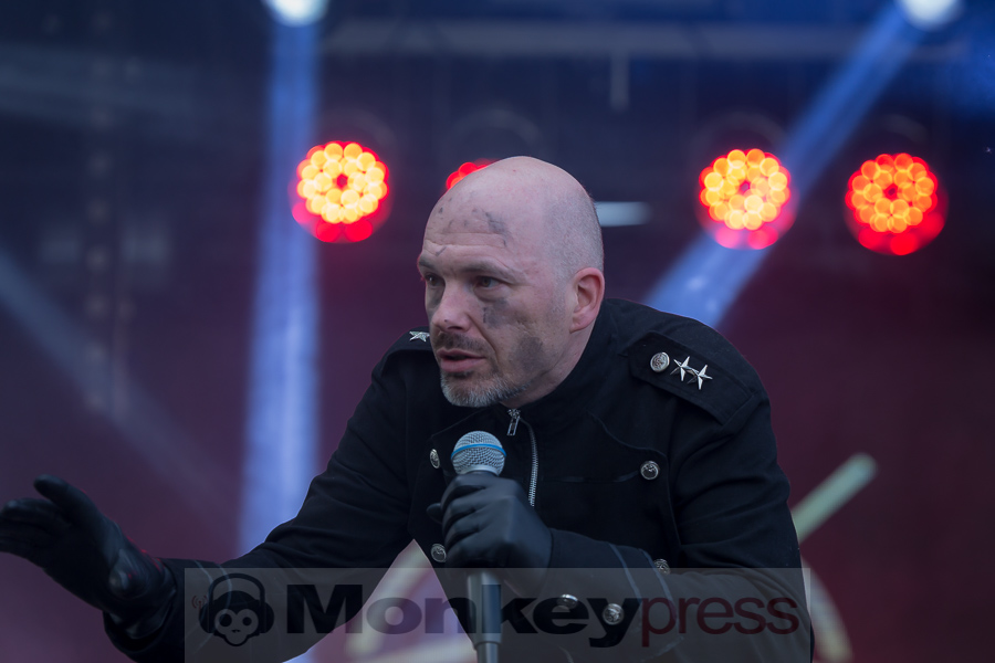 Ost+Front sind grad die zweite Band des Abends und schon ist es im Westbad passiert: lange Schlangen plus Einlassstop. Ja, was man sich wohl dabei gedacht hat, eine Band mit rund 35.000 Followern bei Facebook (alle ungefähr aus dem WGT-Besucher relevanten Bereich) in dieser knappen Location einzuquartieren. Das wird wohl später mancherorts eine nicht so erquickliche Nachlese geben. Umso besser ist die Stimmung bei uns im Westbad, denn die Berliner von Ost+Front werden von Anfang an als riesiger Act gefeiert. Als Band der so genannten Neuen Deutschen Härte, als deren Vertreter sie sich ja selbst auch sehen, setzen Ost+Front selbstverständlich sehr stark auf schockierenden, verstörende und provokante visuelle Effekte. Und so sieht Herrmann Ostfront wieder aus, wie ein Splatter-Metzger nach einer 16-Stunden Schicht. Beim ersten Song performt eine Tänzerin in Latex-Zwangsjacke und auch der Rest der Band, die Fleisch (!) als ihr Hauptinteresse nennt, hat sich wieder ordentlich am Horror-Military-Gewandungs Fundus bedient. Was soll man noch dazu sagen? Es geht ordentlich ab bei Ost+Front und den Applaus haben sie sich richtig erarbeitet, als sie zum Ende des Sets mit Marschmusik die Bühne verlassen. Bei der Zugabe fliegen Luftballons, die Stimmung ist furios, das Westbad kocht. Wie soll man das noch steigern? (DS)