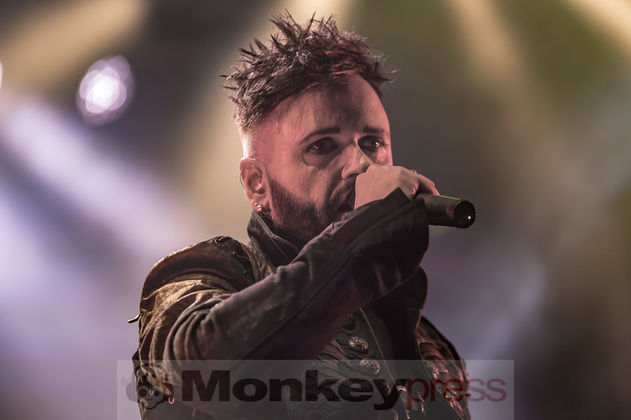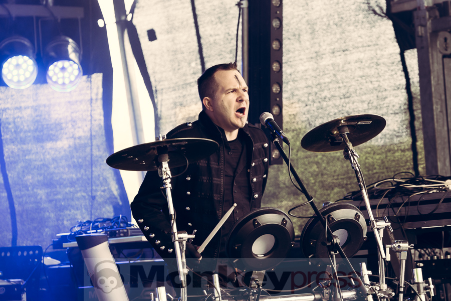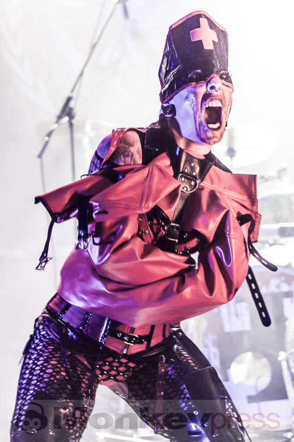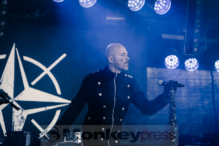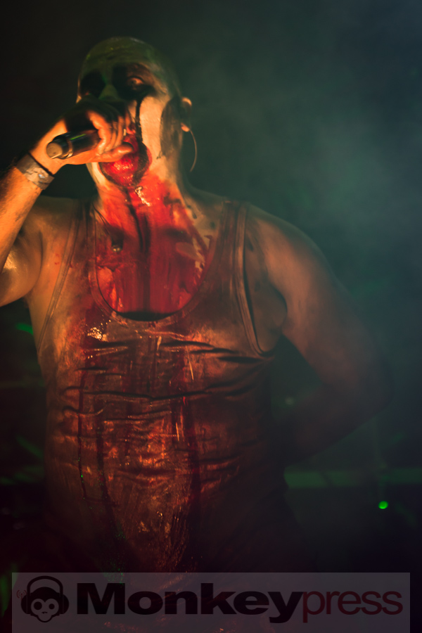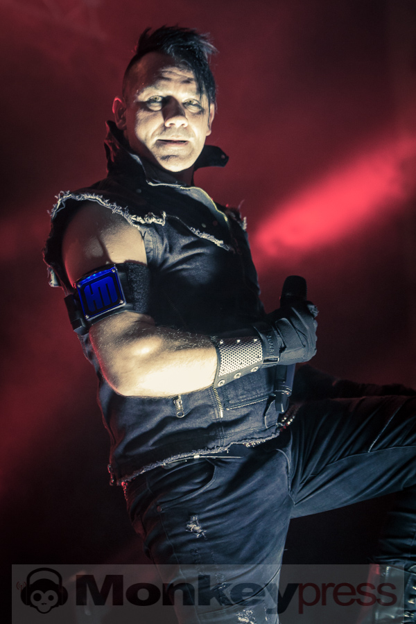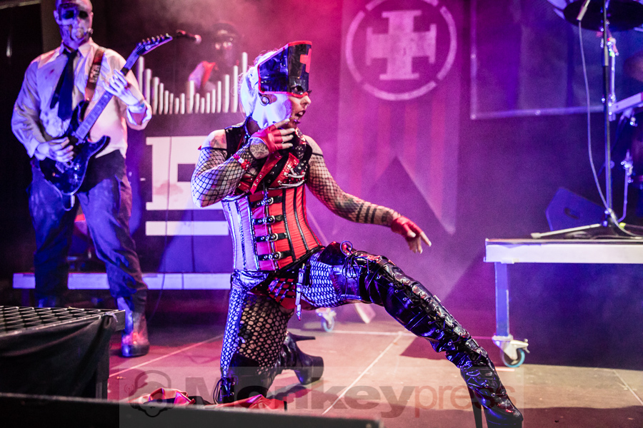 Ost+Front sind grad die zweite Band des Abends und schon ist es im Westbad passiert: lange Schlangen plus Einlassstop. Ja, was man sich wohl dabei gedacht hat, eine Band mit rund 35.000 Followern bei Facebook (alle ungefähr aus dem WGT-Besucher relevanten Bereich) in dieser knappen Location einzuquartieren. Das wird wohl später mancherorts eine nicht so erquickliche Nachlese geben. Umso besser ist die Stimmung bei uns im Westbad, denn die Berliner von Ost+Front werden von Anfang an als riesiger Act gefeiert. Als Band der so genannten Neuen Deutschen Härte, als deren Vertreter sie sich ja selbst auch sehen, setzen Ost+Front selbstverständlich sehr stark auf schockierenden, verstörende und provokante visuelle Effekte. Und so sieht Herrmann Ostfront wieder aus, wie ein Splatter-Metzger nach einer 16-Stunden Schicht. Beim ersten Song performt eine Tänzerin in Latex-Zwangsjacke und auch der Rest der Band, die Fleisch (!) als ihr Hauptinteresse nennt, hat sich wieder ordentlich am Horror-Military-Gewandungs Fundus bedient. Was soll man noch dazu sagen? Es geht ordentlich ab bei Ost+Front und den Applaus haben sie sich richtig erarbeitet, als sie zum Ende des Sets mit Marschmusik die Bühne verlassen. Bei der Zugabe fliegen Luftballons, die Stimmung ist furios, das Westbad kocht. Wie soll man das noch steigern? (DS)