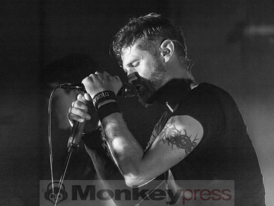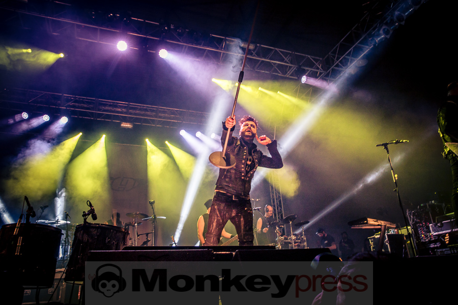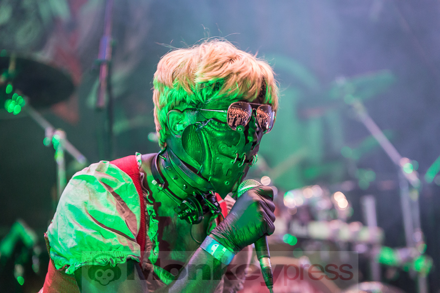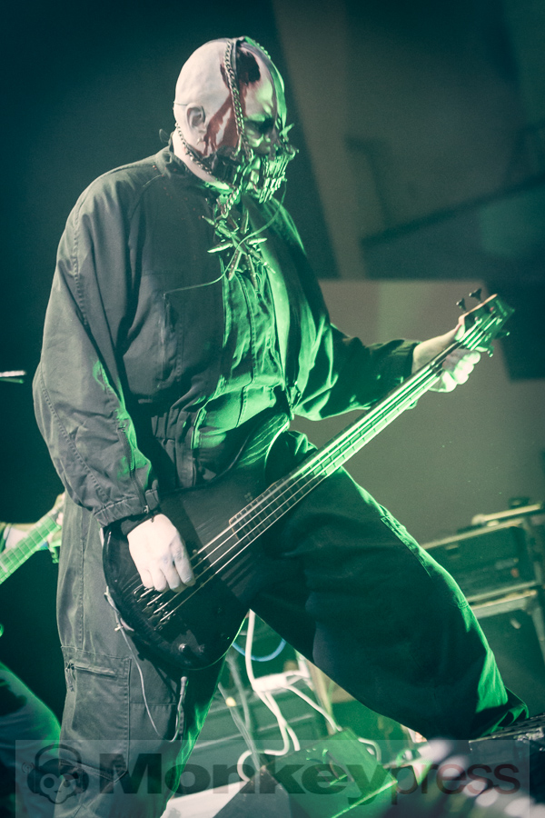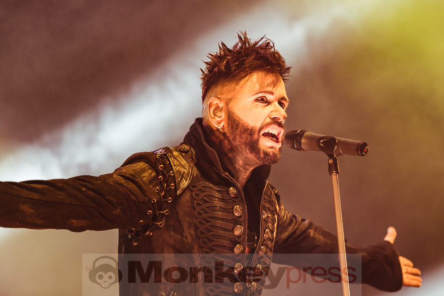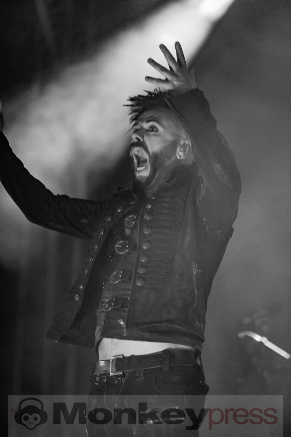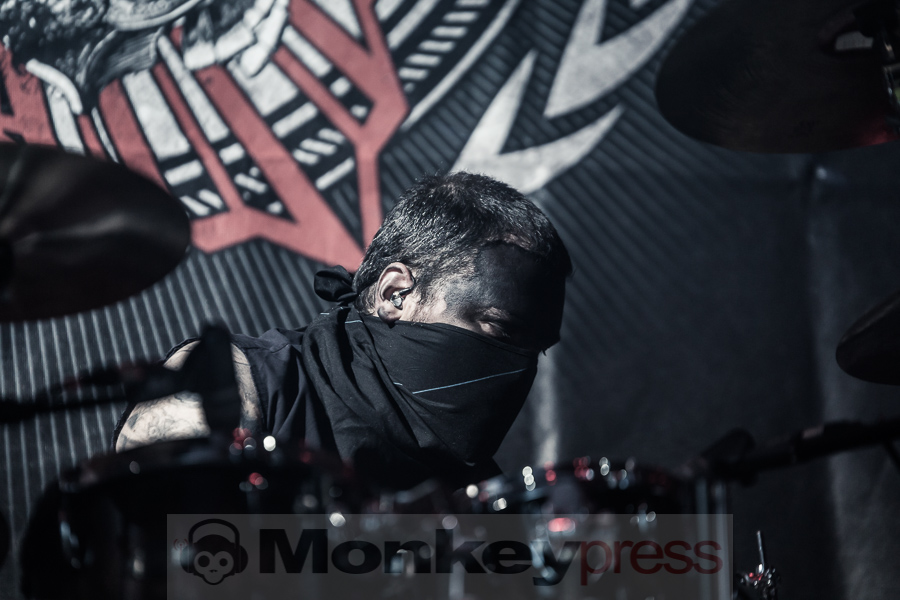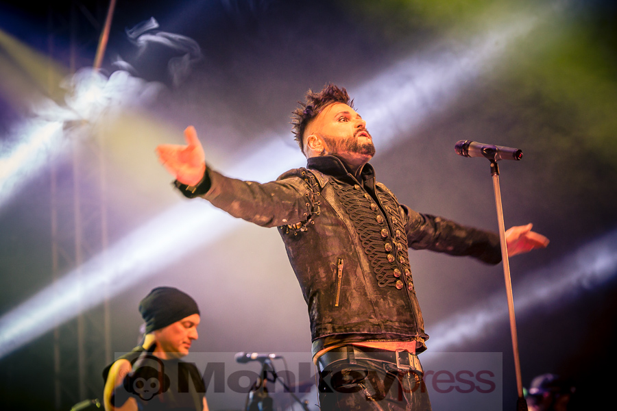 Ost+Front sind grad die zweite Band des Abends und schon ist es im Westbad passiert: lange Schlangen plus Einlassstop. Ja, was man sich wohl dabei gedacht hat, eine Band mit rund 35.000 Followern bei Facebook (alle ungefähr aus dem WGT-Besucher relevanten Bereich) in dieser knappen Location einzuquartieren. Das wird wohl später mancherorts eine nicht so erquickliche Nachlese geben. Umso besser ist die Stimmung bei uns im Westbad, denn die Berliner von Ost+Front werden von Anfang an als riesiger Act gefeiert. Als Band der so genannten Neuen Deutschen Härte, als deren Vertreter sie sich ja selbst auch sehen, setzen Ost+Front selbstverständlich sehr stark auf schockierenden, verstörende und provokante visuelle Effekte. Und so sieht Herrmann Ostfront wieder aus, wie ein Splatter-Metzger nach einer 16-Stunden Schicht. Beim ersten Song performt eine Tänzerin in Latex-Zwangsjacke und auch der Rest der Band, die Fleisch (!) als ihr Hauptinteresse nennt, hat sich wieder ordentlich am Horror-Military-Gewandungs Fundus bedient. Was soll man noch dazu sagen? Es geht ordentlich ab bei Ost+Front und den Applaus haben sie sich richtig erarbeitet, als sie zum Ende des Sets mit Marschmusik die Bühne verlassen. Bei der Zugabe fliegen Luftballons, die Stimmung ist furios, das Westbad kocht. Wie soll man das noch steigern? (DS)