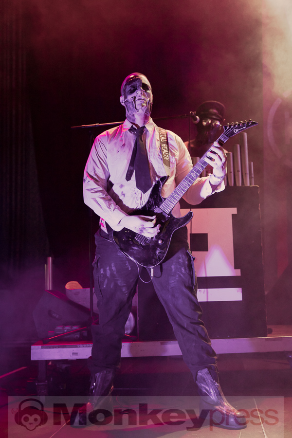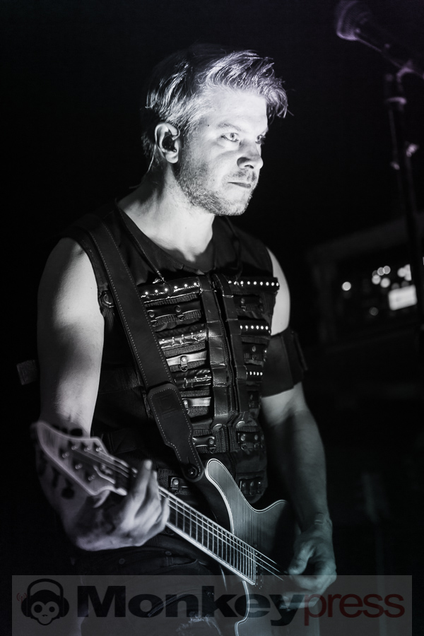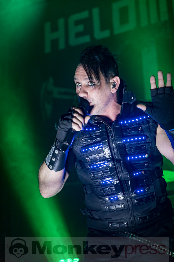 Ja, wie? Wir bleiben im Genre, auch das Westbad bleibt voll, wir bleiben beim Einlass-Stop. Heldmaschine fahren nicht ganz so viel Show auf, wie noch Ost+Front. Ein paar LEDs hier und da und farblich aufeinander abgestimmte Bühnenoutfits kommen erst einmal gegen das sich vorab ereignete Happening nicht an, wenn man im Grunde ähnliche Musik mit ähnlicher Attitüde macht. Man merkt in den ersten drei Liedern, dass die Koblenzer erst einmal ein bisschen schwer mit dem Publikum tun. Trotzdem haben auch die ihre Fans mitgebracht, die schließlich das Ruder zugunsten ihrer Band noch rumreißen können. Und Heldmaschine punkten darüber hinaus mit gutem, hartem Elektro-Heavy-Sound und gewohnt sympathischer Interaktion mit dem Publikum. Im Januar erschien die Compilation Live+Laut in Ton und Bild. Bei ihrem einstündigen Konzert kann die Band hierbei natürlich aus den Vollen schöpfen und den Besuchern eine wohl-sortierte Werkschau aus über sieben Jahren Bandgeschichte präsentieren. Insgesamt ein sehr solider Auftritt von Heldmaschine, der auch ohne viel Schnick-Schnack sein Ziel nicht verfehlt hat. (DS)