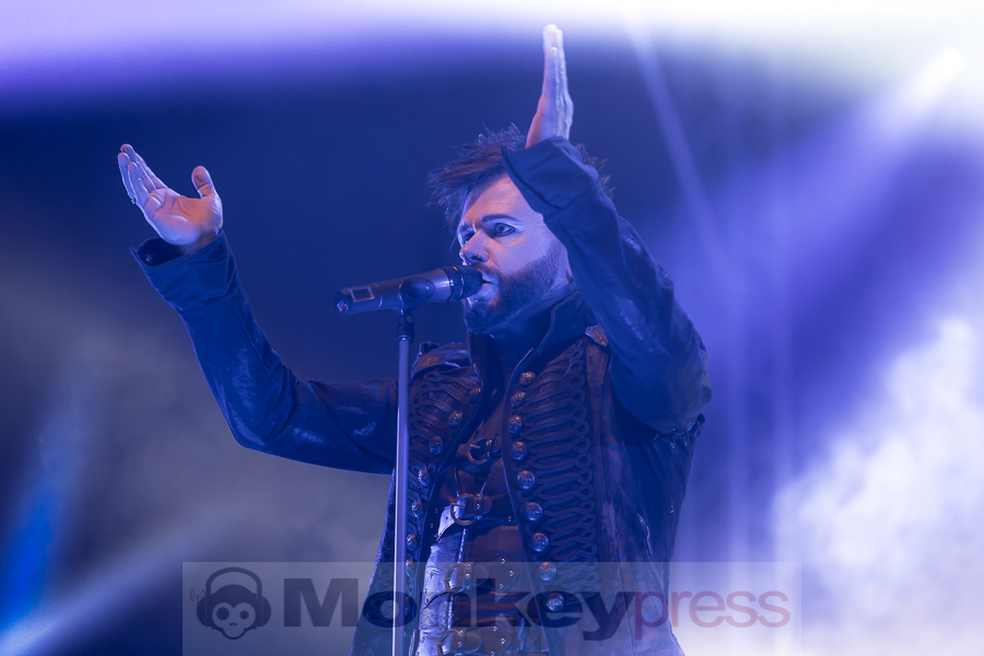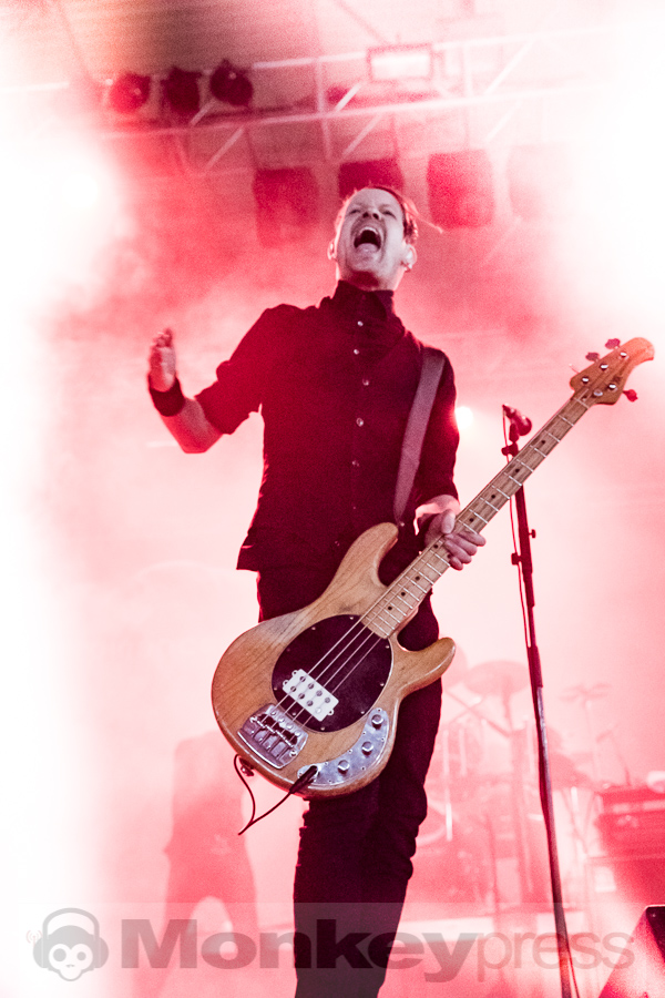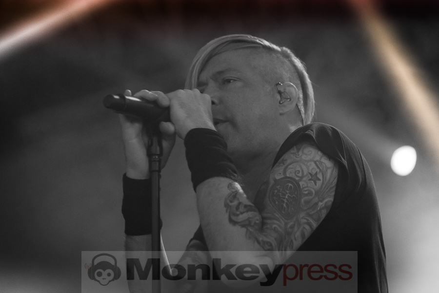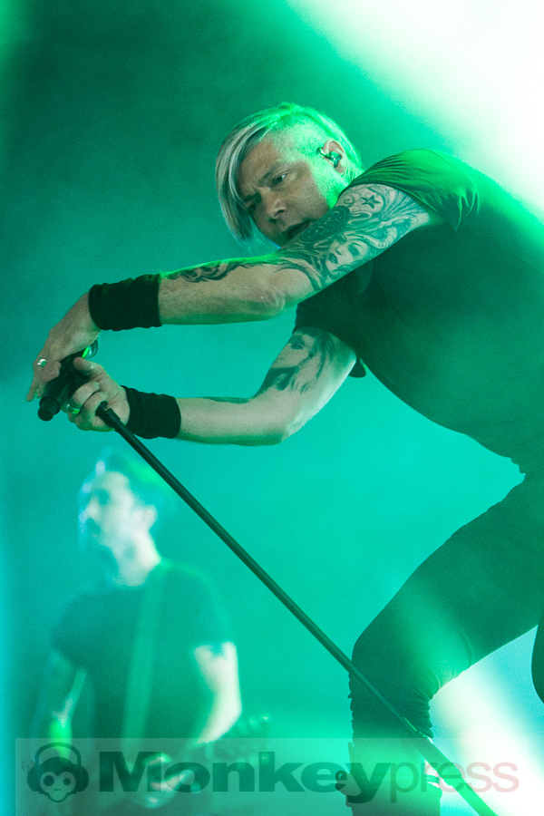 Dass man da noch eine ordentliche Schippe drauflegen kann, zeigen im Anschluss die Männer von Oomph!. Die kommen dann auch nicht einfach auf die Bühne, sondern lassen sich standesgemäß von Oliver Klein ankündigen. Klar, dass die Agra jetzt mit Mann und Maus voll besetzt ist und man trotz recht kühler Außentemperaturen bereits anfängt in seiner eigenen Ursuppe zu schwimmen. Vor allem in der ersten Reihe fällt ein recht hoher Anteil weiblicher Fans auf. Von Anfang an scheinen die Niedersachsen alle auf ihrer Seite zu haben und es fällt mal wieder auf, was für eine hervorragende Live-Band Oomph! über die Jahre geworden sind. An der ausgeklügelten Lichtshow, den gezielt eingesetzten CO2-Sprühern und allerlei anderem Equipment trennt sich eben der Underground vom Profi-Musiker. Vor allem Gero und Crap performen wie auch einem Guss und halten die Massen voll im Griff. Da können einige andere in die Lehre gehen, ganz klar, dass hier jeder mitfeiert. Spring Mit Mir ist dann auch so etwas wie ein kategorischer Imperativ, bei dem sich alle Fans angesprochen fühlen, die Arme empor reißen und wie wild drauf los hüpfen. Völlig verausgabt, aber glücklich werden wir in die Pause entlassen. (DS)