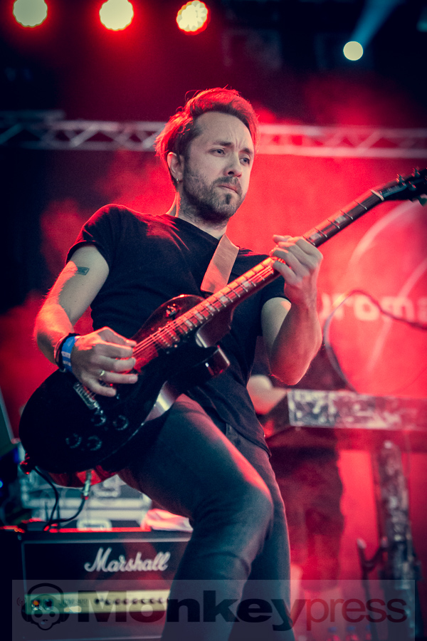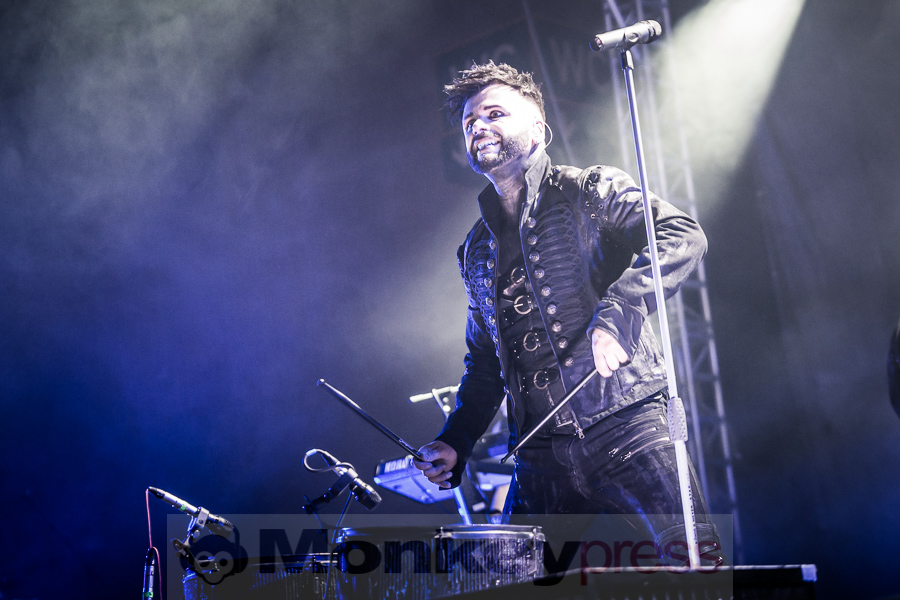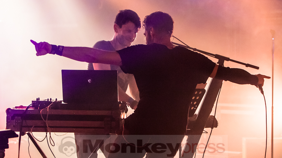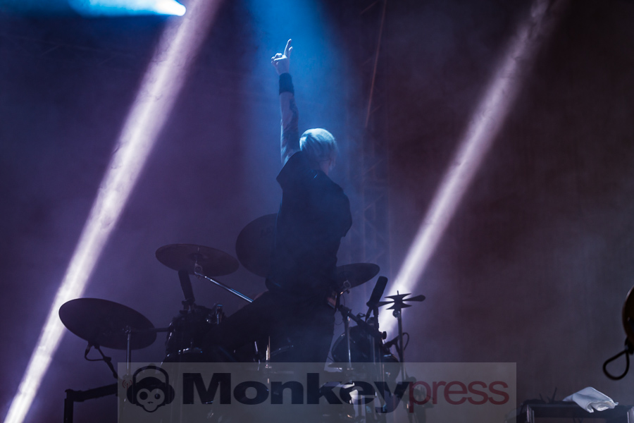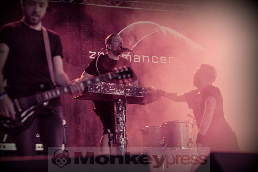 Kurz nach Einlass ist die Halle bereits sehr gut gefüllt, aber noch nicht über die Maßen voll. Betrachtet man das bevorstehende Line-up am zweiten Festival-Tag, tut ein wenig Luft nach oben ob der Kapazität der Räumlichkeiten auch gut. Zum Auftakt gibt es harten, giftigen Synth-Rock aus Norwegen. Bassist und Sänger Kim Ljung zählt wohl zu den am stärker beschäftigten Künstlern an diesem Wochenende, trat er doch tags zuvor noch mit den Seigmännern an gleicher Stelle auf. Hält man einmal kurz inne und überlegt, dass Zeromancer eigentlich nur ein kurzes Interims-Projekt für Seigmen gewesen war, dieses aber an Produktivität und Popularität bei weitem überflügelt hat, beginnt man allmählich an die unergründlichen Wege des Schicksal und die Unplanbarkeit kultureller Ausbrüche zu glauben. Eines ist auf jeden Fall unbestreitbar: Fans haben Zeromancer auf jeden Fall mitgebracht. Die stehen in der Agra von der ersten bis in die letzten Reihe und machen schon ab dem ersten Song ordentlich Stimmung. Auf der Bühne ist sehr viel Bewegung, die Band performt passend zu den harten, peitschenden Nummern äußerst extrovertiert. Sänger Alex Møklebust sucht dabei immer wieder den Kontakt zum Publikum. Demgegenüber, und doch ohne Widerspruch, stehen die Texte. Diese künden von negativen Emotionen und sind bis zum Rand gefüllt mit Verzweiflung. Soviel lässt sich raushören, der Rest ist, wie immer bei Zeromancer, ein riesiges Geheimnis. Ein sehr gelungener Auftakt hier in der Agra! (DS)
