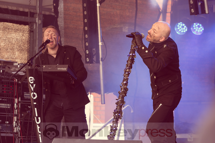 Am zweiten Tag des 27. Wave-Gotik Treffens sind wir recht früh auf dem Non Tox und man mag es kaum glauben mit einer Set-Zeit von 16:15 Uhr sind evo-lution hier bereits die vierte Band im Programm. Das startete bereits um die Mittagszeit mit Desastroes. Auf dem Non Tox hat man anscheinend einen Faible für die frühen Vögel. Jetzt steht eine Band aus dem pitoresken Niedenstein auf dem Plan, die nach eigenen Angaben Military Body Music machen. Warum wird selbst Leuten, die mit evo-lution noch nicht vertraut sind, schnell klar: es geht ziemlich zackig zu. Die Stücke sind oft martialische, of-beat Nummern zum „mitmarschieren“. Sie tragen Titel wie Magic Of A Gun und Stiefel Schritt. Im Non Tox ist es voll, aber nicht überfüllt. Die Atmosphäre ist angenehm gelöst, im Publikum ist wirklich alles vom Kind bis zum Greis vertreten. Die Band selbst scheint auch gut aufgelegt zu sein. Das merkt man sowohl an der Performance, der Interaktion mit dem Publikum, als auch daran, dass Sänger Klaus Schwarz zwischen den Songs gern mal ins Plaudern gerät, hier und da etwas zu den Stücken erzählt, ohne dass es störend wirkt. Performances aus dem Elektro-Bereich laufen ja Gefahr immer etwas statisch zu wirken. Die eine oder andere Band versucht mit verschiedenen Dingen, diesem Eindruck entgegenzuwirken. Die Mitglieder von evo-lution haben diesbezüglich eine congeniale Idee: Sie stellen ihren Drummer Micha Meyer, der sowieso schon im Stehen performt, auf eine Art Trampolin (Oder Leute was war das?). Über das ganze Set hüpft dieser im Takt der Beats wie ein verrückt gewordener Springball. So viel Energie haben die Leute gebührend gefeiert. (DS)
