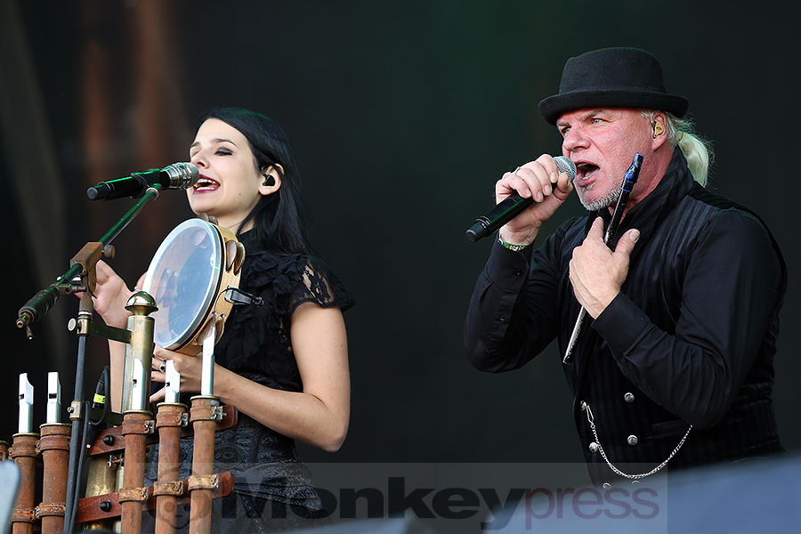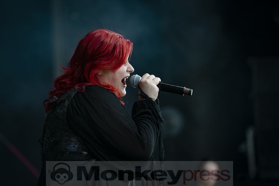 Schnell raus, denn einer der sicherlich eingesessensten Szene-Acts stand auf der Hauptbühne und konnte sich auf eine große Fanbase verlassen. L’âme Immortelle spielten auf und präsentierten eine bunte Mischung ihrer Karriere. Mit dem sich langsam aufbauenden Unendlich angefangen war direkt darauf Tiefster Winter – und das bei sommerlichen Temperaturen… Druckvolle Gothic-Sounds, Gesang zwischen Härte (Thomas Rainer) und Gefühl (Sonja Kraushofer) und ein abwechslungsreiches Set sorgten für Begeisterung. Natürlich, wer in der Band zu viel Klischee sieht, wird auch bei diesem Auftritt seine Meinung nicht geändert haben, bei den anderen aber kamen Titel wie Fallen Angel, Es tut mir leid, Phönix wie auch das abschließende 5 Jahre hervorragend an. Was manch einer vermisst hat, war Bitterkeit. Aber so ist das nun mal beim Festival: Die Spielzeit ist eben begrenzt. Das schwächt den Gesamteindruck keineswegs.