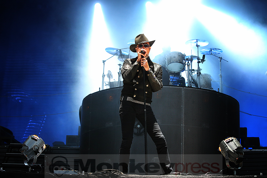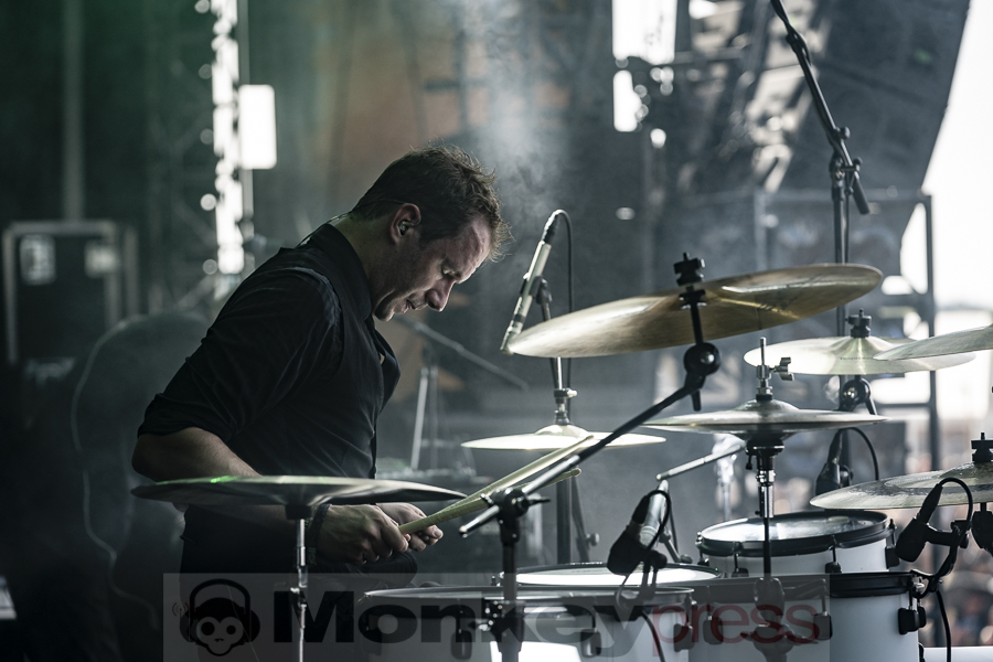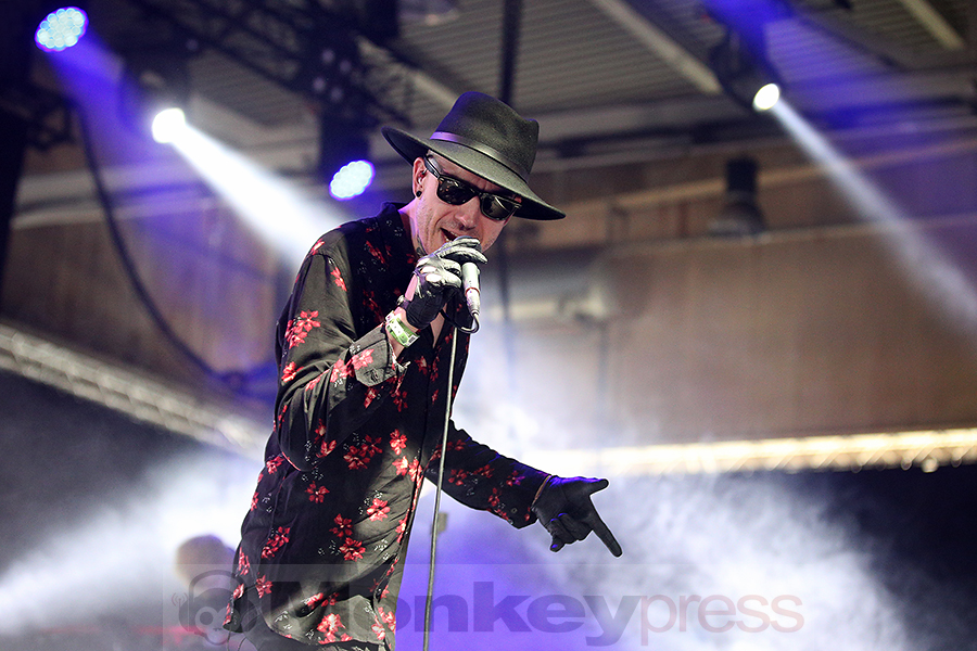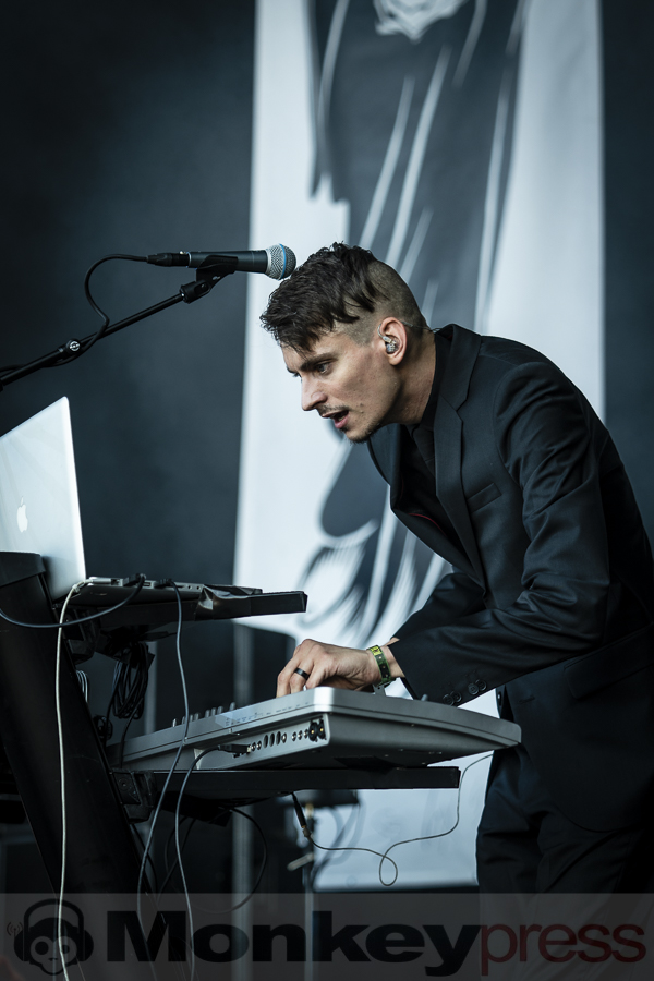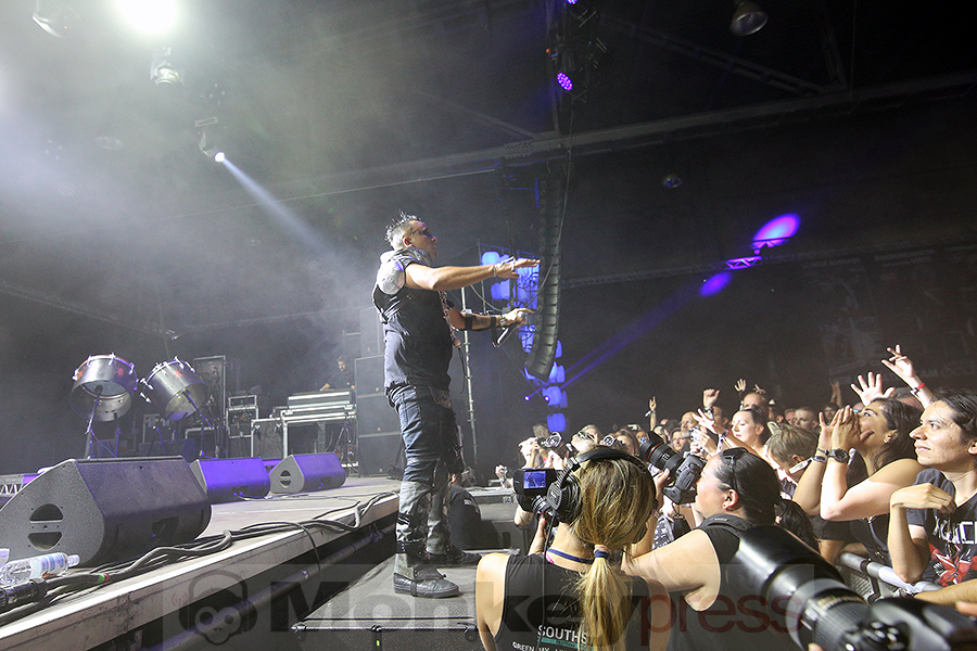 Draußen war indes mit Front 242 bereits der Co-Headliner aktiv und zeigte, dass EBM längst nicht tot ist, wie seit so vielen Jahren immer wieder geunkt wird. In Live-Besetzung mit Synthesizer, Schlagzeug und wie gewohnt zwei Sängern auf der Bühne gaben sie eine Stunde lang ihrer Klassiker zum Besten und sorgten immer wieder für Begeisterung. Schon früh ist die Stimmung bei Stücken wie Body To Body sehr gut und der Flughafen wurde erneut zur überdimensionalen Tanzfläche. Dabei verstand es die Band auch immer wieder gut, das Publikum zu animieren und trotz der riesigen Menschenmenge ein Gefühl entstehen zu lassen, nah am Fan zu sein. Der Blickkontakt wurde gesucht und gefunden, Band und Publikum feierten gemeinsam. Wenn man dazu noch Klassiker wie Moldavia, Funkahdafi und natürlich Headhunter im Gepäck hat, kann da gar nichts schiefgehen bis hin zum furiosen Finale mit Welcome To Paradise.