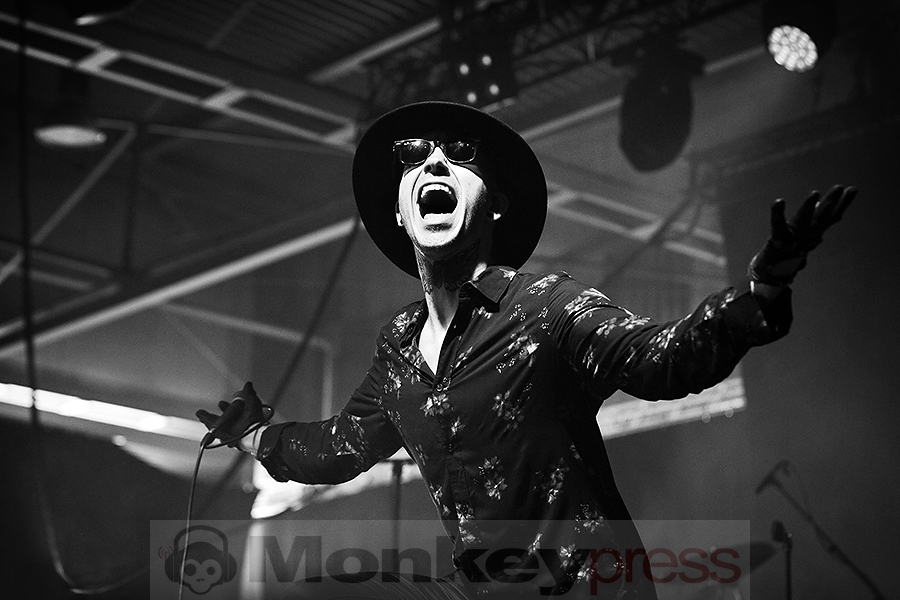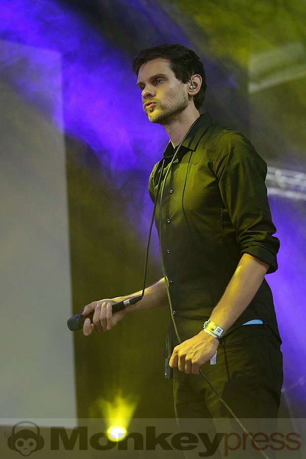 25 Minuten Umbau und weiter ging es mit Frozen Plasma. Vasi Vallis wie gewohnt hinter seinen beiden Notebooks, Felix Marc hingegen dabei, die Bühne in seiner Größe gut auszunutzen. Und vor ihnen: Ein gut gefüllter Hangar, der dazu führt, dass auch zahlreiche Zuschauer die Show draußen vor der Leinwand verfolgten. Zurecht, denn es war eine wirklich gute Show mit Stücken wie Saving the moment, Maniac, Living on video oder auch Tanz die Revolution. Ob es nun die Revolution war, die getanzt wurde: Nicht nur Sänger Felix Marc war stets in Bewegung, getanzt wurde ausgiebig und ausdauernd. Da haben die beiden in ihrer Dreiviertelstunde Spielzeit bis hin zu Murderous trap alles richtig gemacht.