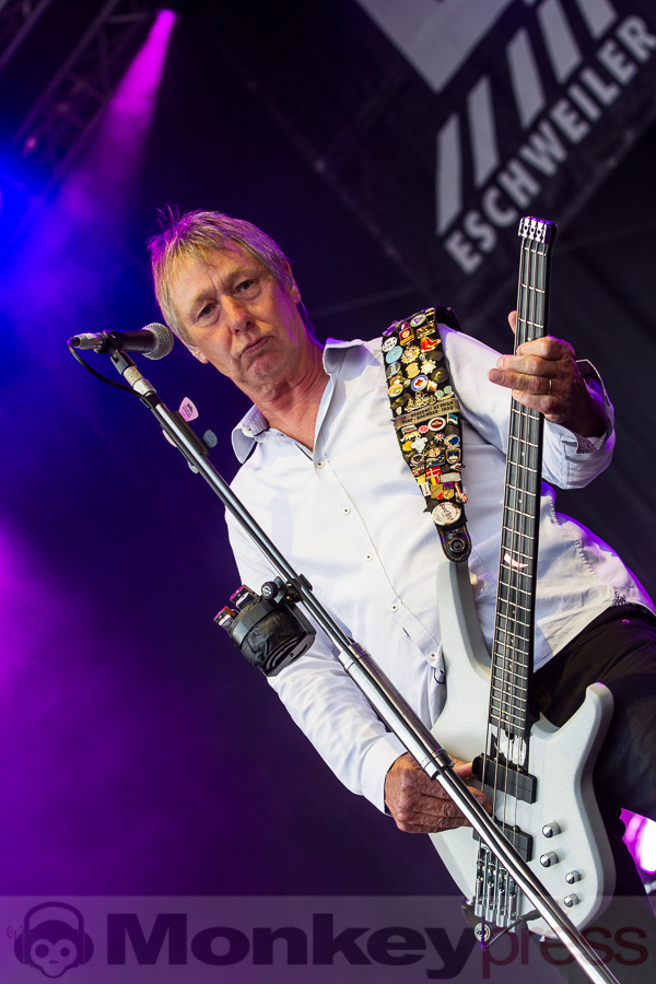 Doch die Fans nehmen es äußerst gelassen, denn die entlang stehenden Bierbuden, aber auch Restaurants und sogar ein Eiscafé erleichtern das Verweilen ungemein. Auch scheint die Freude zu überwiegen, Status Quo überhaupt noch live erleben zu können, denn eigentlich hatten die ja nach der Akustiktour beschlossen, mit dem Touren aufzuhören. Und hier bekommen sie sogar ganz bewusst einen Plug-in Gig geboten. Und ja, natürlich sind sie älter und wirken nicht mehr so spritzig und rocken nicht mehr in dem Tempo wie früher. Aber ist das schlimm? Der Stimmung auf dem Marktplatz tut dies keinen wirklichen Abbruch. Auch dass der Gitarrensound sich durch den Tod von Rick Parfitt verändert hat, ist in Eschweiler eher eine Randnotiz wert. All das ist zwar spürbar. Jedoch von Defiziten zu sprechen, ginge zu weit. Parfitts Nachfolger Richie Malone ist langjähriger Weggefährte von Status Quo und  scheint inzwischen angekommen in der Band.