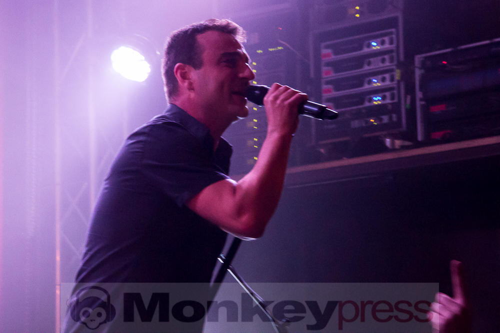 Nach einem mystischen Intro starten Melotron den Abend mit Alles auf Anfang vom aktuellen Album, das irgendwie auch als Motto für die ganze Sache zu gelten scheint. Frontmann Andy Krüger bewegt sich zwar immer noch, genau wie damals, wie ein Abziehbild von Oberelectrofrontmann Dave Gahan in seiner besten Zeit, wobei Andy es heute anscheinend viel lockerer sieht, als in den vielen Jahren davor. Gesten, Mimik, Lederjacke und selbst die Hand am Mikroständer sehen heute viel cooler aus, als beim großen Vorbild. Und schnell macht sich Andy Krüger auch los von diesen Fesseln. Spätestens mit Ablegen der Jacke zu Gib mir alles ist er frei und lässt sich mehr gehen als ich es in Erinnerung hatte. Der Mann da oben auf der Bühne hat Spaß und ist verdammt gut vorbereitet auf den Abend. Texthänger wie früher? Fehlanzeige! Andy Krüger ist da angekommen, wo ich ihn mir seit vielen Jahren gewünscht hatte. Früher war es auf der Bühne für mich eher so, als würde Krüger alles, was Edgar Slatnow und Kay Hildebrandt mit ihren Maschinen aufbauten, mit seiner naiven Trampeligkeit auf der Bühne wieder umreißen.
