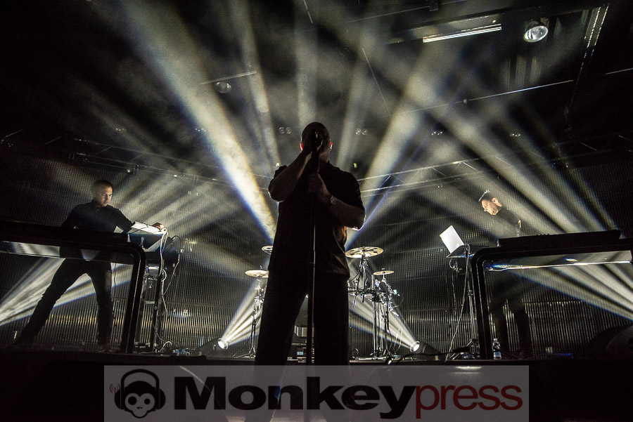 Plötzlich wird es wieder dunkel. Ein Spot durchbricht die Dunkelheit und dort steht der Mann der Stunde: VNV Nation Fronter Ronan Harris. Mit großem Jubel wird er begrüßt, während er schon mitten im ersten Stück ist. Passend zur Noire Tour ist der Opener des neuen Albums zugleich der Opener des Abends und stellt direkt die Weichen für den heutigen Abend – es wird düster – es gibt Gänsehaut – und es gibt tanzbare Beats. Perfekt mit einer ausschließlich weißen Lichtshow untermalt, wirkt der Song einfach absolut großartig. Anschließend weist Ronan, wie bei ihm schon fast üblich, alle Besucher darauf hin, bei ihren Handys den Blitz auszuschalten um keinen zu stören und selber bessere Bilder zu bekommen. Dabei betont er mehrfach, dass er das nicht böse meint. Ein Grund hierfür ist aber auch die überwältigende Lichtshow, die dadurch massiv gestört werden würde. Das Bühnenbild selbst ist recht simpel gehalten. Nur Keyboards und ein Schlagzeug. Mehr ins Auge fallen die großen LED Wände hinter den Musikern und die restlichen Strahler neben der Bühne, welche für die Lichtshow verantwortlich sind.