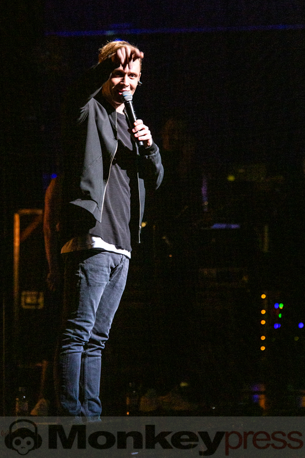 In akustische und visuelle Regentropfen gehüllt, gab Matthias, nunmehr alleine auf der Bühne, Regen zum besten. Mit Hintergrundfotos von Sam Wieland, einem kürzlich verstorbenen Songschreiber und Freund von Matthias Schweighöfer, stimmte dieser den mit Sam geschriebenen Song Auf uns Zwei an. Beim nachfolgenden Stück rappte Schweighöfer zusammen mit dem Gitarristen los, überhaupt bindet er seine achtköpfige Begleitband immer wieder über den Abend hinweg mit ein. Auch wenn er im wortwörtlichen Rampenlicht steht, ist die Band nicht nur für die Hintergrundmusik zuständig, da Matthias selbst nicht als begnadeter Sänger durchgeht und den Abend alleine eher nicht tragen könnte. Durch die großartigen Musiker, die er um sich herum versammelt hat wurde das Konzert aber zu einer soliden Leistung und überraschte mich durchaus positiv. Für einen ersten Konzertabend der Tour vor rund 1.000 Gästen gibt Matthias einen guten Entertainer und Unterhalter, jedoch musikalisch wäre das durchaus noch ausbaufähig.