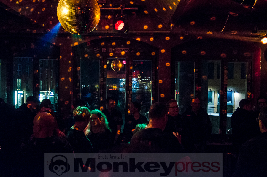 Angenehm ranzige Anarcho-Punkkneipen-Attitüde und den Blick aus dem Fenster – auf den beleuchteten Hamburger Hafen. In dieser Atmosphäre finden sich eine Menge Menschen ein, um die 80er-Jahre-Wave-Helden No More zu erleben, die seit einigen Jahren (wenn auch deutlich dezimiert) wieder mit alten wie neuen Songs touren.