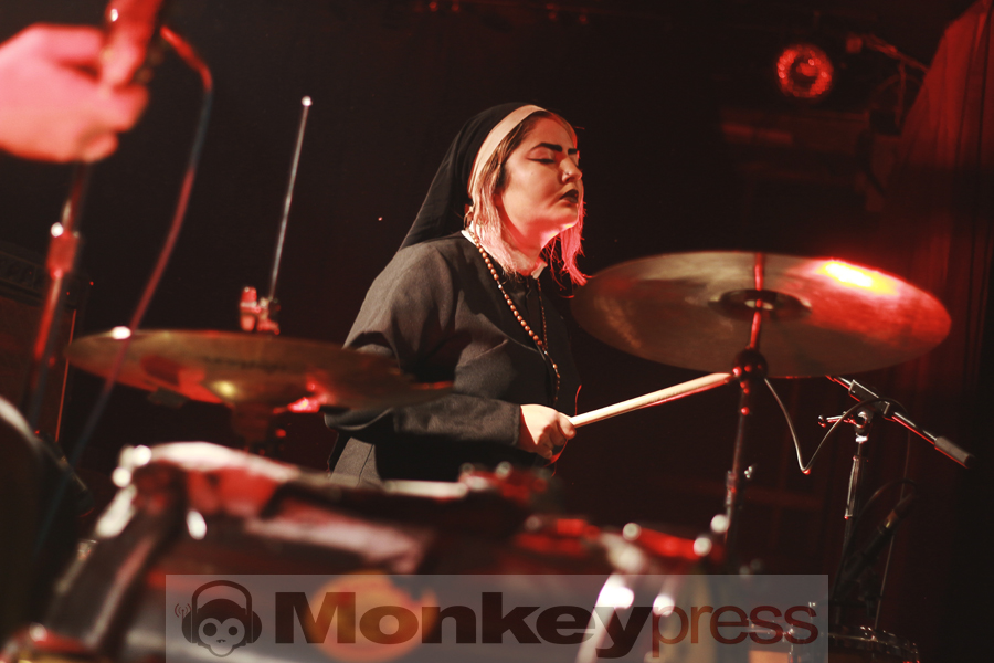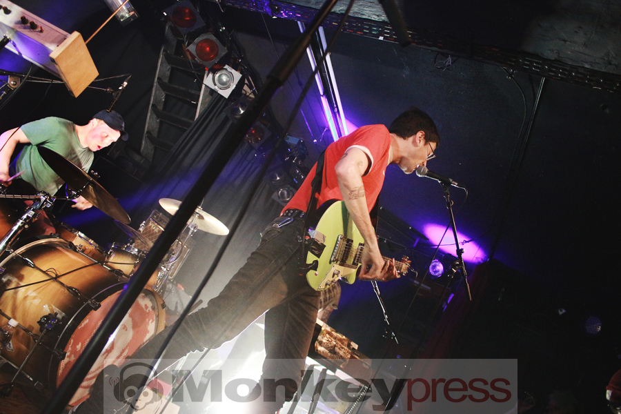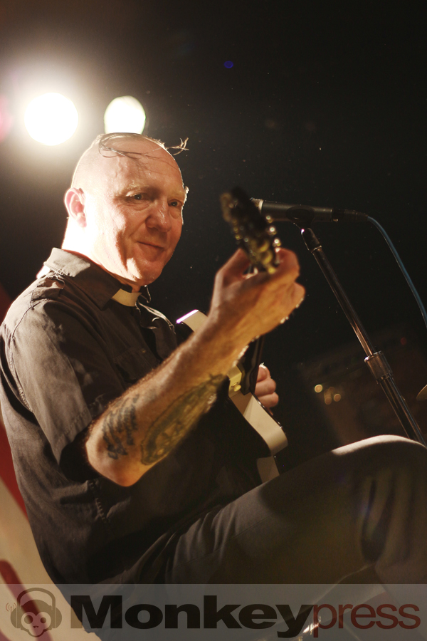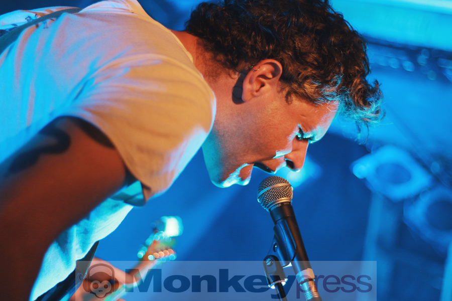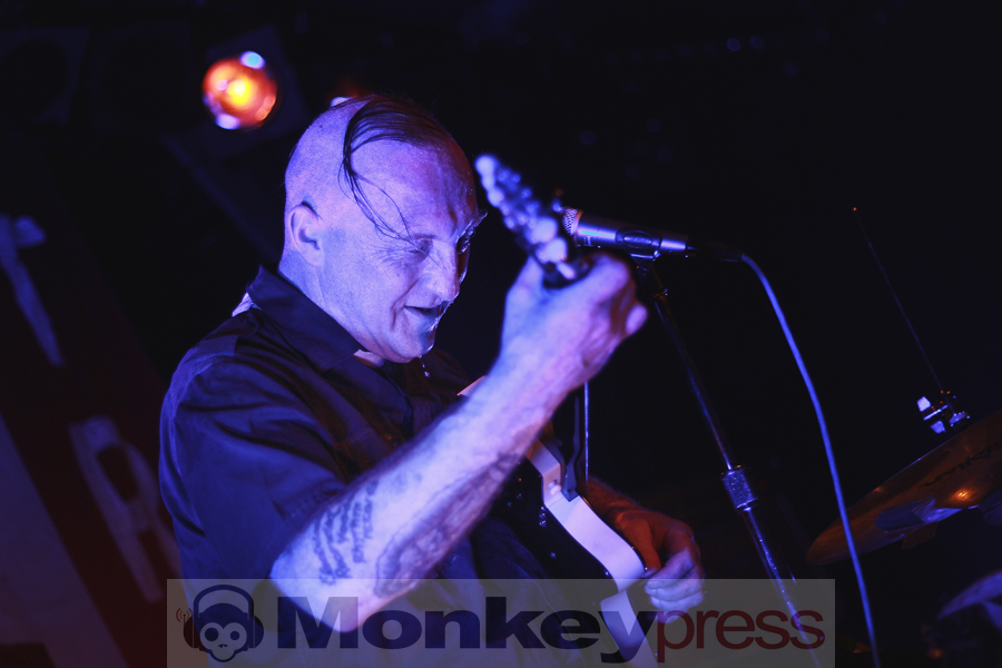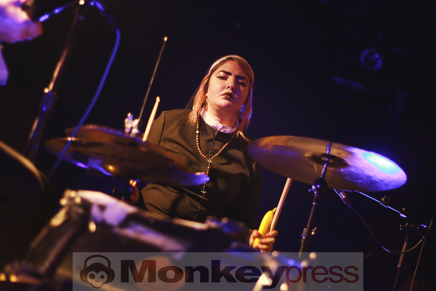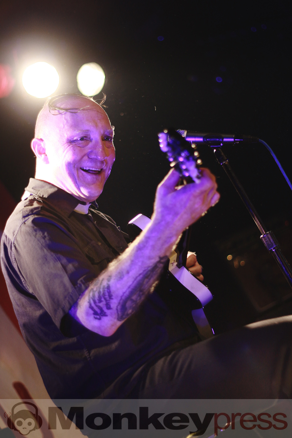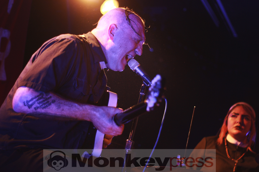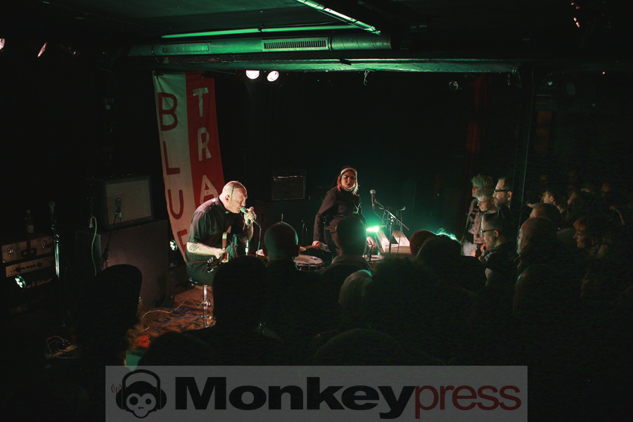 Wenige Umbauminuten später, die eher Aufräumminuten glichen, leuchtete die Bühnenplattform im sparsamen Licht des Reverend Beat-Man. Im Hintergrund thront das etwas zu lange „Blues Trash“-Banner, das Intro läuft, der Herr zeigt sich als Gentleman, in dem er der charismatischen Izobel Garcia den Vorhang zur Seite hält. Der Moment wirkt und beide nehmen vor ihren Instrumentarien Platz. Der gutgelaunte Frontmann melodisiert mit seiner Klampfe, die Schöne schlägt, all das vor der Kulisse einer zappelnden Menge. Er witzelt, widmet seiner Vorgruppe nicht nur Wertschätzung, sondern auch einen Song. Die Energien, diese hitzige Spielfreude machen klar – der Reverend hat den Rock’n’Roll mit Löffeln gefressen.