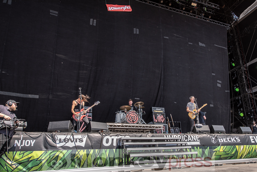 Ist es nicht etwas komisch, wenn man auf dem Hurricane morgens von der Sonne und nicht vom Regen geweckt wird? Noch seltsamer wird es dann, wenn man die ganzen roten Stellen auf der Haut entdeckt, die wohl etwas zu viel in der Sonne gebadet haben. Heute dann mal etwas mehr Sonnenschutz auftragen und ab vor die Bühne wo die Bands samt Sonne bereits auf uns warten.
