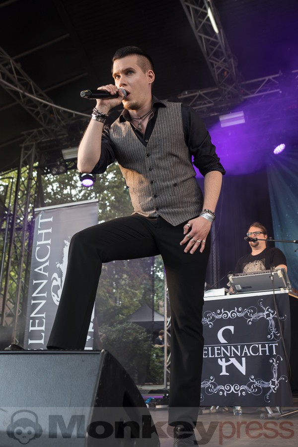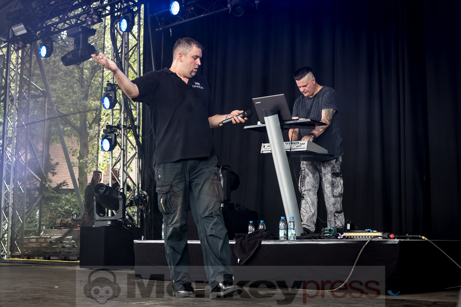 Los ging’s bei schon recht ordentlicher Besucherzahl wie gehabt am Samstag um 11 Uhr mit dem Projekt Seelennacht. Frontmann und Songschreiber Marc Ziegler kombiniert Joachim-Witt-esqen Gesang mit Blutengel-esqen Instrumentals – muss man mögen, mochten viele und sorgten so für das erste Stimmungshoch des Tages. Deutlich gitarrenlastiger der Auftritt von Erdling, vor allem der letzte (und wohl auch bekannteste) Song Blitz und Donner wurde laut mitgesungen und frenetisch bejubelt. Danach standen auf der Main Stage wie auch im Theater bei Logic & Olivia, Chrom und Massive Ego elektronische Klänge im Vordergrund. Letztere konnten im Theater deutlich mehr punkten als noch vor zwei Jahren als Hauptbühnen-Opener, vor allem das And-One-Cover Military Fashion Show ist und bleibt ein Garant für euphorische Reaktionen.