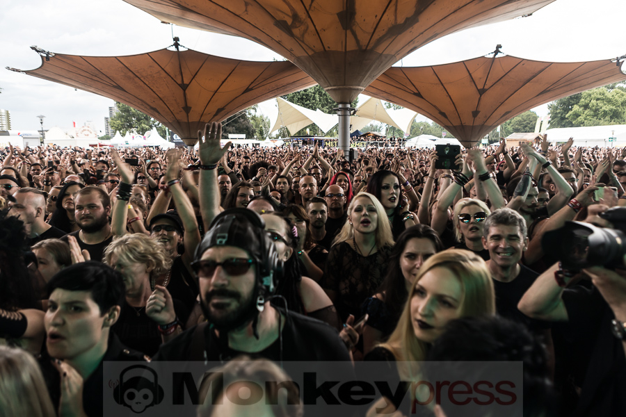 Die „sonnigste Band der schwarzen Szene“, wie es Frontmann Chris Pohl scherzhaft formulierte, stellte ihr Set ins Zeichen der noch recht frischen LP Un:Gott. Da die sich musikalisch aber nicht allzu sehr von den Klassikern abhebt, war die Stimmung von Beginn an euphorisch. Auch in Sachen Bühnenshow boten die Berliner mal wieder einiges: Viele Laser, Videos, Kostüme – und drei leicht bekleidete junge Damen, die es sich nicht nehmen ließen, zwischendurch mit Pohl, Keyboarder Lukas und nicht zuletzt sich selbst herumzuknutschen.