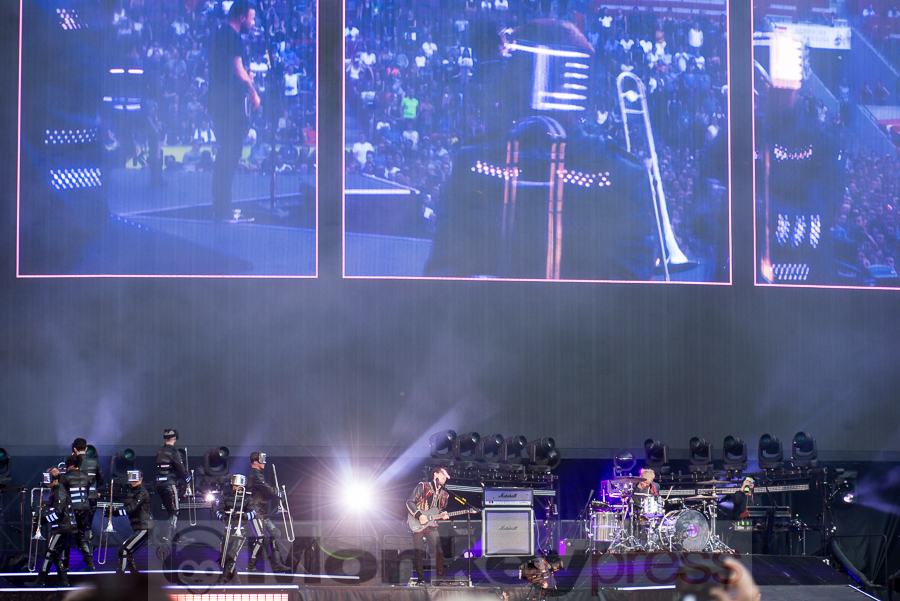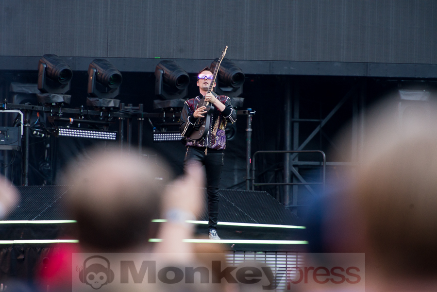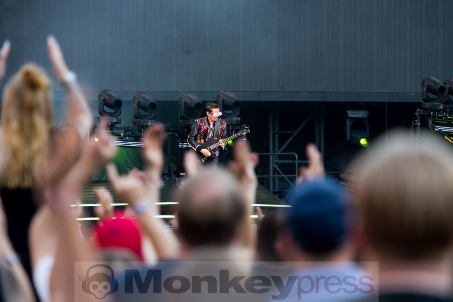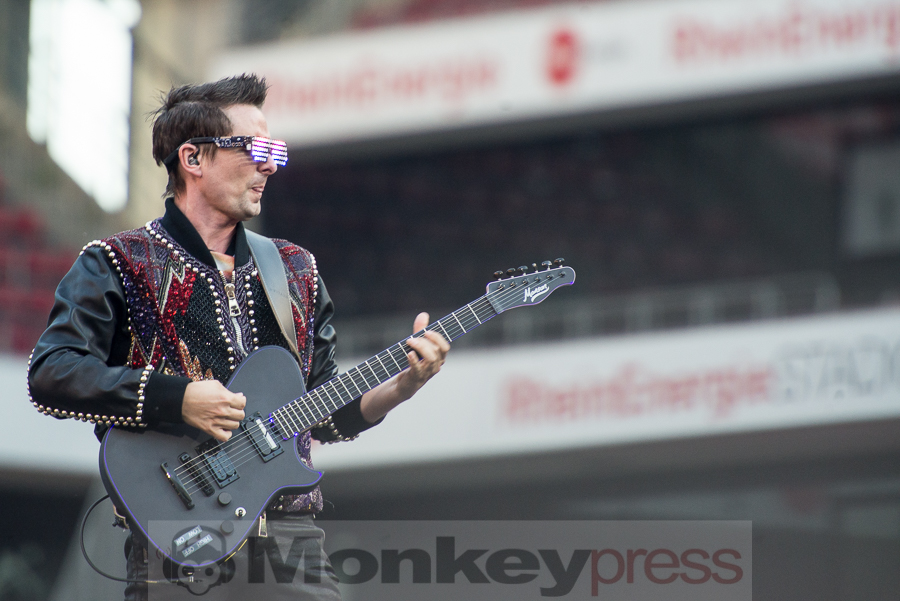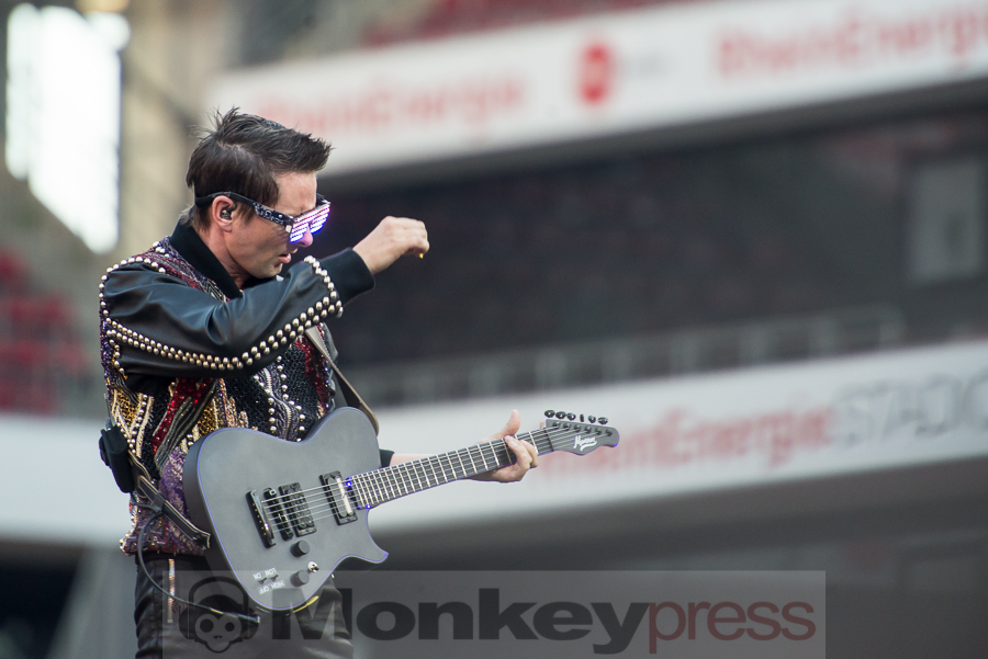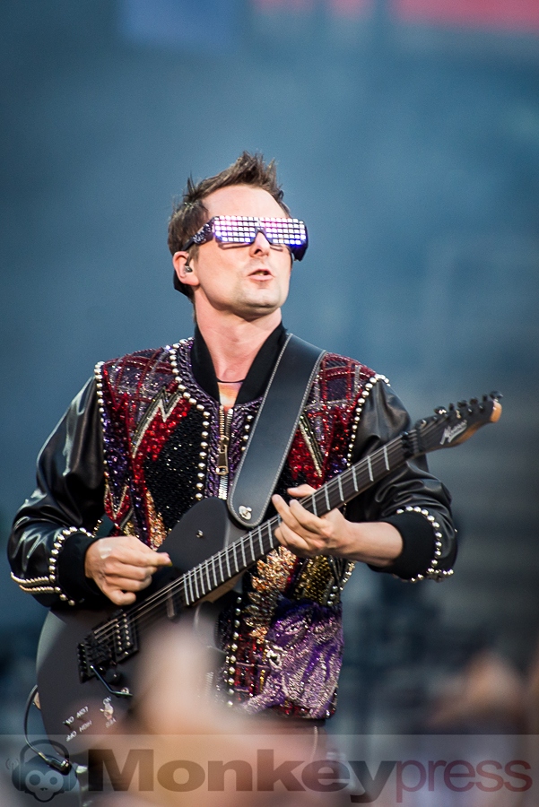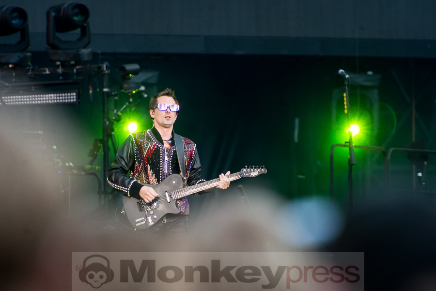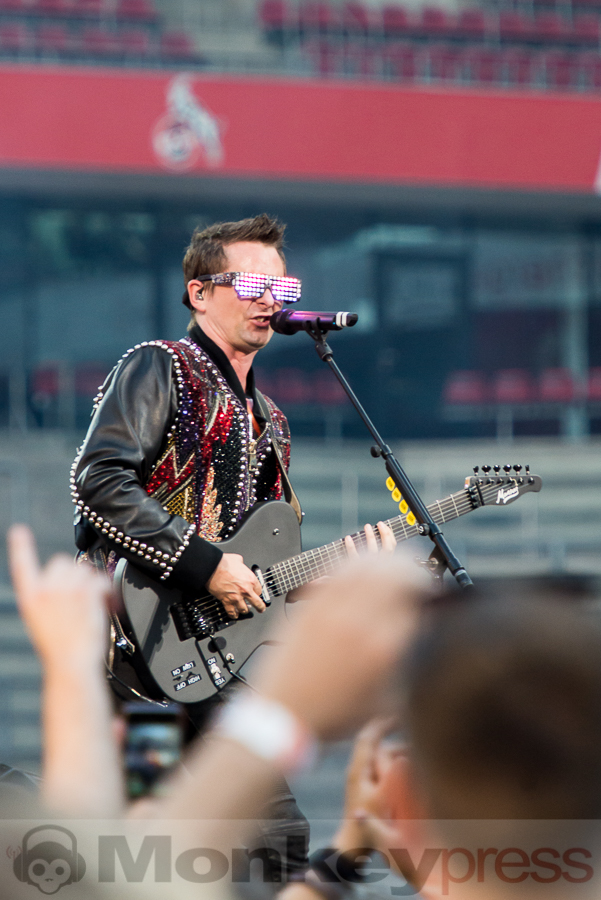Und als Muse dann endlich an der Reihe sind, ist die Sonne bereits langsam hinter dem Stadion versunken und die Temperaturen werden glücklicherweise erträglich. Hell bleibt es dabei leider immer noch. Denn dadurch kann die gigantische Leinwand nicht ihre volle Wirkung entfalten. Ob beleuchtete Anzüge und Brillen oder Laserstrahlen, alles bieten Muse auf und zelebrieren so auf technischer Ebene eine Show der Superlative, die sich im Laufe des zweistündigen Gigs auch noch steigern lässt. Nicht kleckern, sondern klotzen heißt die Devise, wenn es um die visuelle Show geht. Muse bieten die bunteste und farbprächtigste der letzten Jahre und das ist sehr beachtlich und mehr als schön anzusehen. Umso ärgerlicher ist es, dass der Sound da bei weitem nicht mithalten kann. Klingen die Instrumente weitestgehend gut und sind einzeln herauszuhören, so ist der Gesang von Frontmann Matthew Bellamy bei uns oft nur ärgerlich schwach zu hören.