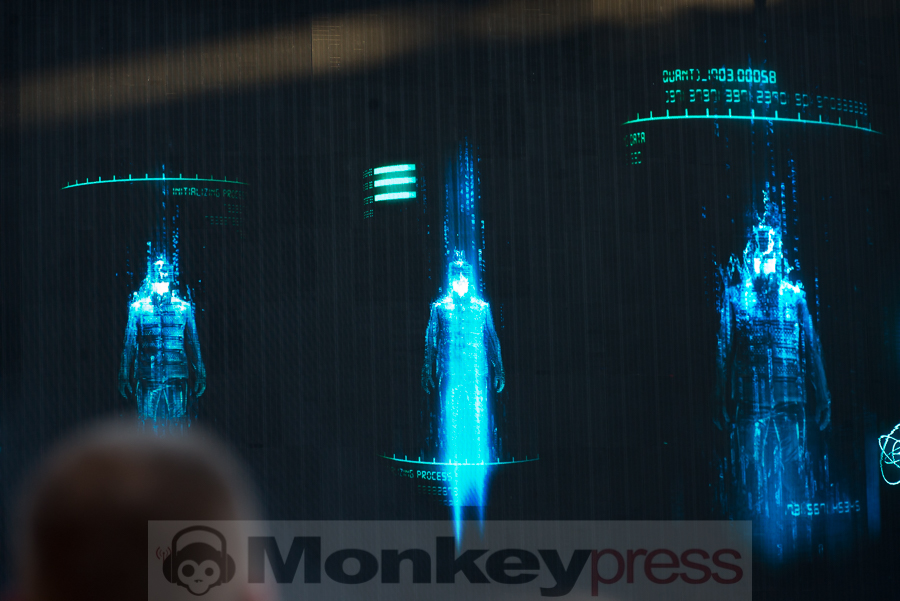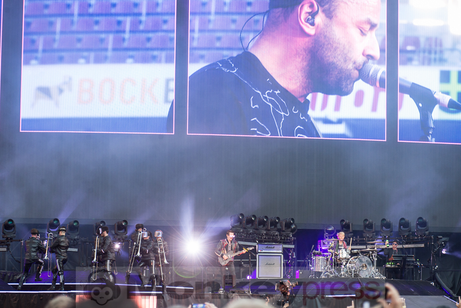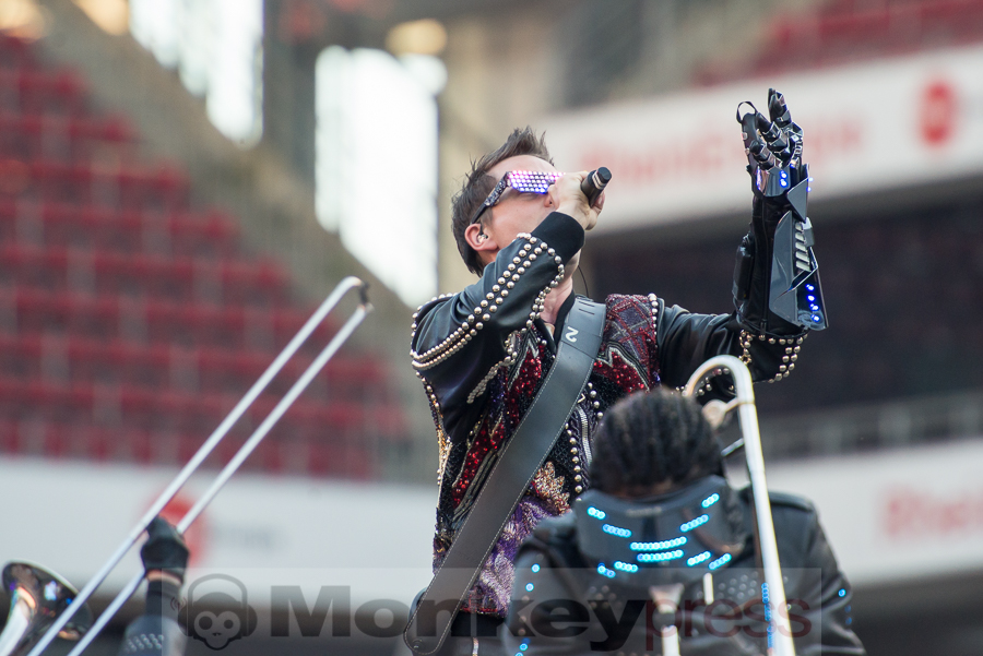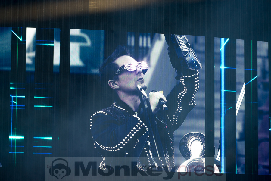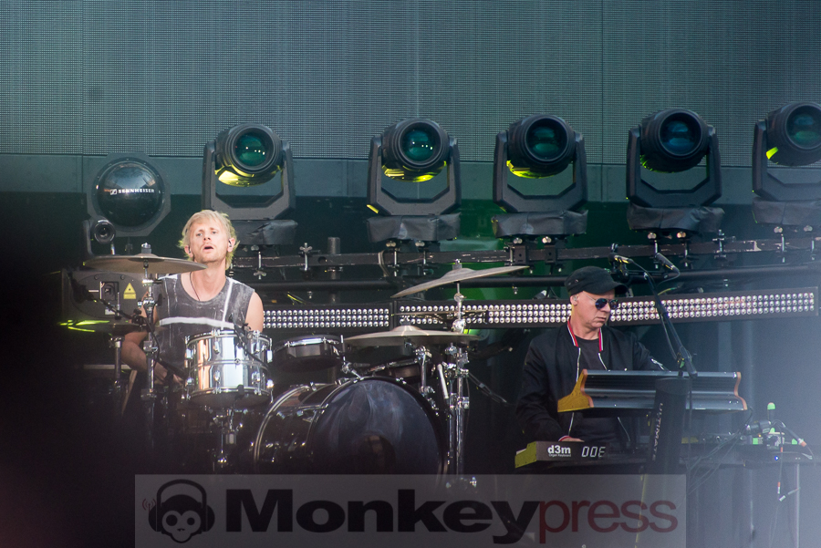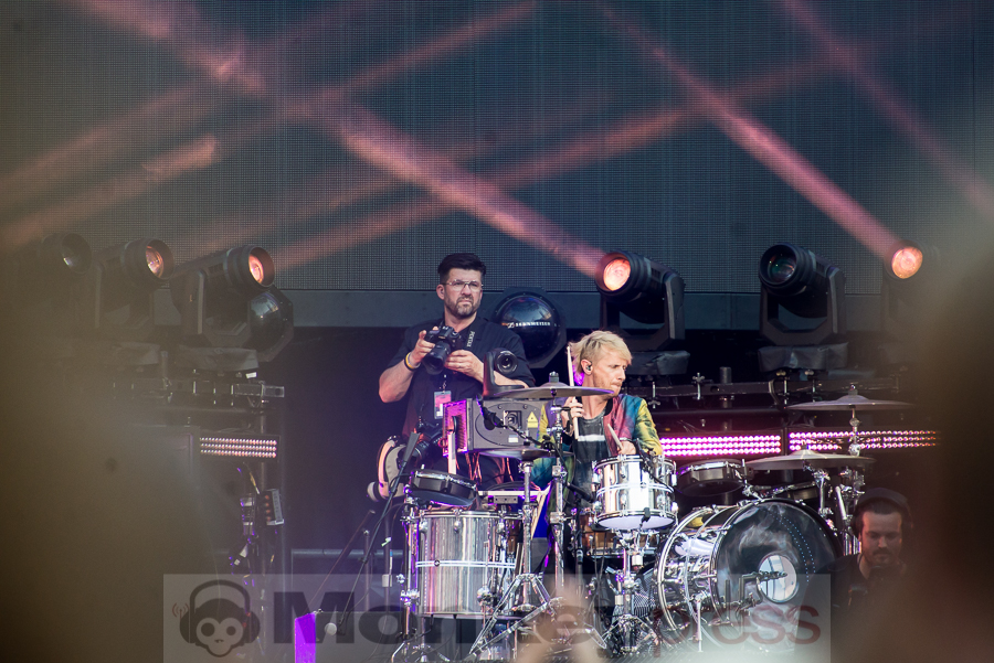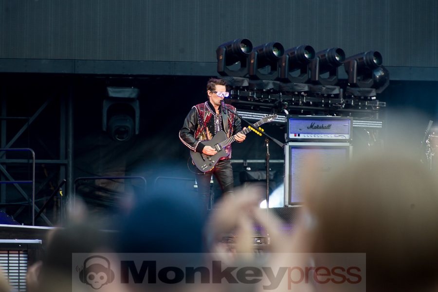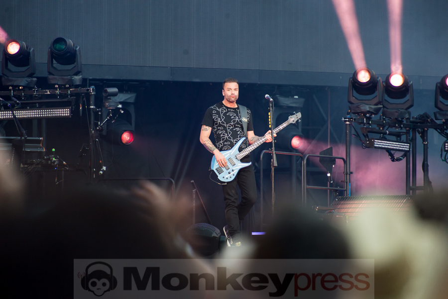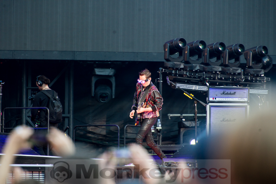 Und als Muse dann endlich an der Reihe sind, ist die Sonne bereits langsam hinter dem Stadion versunken und die Temperaturen werden glücklicherweise erträglich. Hell bleibt es dabei leider immer noch. Denn dadurch kann die gigantische Leinwand nicht ihre volle Wirkung entfalten. Ob beleuchtete Anzüge und Brillen oder Laserstrahlen, alles bieten Muse auf und zelebrieren so auf technischer Ebene eine Show der Superlative, die sich im Laufe des zweistündigen Gigs auch noch steigern lässt. Nicht kleckern, sondern klotzen heißt die Devise, wenn es um die visuelle Show geht. Muse bieten die bunteste und farbprächtigste der letzten Jahre und das ist sehr beachtlich und mehr als schön anzusehen. Umso ärgerlicher ist es, dass der Sound da bei weitem nicht mithalten kann. Klingen die Instrumente weitestgehend gut und sind einzeln herauszuhören, so ist der Gesang von Frontmann Matthew Bellamy bei uns oft nur ärgerlich schwach zu hören.