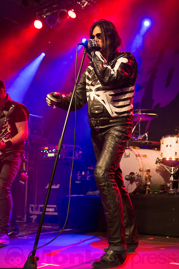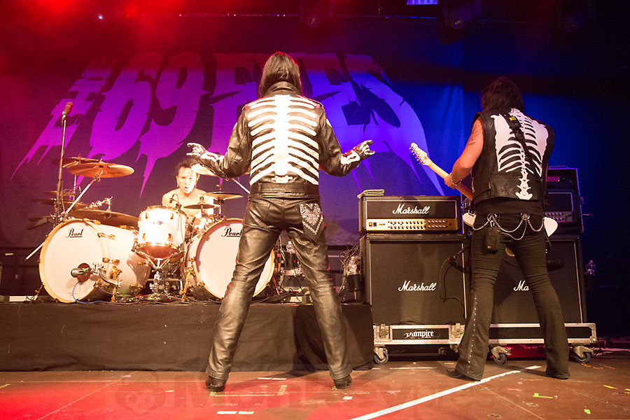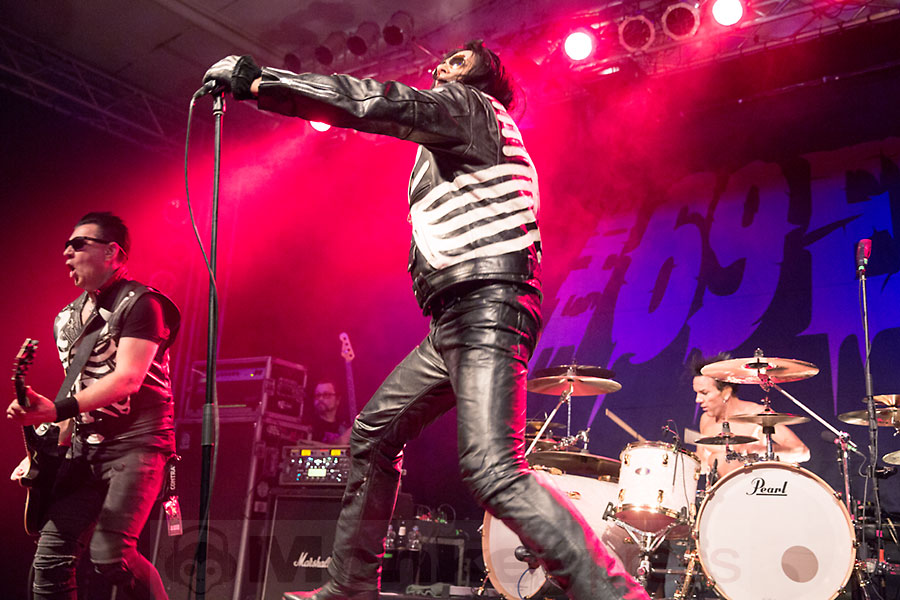 Nach weiteren 45 gemütlichen Minuten war es dann Zeit für The 69 Eyes, die wartende Menge zu erlösen. Jyrki 69, Jussi 69 am Schlagzeug, Archzie am Bass, Timo-Timo und Bazie an den Gitarren haben den langen Weg aus Finnland auf die Bühne der Essigfabrik gefunden. Zum Einstand gibt es das erste Stück, Two Horns Up vom neuen Album. (auf dem Album in Zusammenarbeit mit Dani Filth zu hören)