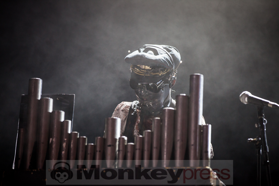 Das diesjährige Dark Storm startete 45 Minuten später mit der Berliner Formation Ost+Front. Musikalisch kann diese Band in das Genre Neue Deutsche Härte eingeordnet werden. Ein Mix aus harten Gitarrenklängen, elektronischer Musik und aggressiven deutschen Texten kennzeichnet den Stil dieser Band. Selbst zu Beginn des Abends schaffte es die Band die große Halle fast vollständig zu füllen. Optisch präsentieren sich die Musiker stark geschminkt, mit Masken, abgenutzten Mänteln und alten Uniformen. Ost+Front begeisterte sofort das Publikum. Die provokativen Songs wurden sogleich mitgesungen. Zu den einzelnen Songs präsentierten die Bandmitglieder verrückte Outfits und Accessoires. Besser konnte das Dark Storm wohl kaum beginnen.