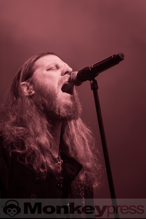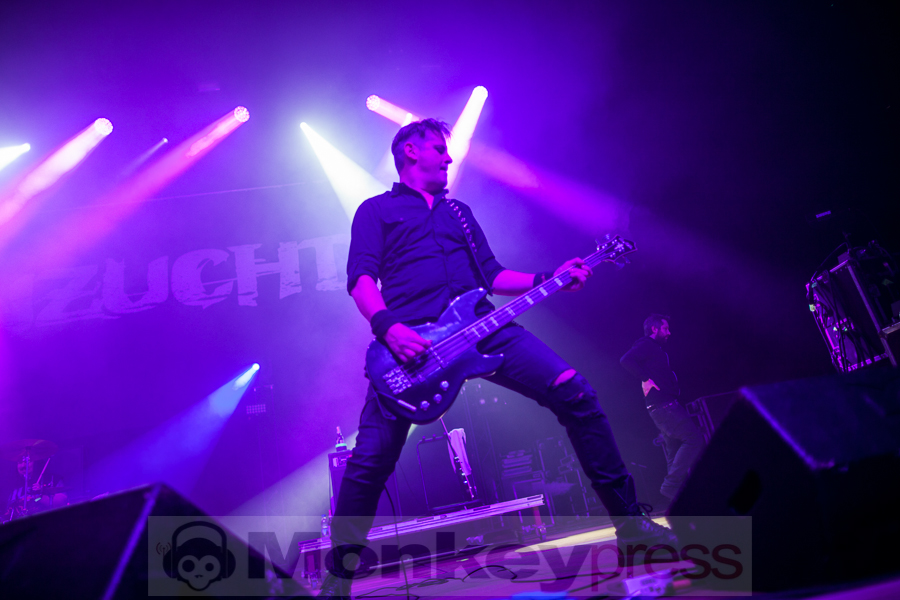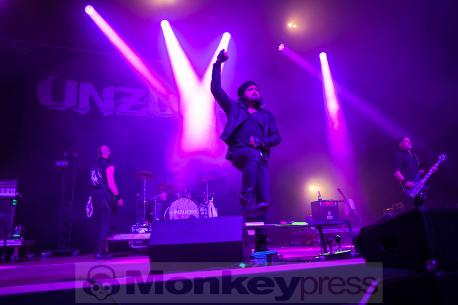 Gegen 18:15 Uhr begann Unzucht ihren Auftritt im großen Saal. Den Stil, der aus Hannover stammenden Band, kann man zwischen Gothic Rock und Dark Rock einordnen. Fortlaufend strömten immer mehr Gäste in den Saal, so dass die vorderen Reihen dicht gedrängt vor der Bühne standen. Mit deutschen Texten und hartem Gitarrensound gelang es Unzucht sogleich das Publikum in die richtige Stimmung zu versetzen.
