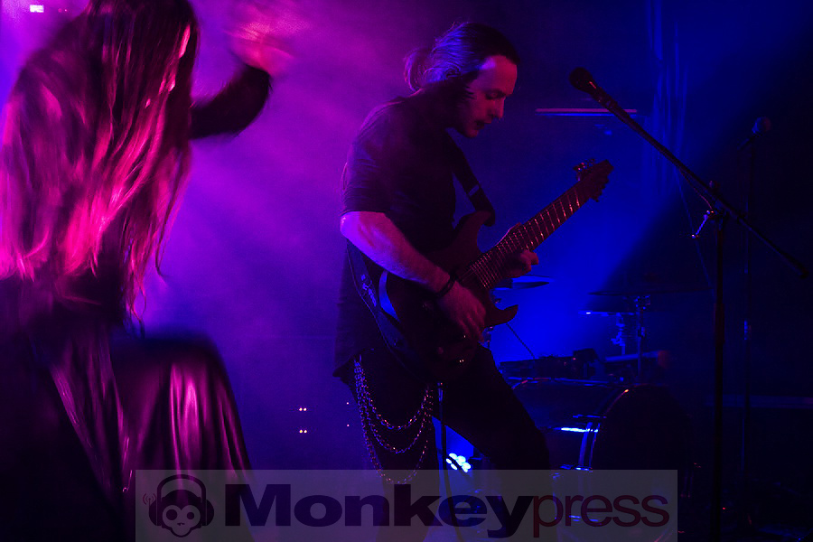 Den Abend eingeleitet hat „Dark Etheral“ – Solo-Projekt mit Unterstützung, LAPIS EXILIS. Der Düsseldorfer Musiker Eblis mit der eindringlichen Stimme, die Ian Curtis neidisch machen könnte, setzt viel auf Atmosphäre und Emotion. Echos and Loops, die sich über Minuten hinziehen, unterstreichen seine nachdenklich-schwangere Stimmung, die den gesamten Raum in ein in Zeitlupe ablaufenden Traum akustischer Poesie einhüllt. In späteren Songs unterstreicht Sängerin und Tänzerin Mira durch eine kontrastreiche Mischung aus sinnlich-vorsichtigen Bewegungen und sopraner-himmelstürmender Singstimme.