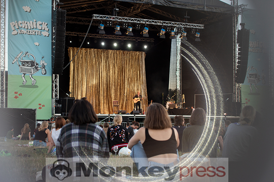 Der Schweizer Künstler mit der markanten Stimme ruft auf, darüber nachzudenken, was da gerade verlautbart wird, anstatt unreflektiert mitzusingen. Dazu Lachen, Sonnenschein, bittesehr! Den Mittelteil ergänzt Ansa Sauermann und der Goldene Reiter. Ein dynamisches Duett! Alles, was an Ausgelassenheit möglich ist, wird ausgefüllt mit der Sommerfrische, dem roten Himmel der die ersten Sterne zeigt, den sommerlichen Musiken, den warmen Licht, das hübsch von der Bühne strahlt und den glänzenden Augen, die dem Spektakel wertschätzend entgegenblicken. Das Zugabespiel wird gespielt und mit einem begleiteten Marsch durch die Abstände der Publikumsreihen belohnt: Aufstehen, tanzen (aber bitte mit angemessener Ekstase und ausreichend Abstand)!