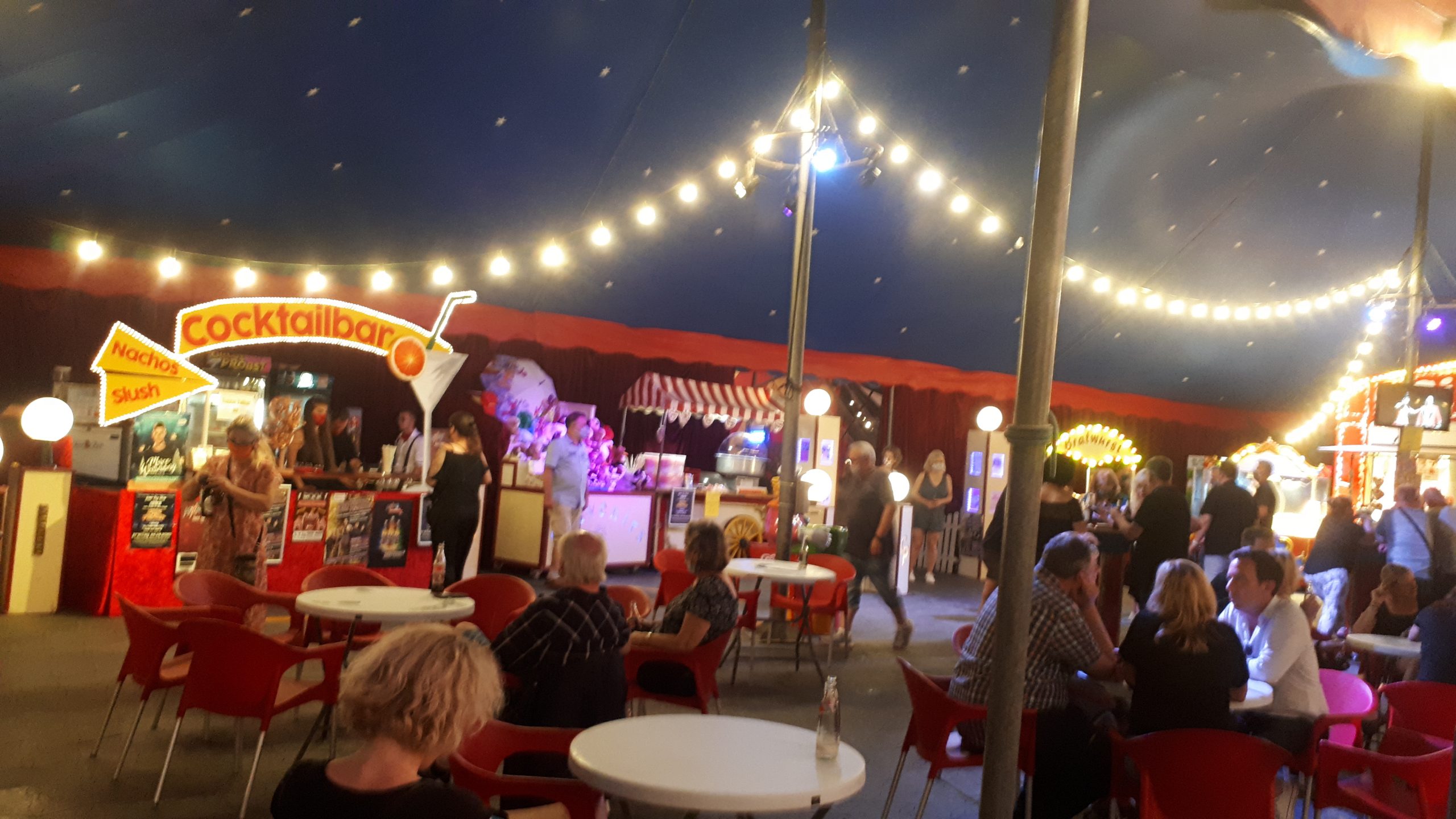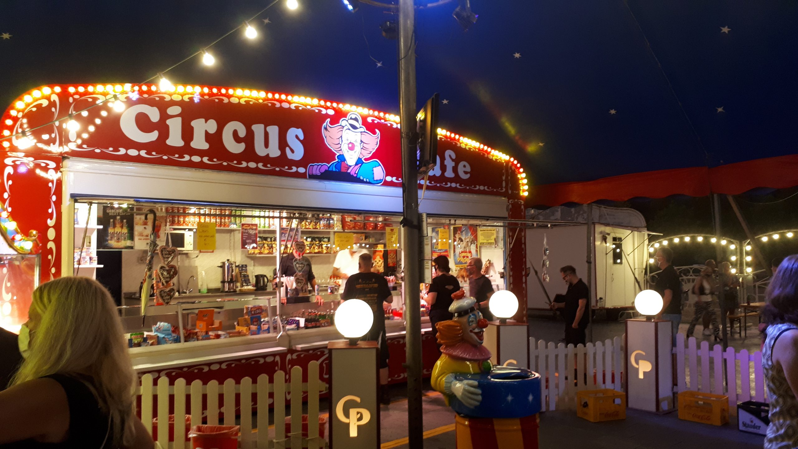 Wer am Zeltplatz kurz hinter der Essener-Gelsenkirchener Stadtgrenze ankommt, hat vor dem Betreten der Manege, in der nun 300 statt wie sonst 1000 Leute Platz nehmen dürfen, noch die Gelegenheit, es sich bei Getränk, Brezel und/oder Bratwurst an den zahlreich aufgestellten Sitzgelegenheiten bequem zu machen. Da entstand durchaus Wohlfühlatmosphäre, auch weil das Personal konsequent auf die Einhaltung aller Abstands- und Maskenregeln achtete.