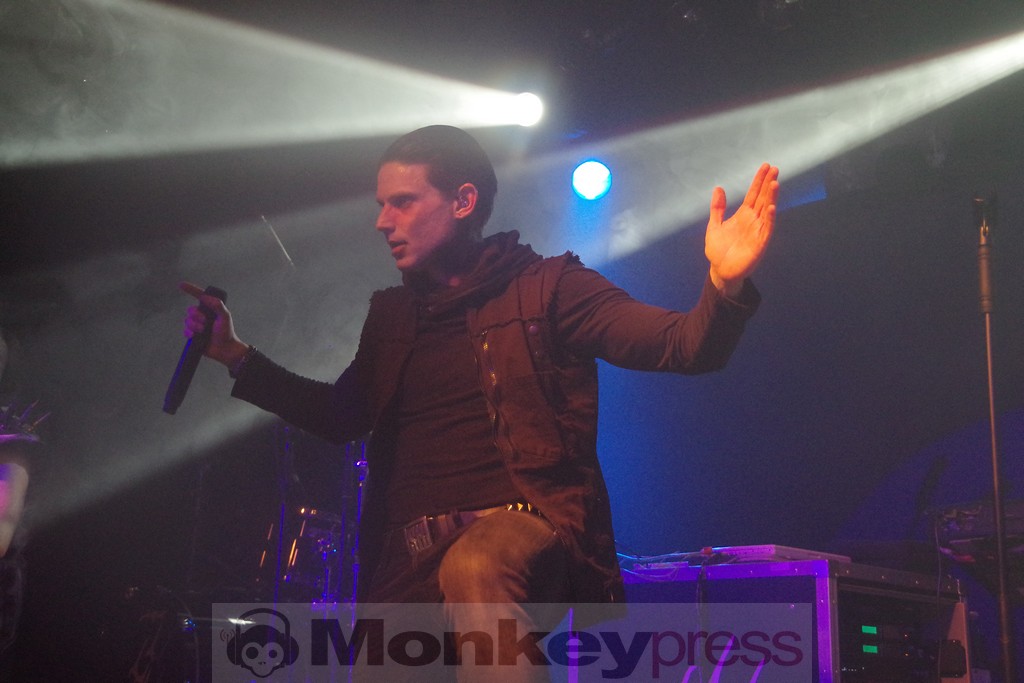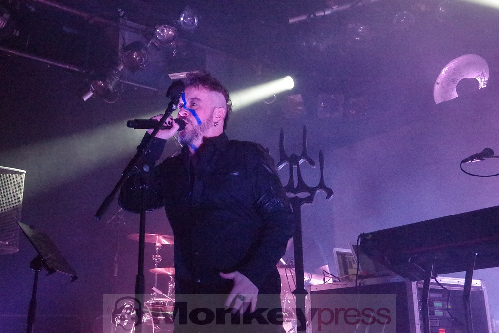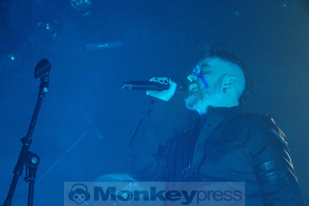 Man täte Chemical Sweet Kid natürlich Unrecht, sie nur als „Anheizer“ zu bezeichnen, aber „heiß“ war das Publikum inzwischen dennoch. Dicht gedrängte Reihen warteten drauf, endlich wieder Project Pitchfork live sehen zu dürfen und sie und ihre Musik zu feiern. Es sollte dann auch nicht mehr lange dauern, bis das Saallicht ausging und zum Bühnenlicht wechselte. Nach und nach betrat das Quartett um Peter Spilles, Jürgen Jansen, Christian Leonhardt und Achim Färber die Bühne und begann eine Zeitreise durch alle Phasen des Schaffens der Band, begonnen mit Lam-‘bras aus dem gleichnamigen Album, das im Jahr 1992 veröffentlicht wurde. Aber ob Fan der ersten Stunde oder dereinst noch gar nicht geboren und mit den Jahren hinzugekommen: Die freudigen Gesichter einten das Publikum deutlich.