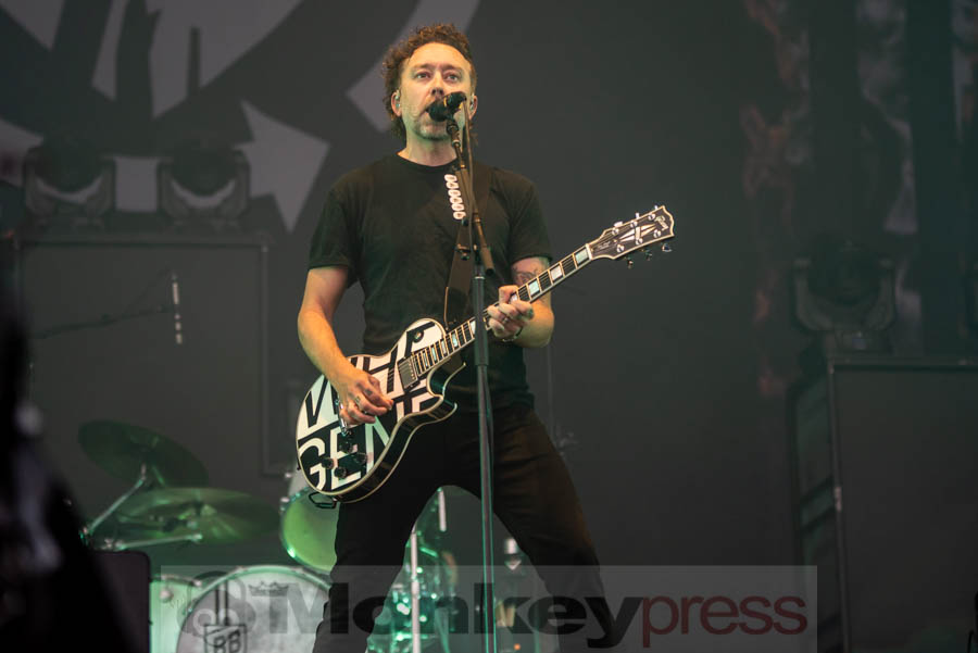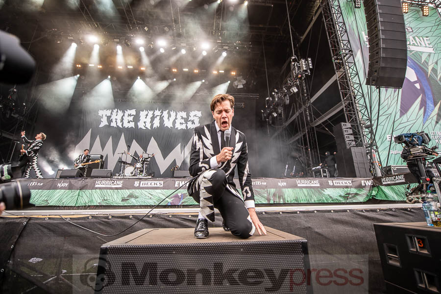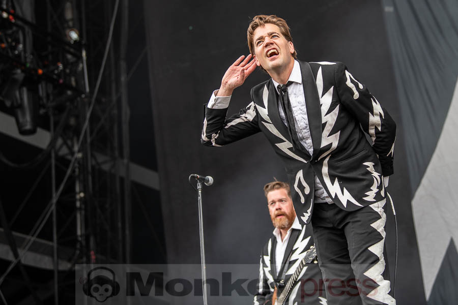 Von wegen Kummer – ich geh lieber zu The Hives. Diese Entscheidung sollte sich als goldrichtig erweisen, denn auf der Bühne stand eine Band, die extrem Bock hatte. Sänger Pelle Almquist fiel dabei besonders ins Auge, denn der stand nicht einen Moment still, sondern sprang und tobte über die Bühne, kletterte auf die Boxen im Fotograben, stellte sich auf Monitorboxen, die er vorher senktrech gestellt hatte. Kurzum: Er baute einmal die Bühne um und bewegte sich so weit, wie das Kabel seines Mikros es zuließ. Immer hinter ihm: Eine komplett in schwarz gekleidete, maskierte Person, die hinter Pelle wieder aufräumte oder das Kabel, das sich immer wieder irgendwo verfangen hatte, befreite. Auch ein geiler Job, muss man sagen. Aber es war auch eine Freude, den Rest der Band zu beobachten: Es wurden Grimassen geschnitten, sich so viel bewegt wie möglich und eigentlich die ganze Zeit so eine gute Laune verbreitet, dass es eine wahre Freunde war, hier zu sein. Das Ganze spiegelte sich auch im Publikum wider. Auch wenn Pelle die Menge immer wieder anstachelte – die meisten hatten sich eh bereits mit der guten Laune anstecken lassen.