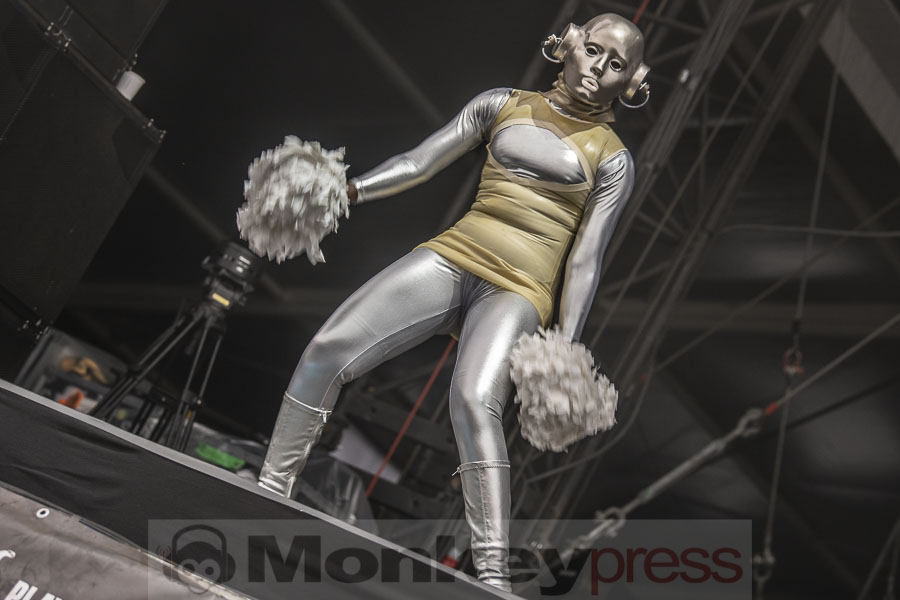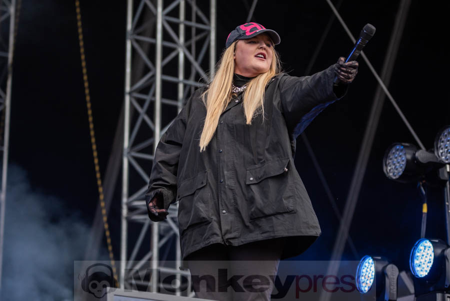 Seit der Trennung der Band SXTN treten die beiden Mädels solo auf. Heute stand Nura auf dem Programm. Unterstützt von zwei Tänzerinnen und einer DJane brachte sie mit ihrem rotzigen Deutschrap ordentlich Stimmung mit und erfand gleich mal das Amt des “Lochbeauftragten” – “Ich hab ein Loch mitgebracht, jetzt will ich von euch auch eins haben” – so bildete sich ein “Loch” aka Circle Pit, bei dem ein paar Fans in N U R A Shirts als Lochbeauftragte dafür sorgen sollten, dass wenn jemand hinfällt, derjenige aufgehoben wird, und auch, dass das Loch offen bleibt. Nura freute sich, dass sie auf die Frage, was die Fans die letzten zwei Jahre gemacht haben, ihr Buch erwähnten und erzählte, dass sie jetzt Hundemami geworden ist und ihre kleine Chilli-Maus überall mit hin nimmt. Musik gab es natürlich auch und wurde mit einem für die frühe Uhrzeit beachtlichen Pit belohnt.