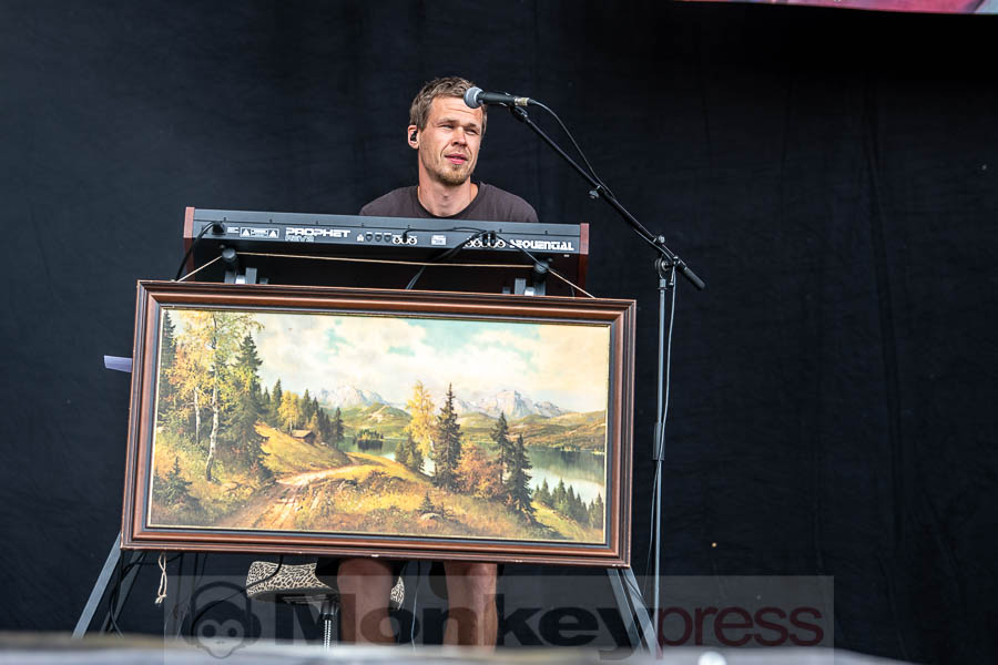 Zeit für einen Abstecher ins Zelt. Dort steht die Indie-Pop-Band Blond auf dem Plan und sorgt für einen Auftritt der anderen Art. “Wir kommen aus Chemnitz und da kommunizieren wir über Tanzen, auch beim Einkaufen”, wird uns gesagt und so übersetzt die Band uns schnell ein paar Sätze in Tanz. Dabei reißen sich die beiden Sängerinnen die Sachen vom Leib und stehen plötzlich in neuen Outfits auf der Bühne. Das Publikum wiederholt schnell die Tänze, jedoch nicht zufriedenstellend. “Grammatikalisch könnt ihr an eurem Tanz noch feilen”.