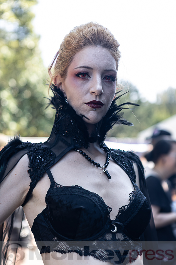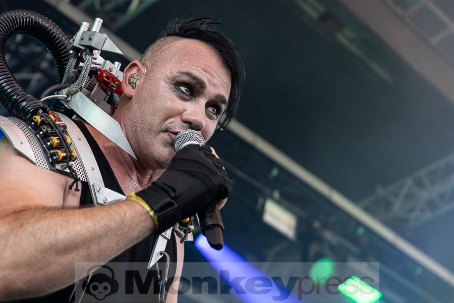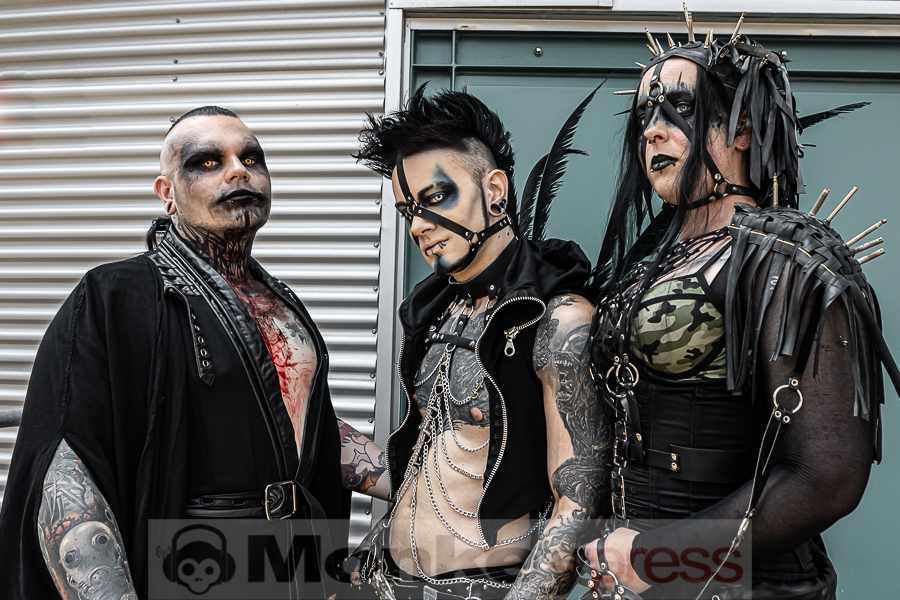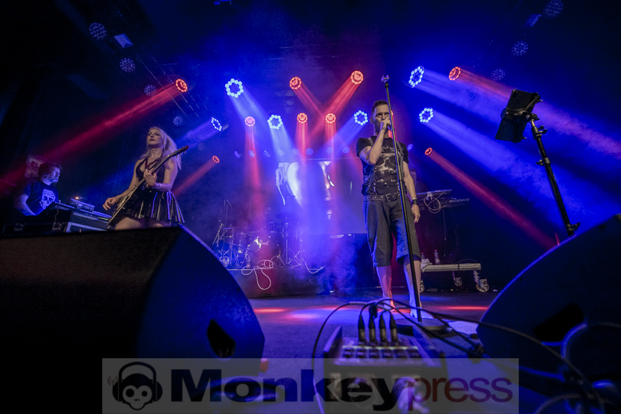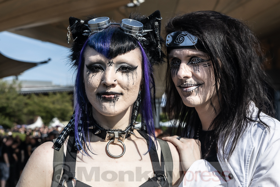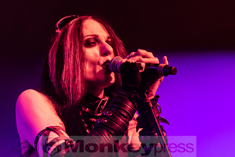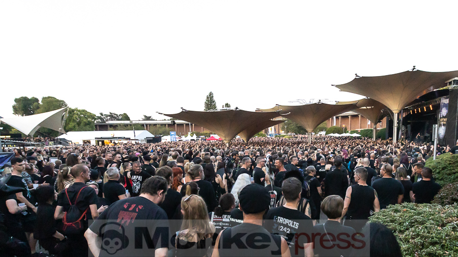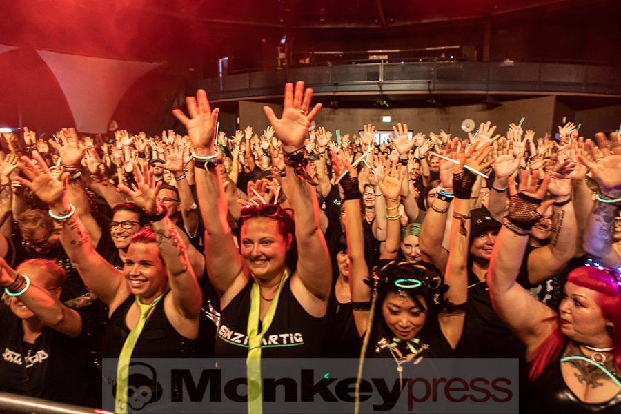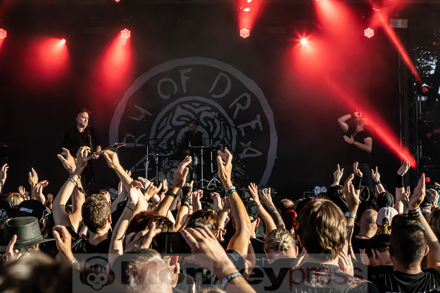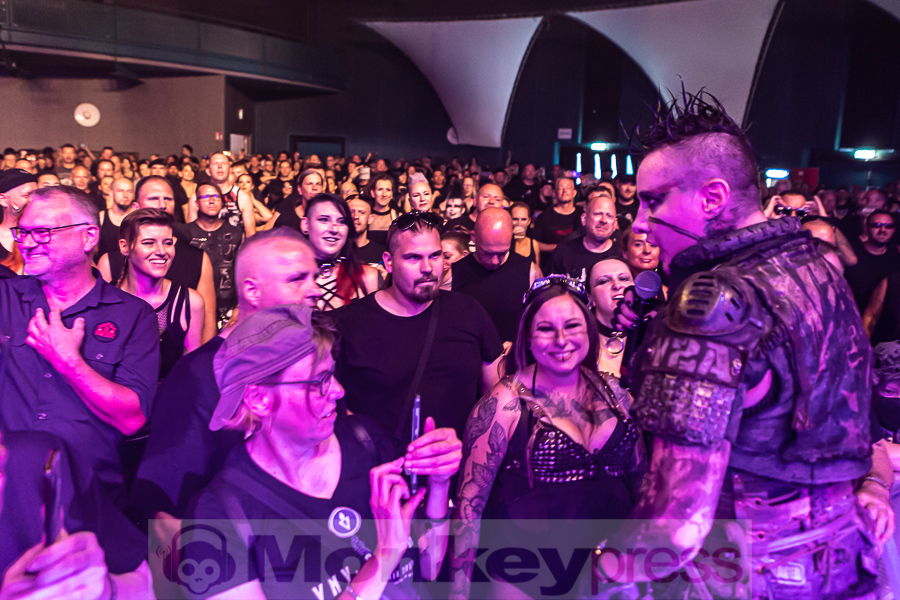 Die Musikfans haben es spürbar vermisst und können, quasi um wieder langsam herangeführt zu werden, auf einem längeren Fußweg von gut 1,5 Kilometern von den kostenlosen Parkplätzen (für zehn Euro ist auch das Parken im RTL Parkhaus gegenüber des Tanzbrunnens möglich) erst einmal vorsichtig Festivalluft schnuppern. Schon um 11 Uhr geht es offiziell auf dem Tanzbrunnen los, der Platz füllt sich zum Auftritt von Chemical Sweet Kid zunächst nur langsam, nach und nach dann aber immer weiter. Das gleiche kann man am Nachmittag ab 14:05 Uhr dann auch vom Theater sagen, denn die hier auftretenden Bands stehen denen auf der Hauptbühne qualitativ in nichts nach und spätestens ab Empathy Test platzt auch das Theater aus allen Nähten – Einlassstopp! Hier ist heute schon früh also Warten angesagt, was für viele schon ernste Befürchtungen für den Abend auslöst: Wird man dem viel erwarteten Auftritt der Theater-Headliner The Birthday Massacre überhaupt beiwohnen können? Bis dahin ist es aber noch eine ganze Weile und es stehen namhafte Acts wie Letzte Instanz. Solar Fake, Mesh , [:SITD:], Frozen Plasma (heute von der wunderbaren Lis van den Akker verstärkt) oder Mono Inc. auf dem Programm. Viele, mehr oder weniger gute, alte Bekannte also, die auch Dank der Zwangspause zumeist lange wieder herbeigesehnt wurden. Solar Fake um Fronter Sven Friedrich geben jedenfalls alles, um weiter in guter Erinnerung zu bleiben und dabei wird Sven heute von Elliott Berlin unterstützt, da Andre Feller leider nicht dabei sein kann. Elliott schlägt sich sehr gut, verleiht dem Auftritt noch zusätzliche Energie und so springt er kurzerhand samt Bass ins Publikum und feiert mit den Fans ordentlich ab. Leider gibt es am heutigen Tag immer wieder Soundprobleme, von denen auch Mesh betroffen sind, besser läuft es am Ende aber für den Headliner: VNV Nation. Und wie üblich braucht Stimmungskanone Ronan Harris nicht viel Zeit, um sein Publikum mitzureissen. Er freut sich sichtlich, lässt sich immer wieder zu Gesprächen verführen, doch das tut der Stimmung natürlich keinen Abbruch, der Tanzbrunnen kocht und natürlich ist auch die Freude groß, als Ronan für Februar 2023 das neue Album Electric Sun ankündigt, das deutlich düsterer ausfallen soll. Ich bin jedenfalls seit langem mal wieder etwas gespannt. Im Theater muss der Headliner ebenfalls zunächst mit technischen Problemen kämpfen, doch mit etwas Verspätung dürfen dann auch endlich The Birthday Massacre abrocken und das tun sie mit einem Querschnitt ihres gesamten Schaffens, gewohnt vielen Grimassen, Liebesbekundungen, harten Klängen und jeder Menge Energie.