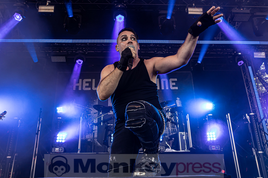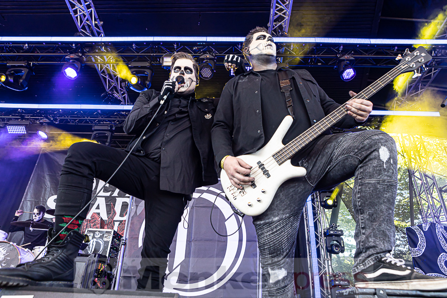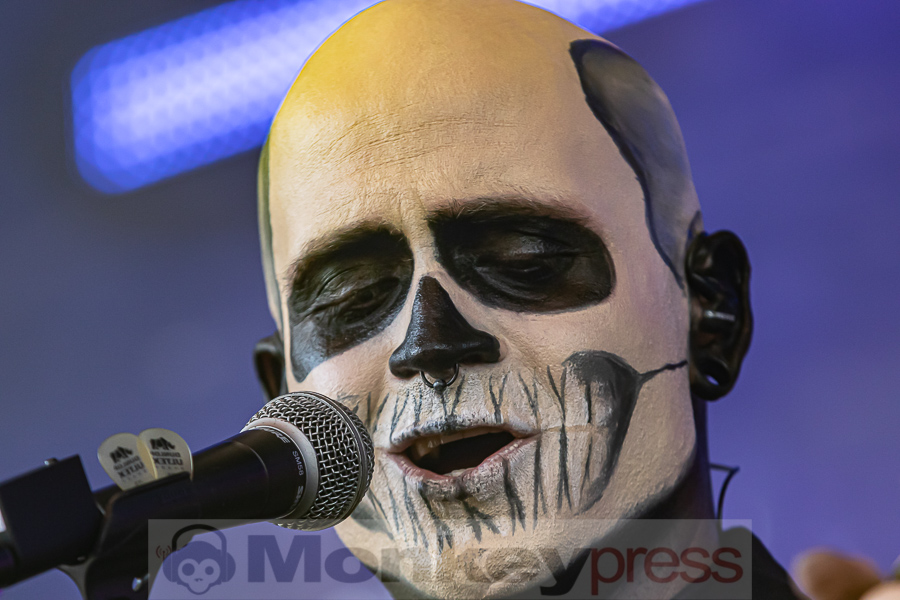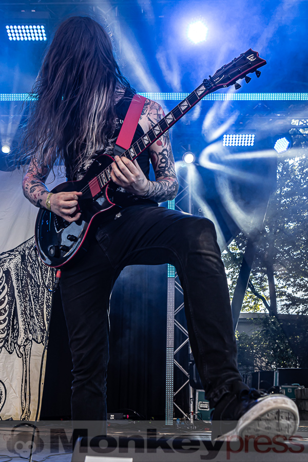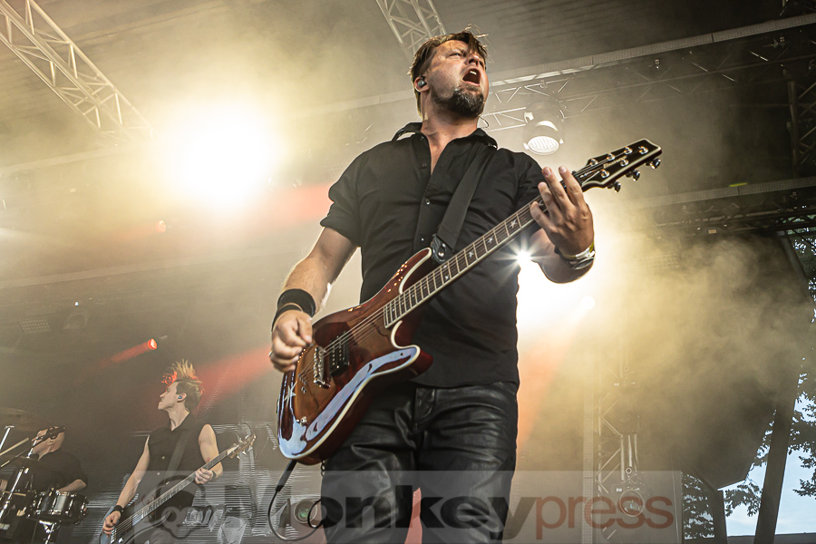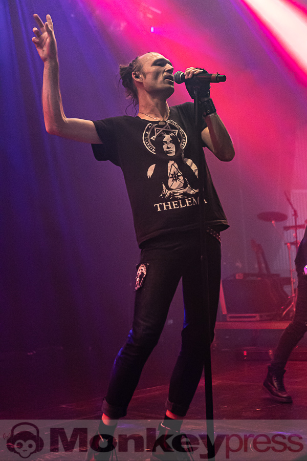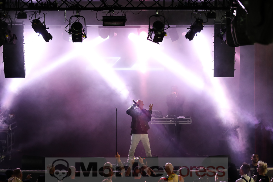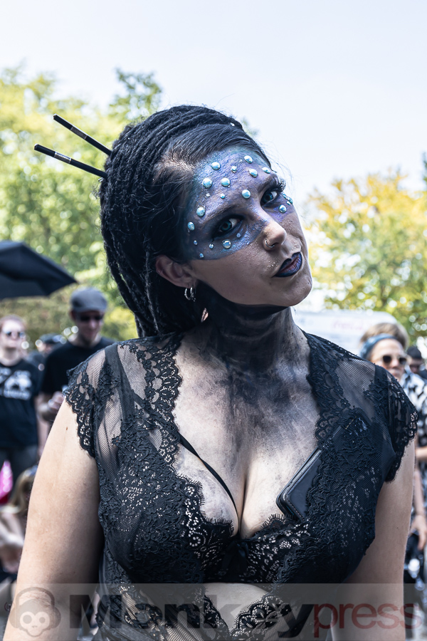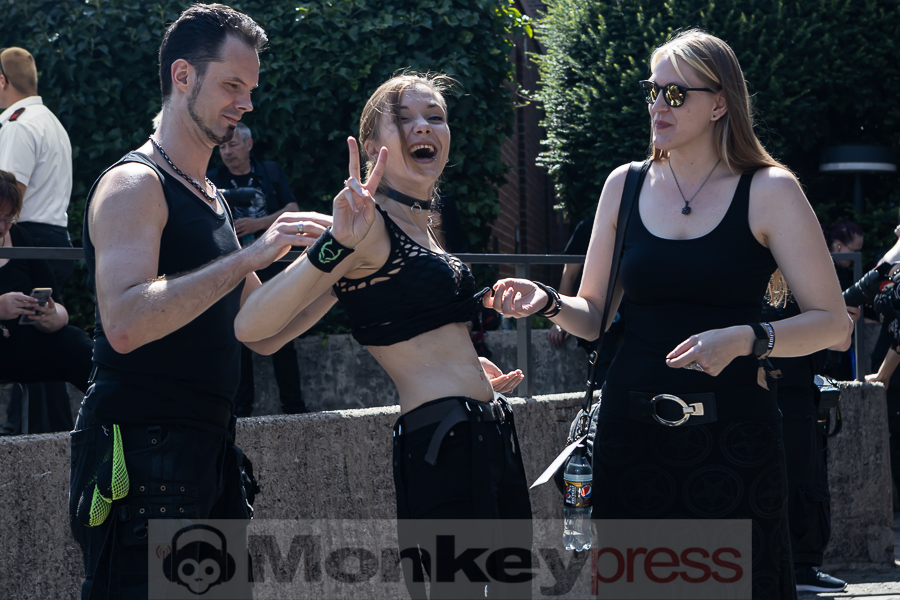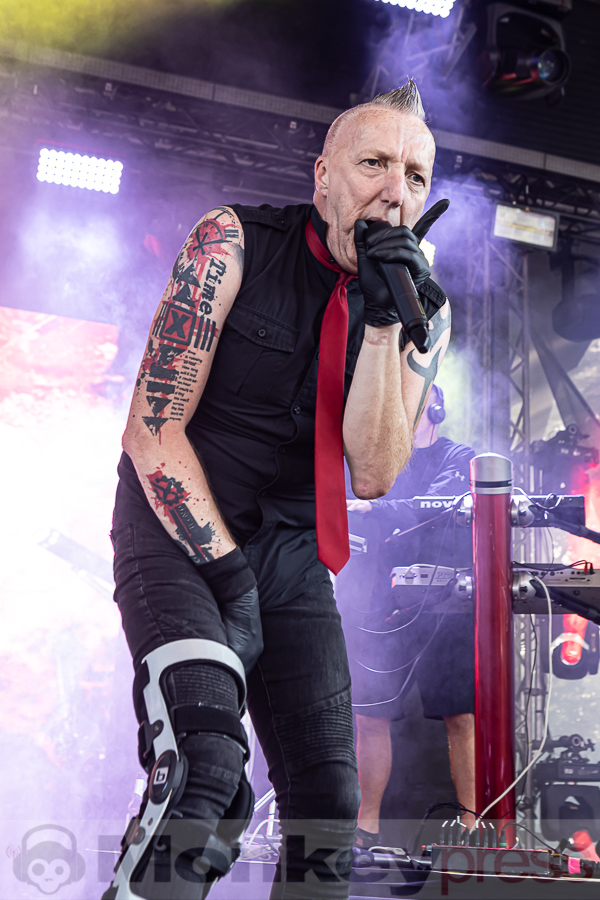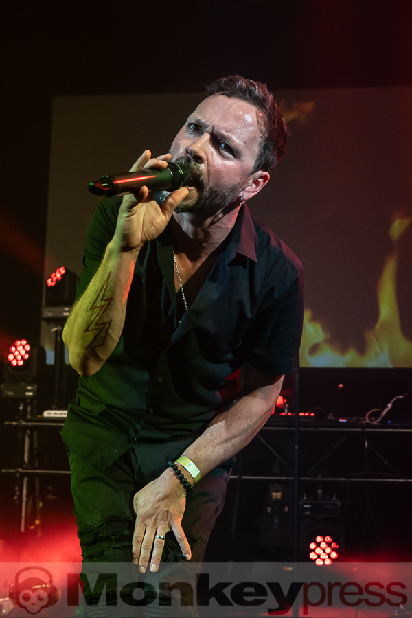Die Musikfans haben es spürbar vermisst und können, quasi um wieder langsam herangeführt zu werden, auf einem längeren Fußweg von gut 1,5 Kilometern von den kostenlosen Parkplätzen (für zehn Euro ist auch das Parken im RTL Parkhaus gegenüber des Tanzbrunnens möglich) erst einmal vorsichtig Festivalluft schnuppern. Schon um 11 Uhr geht es offiziell auf dem Tanzbrunnen los, der Platz füllt sich zum Auftritt von Chemical Sweet Kid zunächst nur langsam, nach und nach dann aber immer weiter. Das gleiche kann man am Nachmittag ab 14:05 Uhr dann auch vom Theater sagen, denn die hier auftretenden Bands stehen denen auf der Hauptbühne qualitativ in nichts nach und spätestens ab Empathy Test platzt auch das Theater aus allen Nähten – Einlassstopp! Hier ist heute schon früh also Warten angesagt, was für viele schon ernste Befürchtungen für den Abend auslöst: Wird man dem viel erwarteten Auftritt der Theater-Headliner The Birthday Massacre überhaupt beiwohnen können? Bis dahin ist es aber noch eine ganze Weile und es stehen namhafte Acts wie Letzte Instanz. Solar Fake, Mesh , [:SITD:], Frozen Plasma (heute von der wunderbaren Lis van den Akker verstärkt) oder Mono Inc. auf dem Programm. Viele, mehr oder weniger gute, alte Bekannte also, die auch Dank der Zwangspause zumeist lange wieder herbeigesehnt wurden. Solar Fake um Fronter Sven Friedrich geben jedenfalls alles, um weiter in guter Erinnerung zu bleiben und dabei wird Sven heute von Elliott Berlin unterstützt, da Andre Feller leider nicht dabei sein kann. Elliott schlägt sich sehr gut, verleiht dem Auftritt noch zusätzliche Energie und so springt er kurzerhand samt Bass ins Publikum und feiert mit den Fans ordentlich ab. Leider gibt es am heutigen Tag immer wieder Soundprobleme, von denen auch Mesh betroffen sind, besser läuft es am Ende aber für den Headliner: VNV Nation. Und wie üblich braucht Stimmungskanone Ronan Harris nicht viel Zeit, um sein Publikum mitzureissen. Er freut sich sichtlich, lässt sich immer wieder zu Gesprächen verführen, doch das tut der Stimmung natürlich keinen Abbruch, der Tanzbrunnen kocht und natürlich ist auch die Freude groß, als Ronan für Februar 2023 das neue Album Electric Sun ankündigt, das deutlich düsterer ausfallen soll. Ich bin jedenfalls seit langem mal wieder etwas gespannt. Im Theater muss der Headliner ebenfalls zunächst mit technischen Problemen kämpfen, doch mit etwas Verspätung dürfen dann auch endlich The Birthday Massacre abrocken und das tun sie mit einem Querschnitt ihres gesamten Schaffens, gewohnt vielen Grimassen, Liebesbekundungen, harten Klängen und jeder Menge Energie.