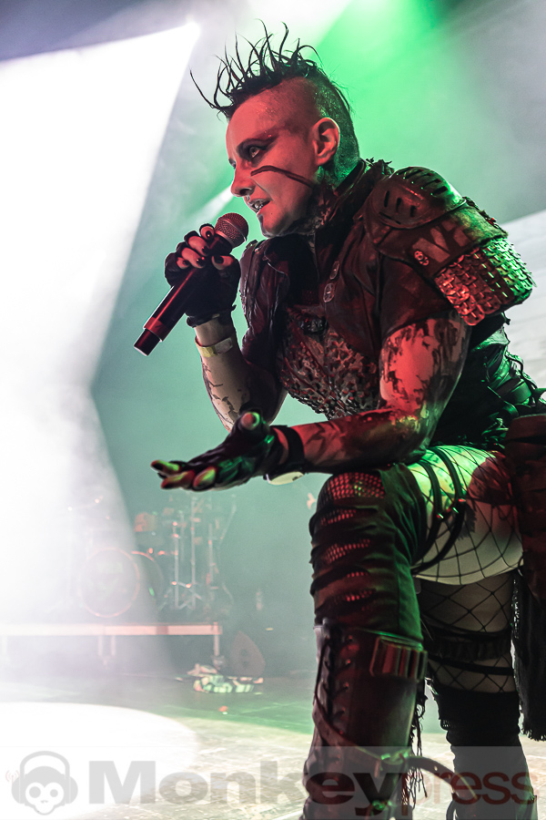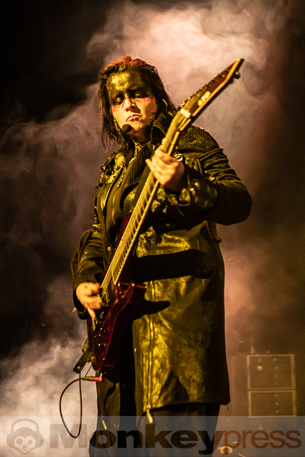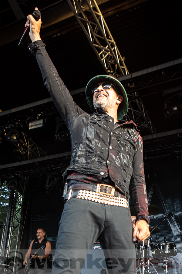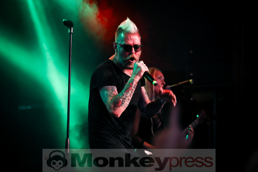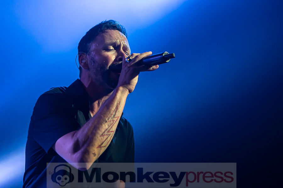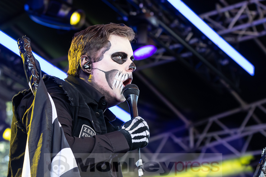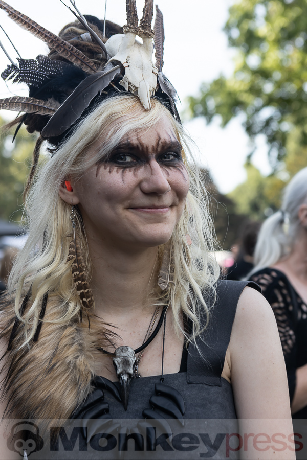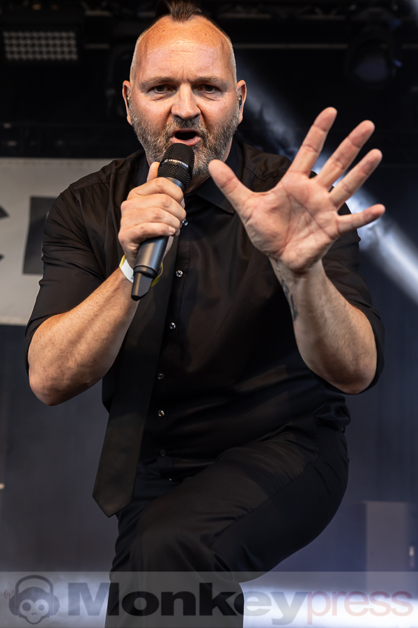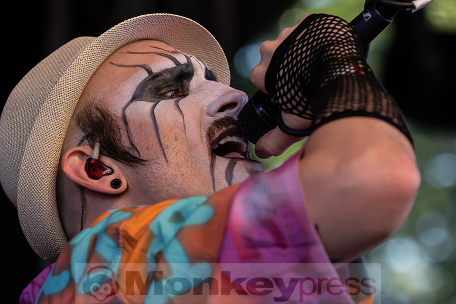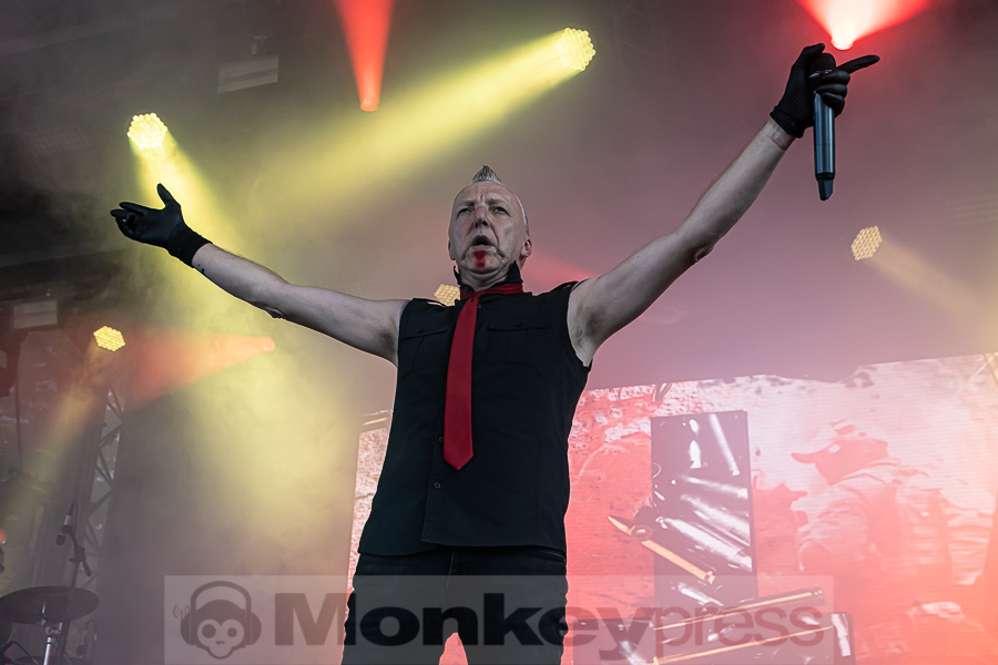 Die Musikfans haben es spürbar vermisst und können, quasi um wieder langsam herangeführt zu werden, auf einem längeren Fußweg von gut 1,5 Kilometern von den kostenlosen Parkplätzen (für zehn Euro ist auch das Parken im RTL Parkhaus gegenüber des Tanzbrunnens möglich) erst einmal vorsichtig Festivalluft schnuppern. Schon um 11 Uhr geht es offiziell auf dem Tanzbrunnen los, der Platz füllt sich zum Auftritt von Chemical Sweet Kid zunächst nur langsam, nach und nach dann aber immer weiter. Das gleiche kann man am Nachmittag ab 14:05 Uhr dann auch vom Theater sagen, denn die hier auftretenden Bands stehen denen auf der Hauptbühne qualitativ in nichts nach und spätestens ab Empathy Test platzt auch das Theater aus allen Nähten – Einlassstopp! Hier ist heute schon früh also Warten angesagt, was für viele schon ernste Befürchtungen für den Abend auslöst: Wird man dem viel erwarteten Auftritt der Theater-Headliner The Birthday Massacre überhaupt beiwohnen können? Bis dahin ist es aber noch eine ganze Weile und es stehen namhafte Acts wie Letzte Instanz. Solar Fake, Mesh , [:SITD:], Frozen Plasma (heute von der wunderbaren Lis van den Akker verstärkt) oder Mono Inc. auf dem Programm. Viele, mehr oder weniger gute, alte Bekannte also, die auch Dank der Zwangspause zumeist lange wieder herbeigesehnt wurden. Solar Fake um Fronter Sven Friedrich geben jedenfalls alles, um weiter in guter Erinnerung zu bleiben und dabei wird Sven heute von Elliott Berlin unterstützt, da Andre Feller leider nicht dabei sein kann. Elliott schlägt sich sehr gut, verleiht dem Auftritt noch zusätzliche Energie und so springt er kurzerhand samt Bass ins Publikum und feiert mit den Fans ordentlich ab. Leider gibt es am heutigen Tag immer wieder Soundprobleme, von denen auch Mesh betroffen sind, besser läuft es am Ende aber für den Headliner: VNV Nation. Und wie üblich braucht Stimmungskanone Ronan Harris nicht viel Zeit, um sein Publikum mitzureissen. Er freut sich sichtlich, lässt sich immer wieder zu Gesprächen verführen, doch das tut der Stimmung natürlich keinen Abbruch, der Tanzbrunnen kocht und natürlich ist auch die Freude groß, als Ronan für Februar 2023 das neue Album Electric Sun ankündigt, das deutlich düsterer ausfallen soll. Ich bin jedenfalls seit langem mal wieder etwas gespannt. Im Theater muss der Headliner ebenfalls zunächst mit technischen Problemen kämpfen, doch mit etwas Verspätung dürfen dann auch endlich The Birthday Massacre abrocken und das tun sie mit einem Querschnitt ihres gesamten Schaffens, gewohnt vielen Grimassen, Liebesbekundungen, harten Klängen und jeder Menge Energie.