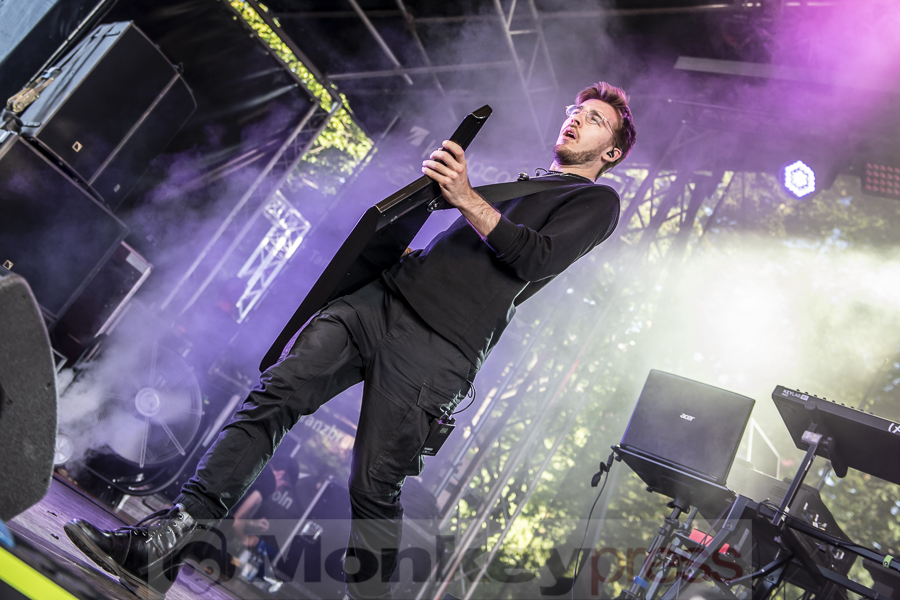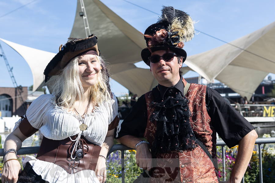 Der Sonntag steht zunächst ganz im Zeichen des Mottos „Schatten suchen“, denn die Sonne brennt schon früh lichterloh auf die Domstadt herab. Das bedeutet dann natürlich, dass die Plätze unter den prägnanten Tanzbrunnenschirmen stets gut bevölkert sind, während die äußeren Bereiche vor der Bühne meist nur spärlich besetzt sind. Das geschlossene Theater erfreut sich bei angenehmeren Bedingungen als im prallen Sonnenschein natürlich ebenfalls einer gewissen Beliebtheit und auch das Schiff ist nun schon früh gut besucht. Die Klimaanlage hat ordentlich zu tun, zum einen gegen die Hitze, zum anderen aber auch um gegen die schweißtreibenden EBM-Beats von Sturm Café oder Dupont bestehen zu können. Um es vorweg zu nehmen, es war ein ungleicher Kampf, die Klimaanlage hatte keine Chance. Auch nicht bei Cat Rapes Dog, deren Auftritt so viel Spaß macht, dass der Gitarrist zum Pogen gleich mit ins Publikum springt. Zeit, den Tag auf dem Schiff mit etwas ruhigeren, aber nicht minder tollen Tönen bei In Strict Confidence ausklingen zu lassen.