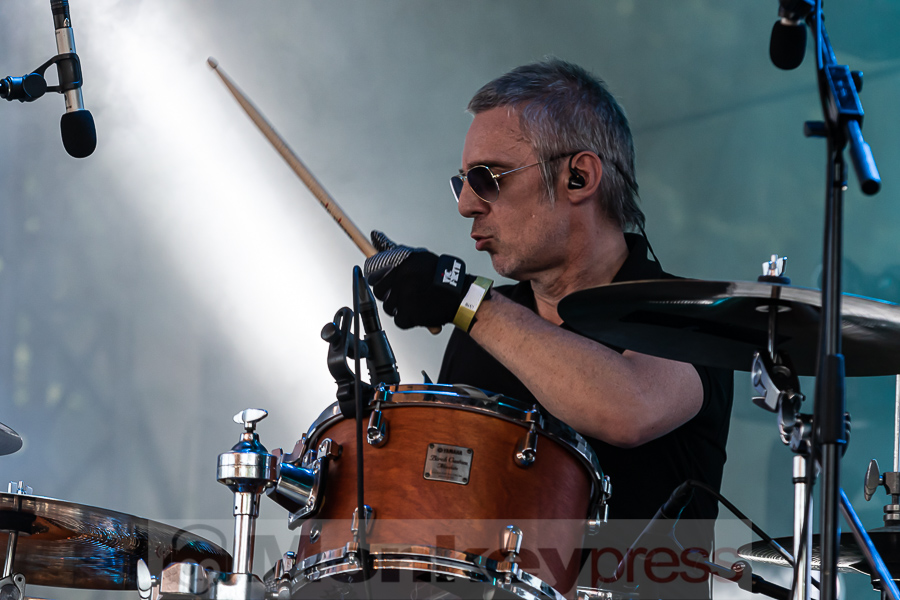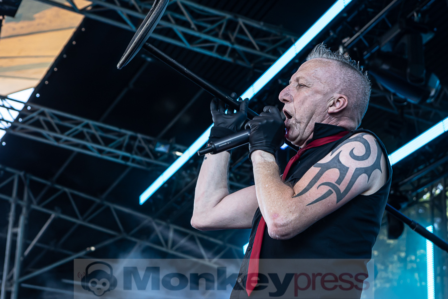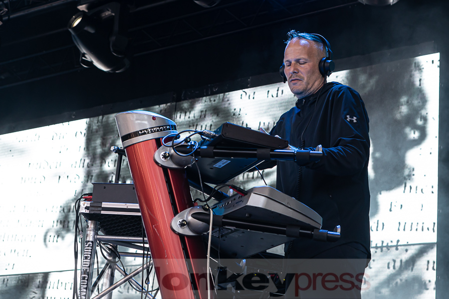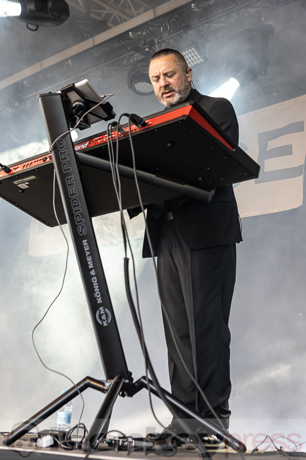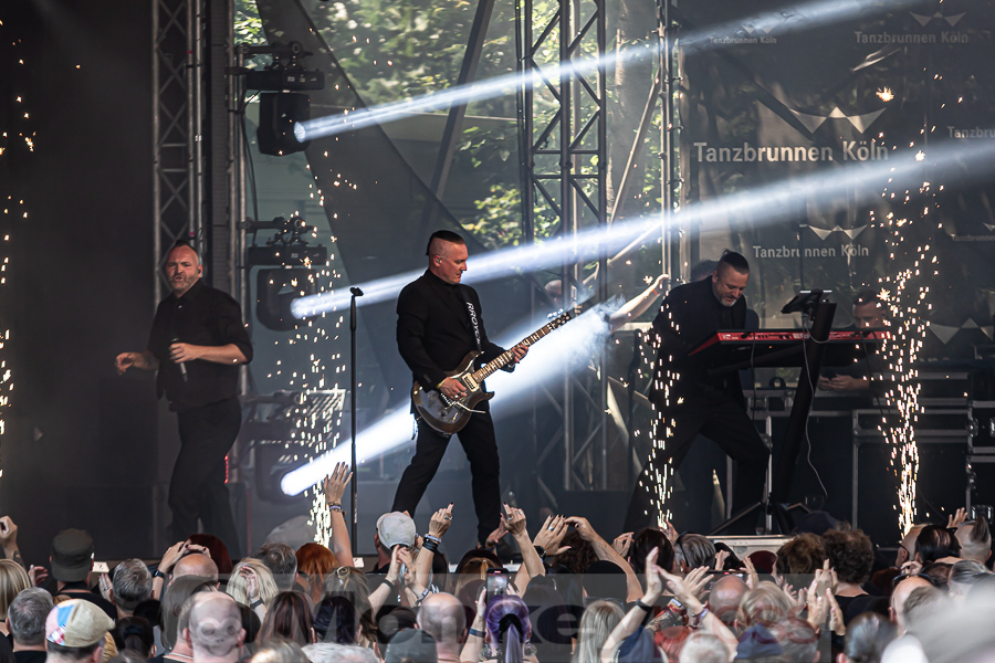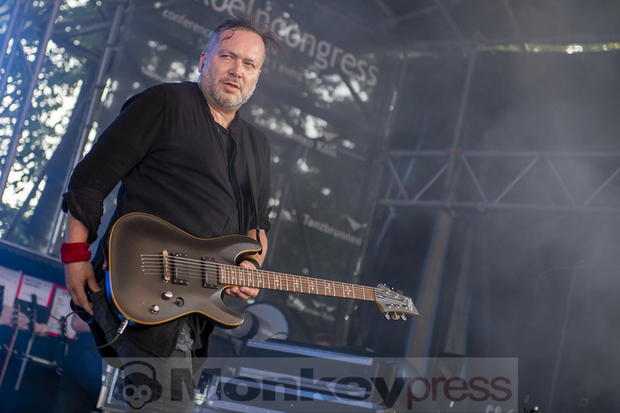Etwas abseits des eigentlichen Tanzbrunnen-Trubels hat in diesem Jahr wieder die dritte Bühne, die Orbit Stage, Station gemacht. Aufgrund des niedrigen Rheinpegels, musste die MS RheinEnergie in diesem Jahr wieder auf der anderen Rheinseite anlegen und ist dementsprechend schwer zu erreichen, zumal die Sperrung der Deutzer Brücke für einen deutlich umständlicheren Anfahrtsweg der eingesetzten Shuttle Busse führt. Ein knapp 20-minütiger Fußweg wird da zur ernsthaften Alternative. Die heißen Temperaturen tun aber wohl ebenfalls ihr übriges dazu, dass es auf dem Schiff lange Zeit weniger voll ist, was sich erst zum Ende hin ändert. Dabei wird hier mit bester Musik, Getränken in Gläsern und einem klimatisierten Inneren ordentlich etwas geboten. Das Programm musste auf der MS RheinEnergie leicht angepasst werden, denn Der Fluch müssen Aufgrund einer Corona Infektion ihren eigentlichen Auftritt absagen, beeindruckender Weise haben sich Sänger Deutscher W und die spontan eingesprungene Brigitte Handley aber spontan bereit erklärt, ein 30-minütiges Set zu spielen, das sehr zu überzeugen weiß. Die heiße Phase wird dann mit den Dänen von The Foreign Ressort eingeläutet, ein tolles Set. bevor Joy Division Undercover die Fans alter Klassiker mit einem großartigen Coverset unterhalten und sich auch nicht von einem sehr spärlich bekleideten Fan aus der Ruhe bringen lassen, der zu Transmission auf die Bühne sprang, aber ebenso schnell wieder abgeführt wurde. Ash Code lassen es heute im Anschluss etwas gemächlicher angehen, doch dafür begeistern She Past Away zum Abschluss umso mehr.