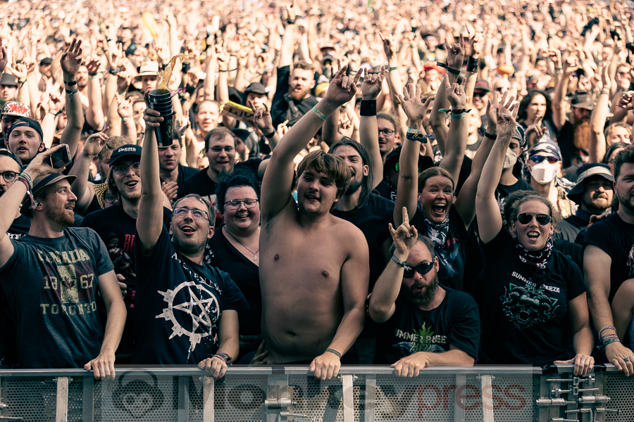 Spitze Trollohren, weiß-schwarze geschminkte Gesichter und lange Haare? Ja, endlich sind Finntroll an der Reihe. Die Trolle singen, trotz dass sie aus Finnland kommen, auf schwedisch, weil es, wie sie es sagen, trollisch klingt. Obwohl die meisten im Publikum weder finnisch noch schwedisch verstehen, feiern sie die Folk-Metaller trotzdem ab und wirbeln den Staub so richtig schön auf. „I can taste the moshpit from here“ – teilte Sänger Mathias Lillmåns der Menge mit. Sie hatten eine gut gemischte Setlist, von neu bis alt war alles dabei. Auch wenn das aktuelle Album Vredesvävd schon 2020 rauskam, war es für Finntroll eine Premiere, die neuen Songs in dieser Festival-Saison live zu spielen. Nach einer Stunde Spielzeit war es leider auch schon vorbei.