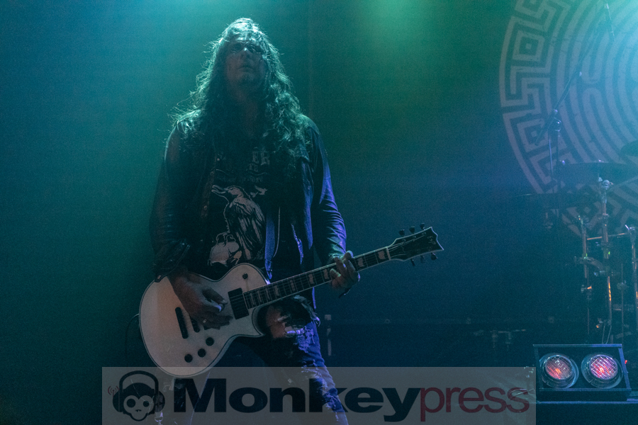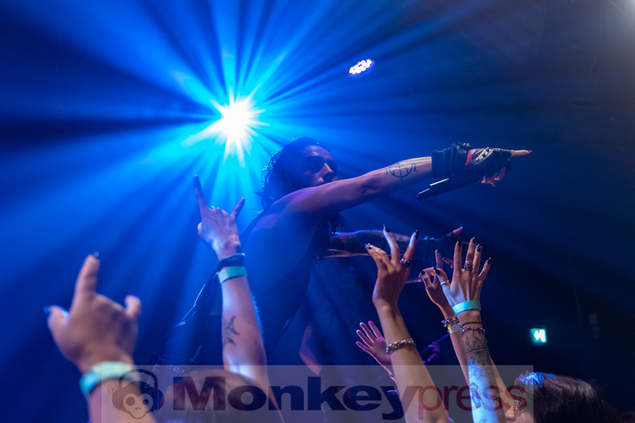 Pünktlich um 20:00 Uhr lag diese durchaus bekannte, aufgeregte Spannung in der Luft, als sich das Licht verdunkelte. Die plötzlich eingetretene Stille hielt nicht lange an. Lacrimas Profundere enterten die Bühne und begannen sogleich mit der aktuellen Single To Disappaear in You. Das Set startete somit melodisch und treibend zugleich. Sänger Julian Larre trug obenrum ausschließlich eine äußerst stylische Lederjacke, die aufwendig mit verschiedenen Farben effektvoll bearbeitet wurde. Ein Ärmel wurde zudem komplett von einem Text in feiner, weißer Schrift verziert. Eine dunkle Sonnenbrille verdeckte zunächst seine Augen. Seine Fingernägel waren passend zur Jacke in bunten Neonfarben lackiert. Ab der ersten Sekunde ging die Post ab und niemand vermochte es stillzustehen. „That feels good! Do you guys have energy tonight, Cologne?” Daraufhin entledigte sich Julian seiner Sonnenbrille und seine schneeweißen Kontaktlinsen kamen zum Vorschein. Diese verliehen ihm einen stechenden Blick und ließen ihn gar dämonisch wirken. Bei Celestite Woman headbangte er zusammen mit den ersten Reihen im Takt. Zwischendurch gesellte er sich immer mal wieder zu seinem Basser Ilker Ersin oder poste neben Oliver Nikolas Schmid, dem Gitarristen und Gründer der Band. Als mit A Pearl ein Klassiker erklang, reckte ein entzückter Metal Fan begeistert seine Faust in die Luft und strahlte wie ein seliges Honigkuchenpferd. Julian zeigte vollen Körpereinsatz, fegte über die Bühne, kniete auf dem Boden und sang voller Eifer. Als eine junge Frau einen spitzen Jubelruf ausstieß, zeigte sich der Sänger beeindruckt: „That was pretty cowboyish!“