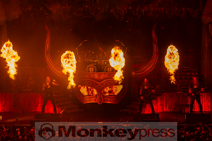 Nach dem traditionellen Iron Maiden-Song Run To The Hills als Opener vom Band, feuerte die Pyrotechnik nach dem Fall des Vorhangs bereits zum ersten Stück Guardians of Asgaard aus allen Rohren und machte klar, dass Oberhausen an diesem Abend wieder einmal einer Brandschatzung zum Opfer fallen würde. Auch bei den Wikingern von AMON AMARTH zeigte sich das Publikum von seiner besten Seite und war sowohl textsicher als auch bewegungsfreudig. Aufgewärmt von den beiden anderen Bands wurde jetzt beim Highlight des Abends (gemessen an der Zahl der Anwesenden mit AMON AMARTH-T-Shirts im Vergleich zu Shirtträgern von MACHINE HEAD) noch einmal alles geben. Egal ob Moshen, Circle Pit oder Mitrudern zu Put Your Back Into the Oar, Oberhausen war zu allem bereit und die Mannen um den wie üblich wie ein Honigkuchenpferd grinsenden Johan Hegg waren es auch.