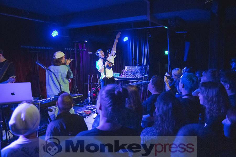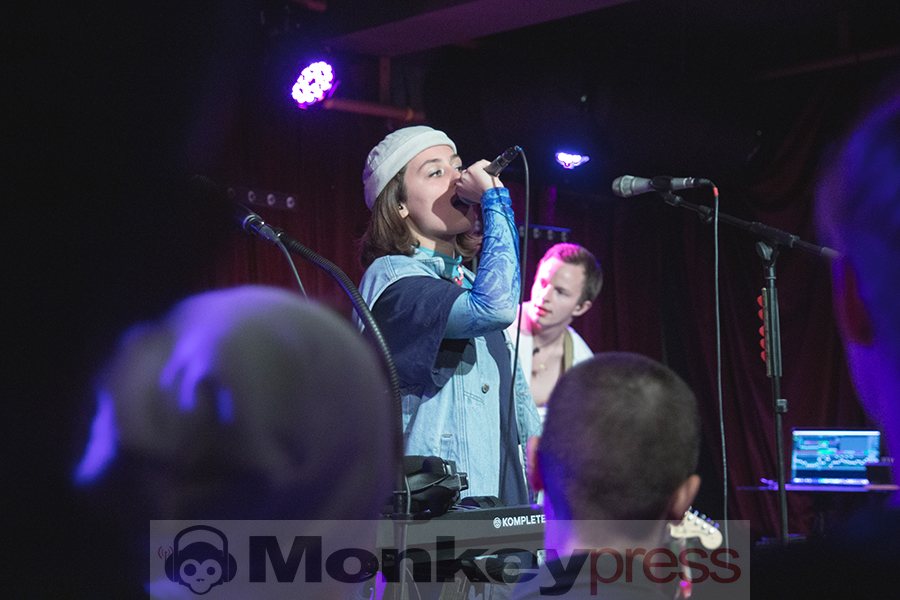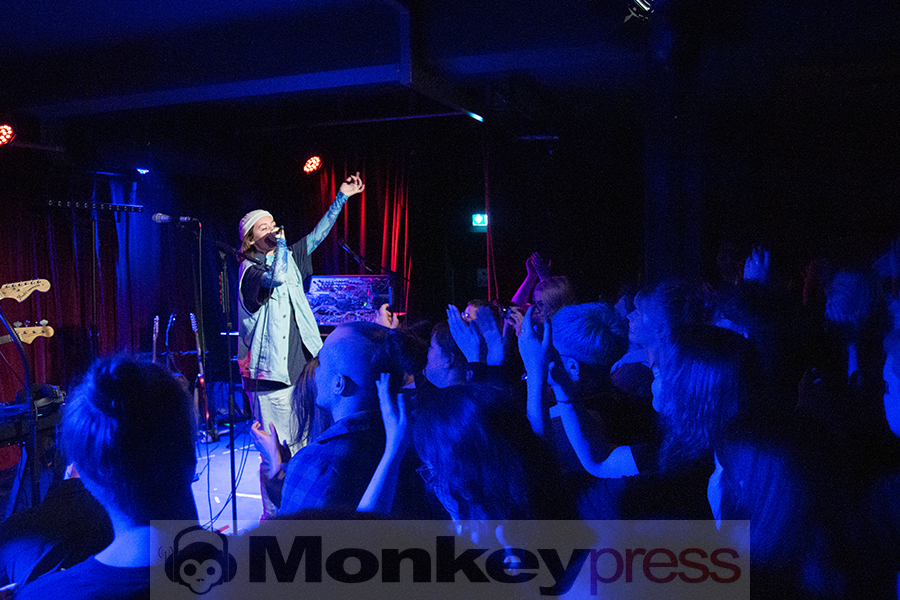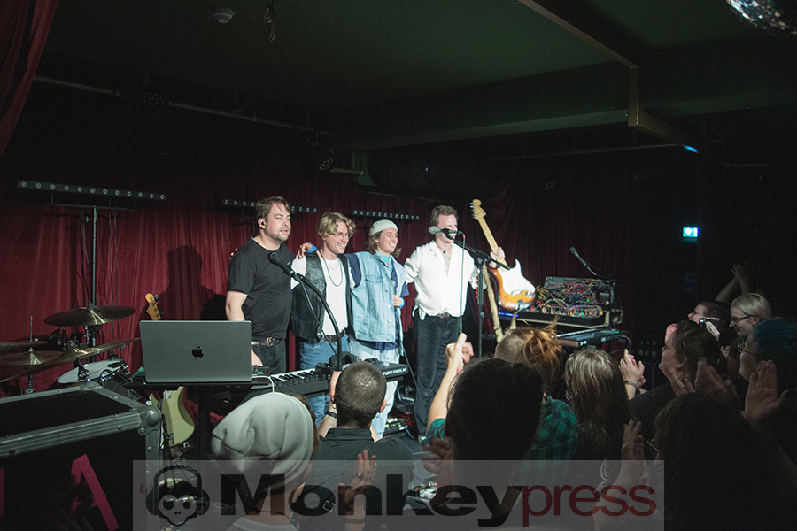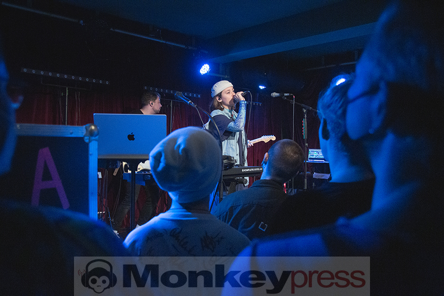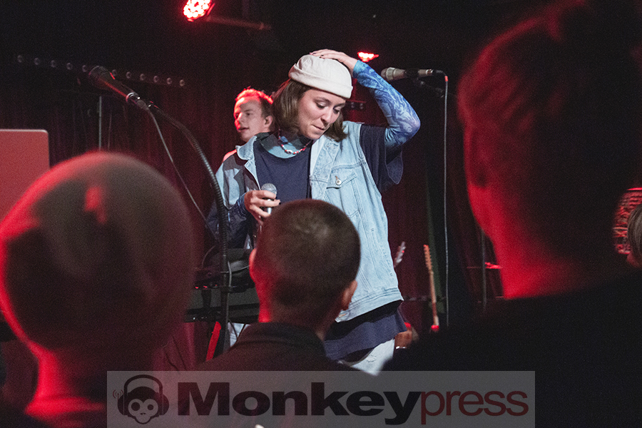 Paula Carolina kündigen die Klebestreifen auf dem Instrumentenkoffer an der Bühnenecke an. Mit deutschsprachigen Pop rührt die 23-jährige Musikerin in der hibbeligen, aufregungsgeladenen Stimmung des Zuschauerraums und kumuliert eigene und Publikumsenergien in ausgelassene Ekstase. Alle springen, tanzen, zappeln, schütteln sich, alle singen, klatschen und strahlen. Gemeinsam vor dem so eingängig wie satten Sound ihrer Band, das sind Felix Burtscher (Drums), Nikolaus Winkelhausen (Gitarre) und Michael Goldmann (Bass), schlägt sie politische Töne an. Naturgemäß ist alles immer irgendwie politisch, weil Musik, Lyrics mit über und durch Gesellschaft kommunizieren – klar, aber hier findet der Diskurspop sehr klare Worte für Wohlfühlorte und Queerness. Jene ziert Paula Carolina mit aufrichtigen Glanz und gefälligen Rhythmen. Ganz vereinnahmt von ihren Geschichten, ihre schillerndsten Alltagsbeobachtungen verstrickt ihre Offenheit in ein berauschendes, kurzlebiges Livemusikerlebnis.
