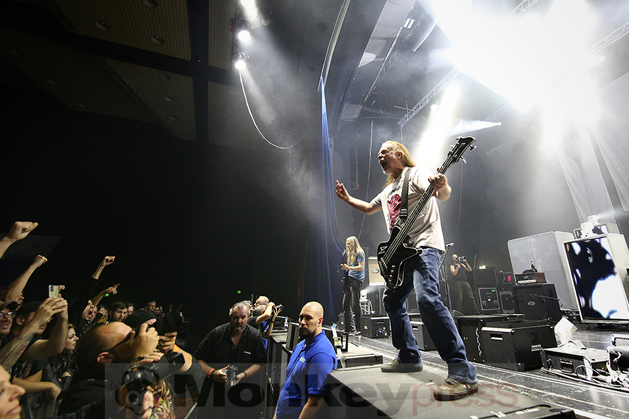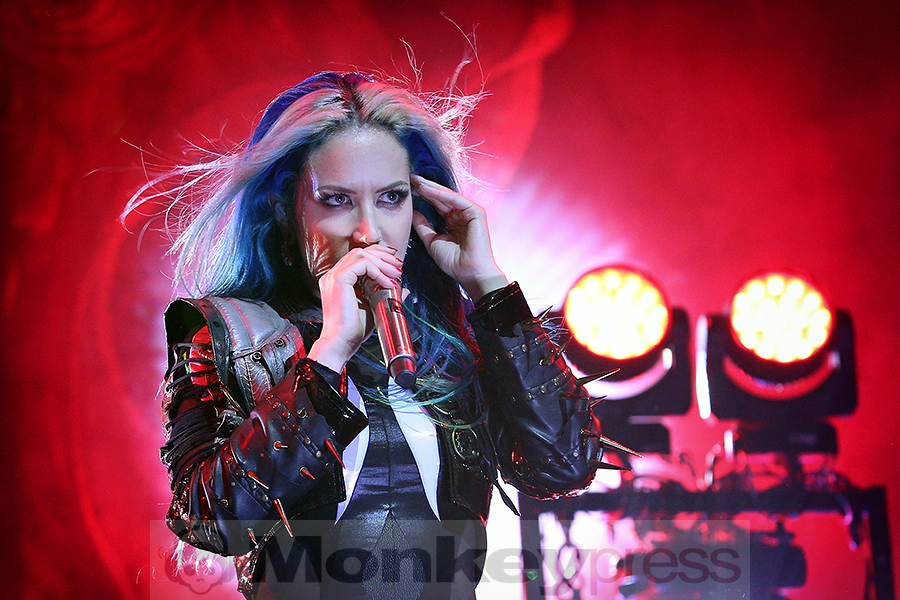 Danach gab es ein kurzes Innehalten bei der melodischen Bridge von My Apocalypse, viele Feuerzeuge und Handylichter wurden herausgeholt und geschwenkt. Auch das tut mal gut bei dem ganzen Brüllgewitter. Aber als es danach wieder ordentlich abgeht, kann man die nächsten Crowdsurfer erblicken, die wie seltene Schmetterlinge aus ihren Puppen geschlüpft sind, um ein paar kostbare Momente im Licht der Scheinwerfer zu erhaschen und wonnetrunken umherzuflattern, ehe sie von den Trophäensammlern im Graben unbarmherzig eingefangen und für die Konservierung auf Nadeln gesteckt werden. Auch Alissa sah nun offenbar die Zeit für eine Metamorphose gekommen und warf sich in einen weiß gestreiften Umhang für The Eagle flies alone. „I want you to sing along to Michael’s guitar“, fordert sie. „Michael, show them how it is done!“. Für das Ergebnis gab es dann auch reichlich Anerkennung: „I think you were the loudest crowd of this tour, Frankfurt!“. Na, das geht doch runter wie Öl. Heiserkeit und die nachherige Plünderung der Wick MediNait-Vorräte müssen sich schließlich auch lohnen. Mit Handshake with hell wurde ein Song gespielt, der trotz der jungen Geschichte vom aktuellen Album sicherlich bereits zu den populärsten der neuen Songs gezählt werden darf. Die abwechslungsreiche Komposition ist hier wirklich hervorragend gelungen und Alissa hat hier auch mal Gelegenheit, ihren wunderbaren Klargesang zu präsentieren. Die Göttin auf der Bühne war nach der Tributbezeugung ohnehin in gnädiger Stimmung: „You deserve a fast one“ verkündete sie der Menge und ließ die Hymne As the pages burn anstimmen. Belohnt wurde sie mit dem größten Moshpit des Abends.