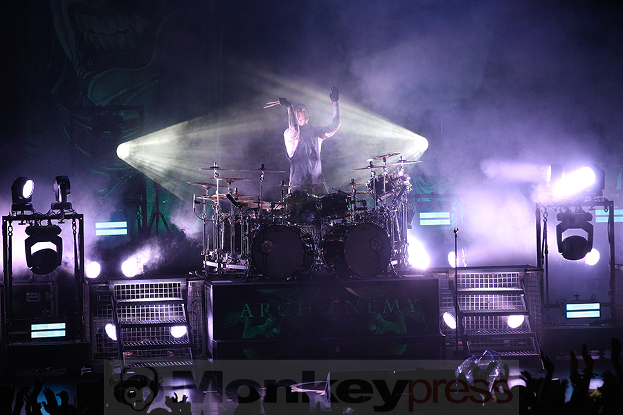 Arch Enemy: Gibt es irgendjemanden, der Alissa White-Gluzs Herrschaft im Growling-Bereich in Frage stellt? Ich denke, nicht. Alle liegen der blauhaarigen Walküre zu Füßen und so war es auch in Frankfurt. Für viele Kuttenträger kam jetzt der Höhepunkt des Abends. Auch die Schweden ließen sich zunächst nicht in die Karten gucken, sondern auch hier verdeckte ein riesiges Laken die im Umbau befindliche Bühne, diesmal mit der blutigroten Aufschrift „Pure fucking Metal“. Wegen der verzerrten Schrift hätte man zunächst auch „Puke fucking Metal“ lesen können, aber gekotzt wurde natürlich nicht. Als der Vorhang fiel und übergangslos Deceivers, Deceivers angestimmt wurde, flogen im Kaltstart-Moshpit die teuren Pfandbecher durch die Luft. In diesen schwierigen Zeiten will das schon etwas heißen, aber gut, hier gab es eben kein Halten mehr. Wohin mit den ganzen aufgestauten Emotionen? Auch wenn die Feuershow sich nicht mit der von Behemoth messen konnte, sondern eher etwas halbherzig wirkte, ein paar Feuerfontänen gab es ab Song 2 durchaus und das war natürlich die Hymne War Eternal. Die Stimmung näherte sich auch ohne Gluteruptionen dem Siedepunkt. Hymnisch ging es auch danach weiter: „Are you ready to have some fun tonight?“. Alissa scheint ein Fan rhetorischer Fragen zu sein. „It’s time for a classic from the album Wages of Sin, this is Ravenous!“. Die Menge brüllte begeistert und nahm direkt das Moshen wieder auf, um dieses Meisterwerk gebührend zu feiern. Beim Folgesong In the eye of the storm vom neuen Album schwenkte die Fronterin eine riesige Flagge mit dem Bandlogo. Die Frankfurter waren jedenfalls voll in ihrem Element und es wurde begeistert mitgesungen und die „Pommesgabeln“ blieben praktisch non-stop oben. Selbst auf den Rängen konnte man erstmals Bewegung ausmachen.