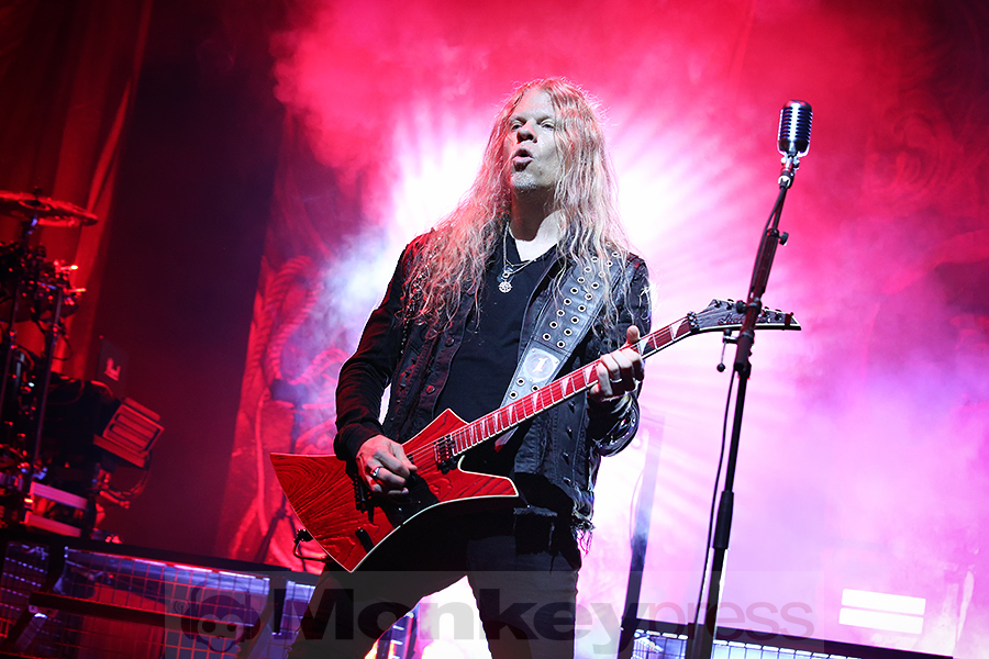 Auch die begnadeten Saitenzauberer von Arch Enemy sollten nun noch Gelegenheit bekommen, sich im besten Licht zu präsentieren. Jeff und Michael standen bei Snow Bound eine ganze Zeit lang allein im Rampenlicht, bis bei Nemesis nochmal aus allen Rohren gefeuert wurde und das Tempo beim großen Finale noch einmal anschwoll. Dass die etwas überkommene Tradition des Scheinbar-von-der-Bühne-Gehens hier weggelassen wurde, begrüße ich ausdrücklich. Viele Bands schenken sich mittlerweile das Ritual und spielen die Zugaben nahtlos nach dem Hauptset. Das ist auch besser für die armen Seelen, denen Wick MediNait ausgegangen ist und die auf ihre Stimme am nächsten Tag noch angewiesen sind. Ein fulminanter Abend mit vier großartigen Bands ging zuende, aber Halt: Als „fünfter Auftritt“ muss natürlich noch der spontan zusammengekommene Foyer-Chor erwähnt werden, der zwar nur einen Song sang, den aber sehr ausdauernd. Die namentlich nicht bekannte Gruppe schaffte es, einen vielstimmigen Kanon mit sehr eingängigen Lyrics zu präsentieren: Eintracht Frankfurt olé! Offenbar hatten die Adlerträger Marseille geschlagen. Ende gut – alles gut!