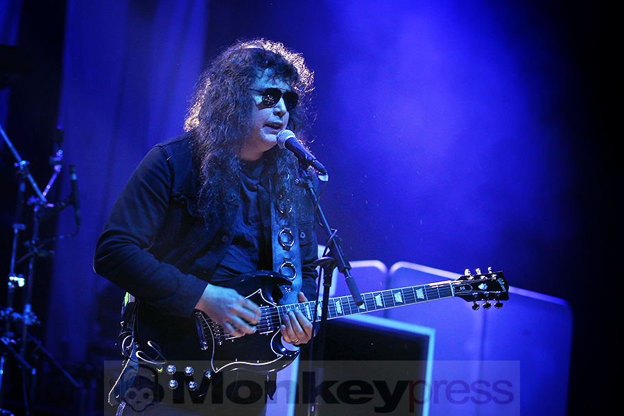 Nun konnte die „Brüllwürfel-Fraktion“ aber endlich aufatmen und den ersten Schluck Blut aus der Pulle nehmen, denn Carcass warteten natürlich nicht mit Radio-Balladen auf, sondern gaben allen Zuhörern gleich einen auf die Zwölf, die Sause startete auch gleich mit dem Kracher Buried Dreams. Auch Artwork-technisch gab es Pluspunkte, die Band performte vor einem riesigen skelettierten Brustkorb-Backdrop. Ein weiteres tolles Showelement waren die fünf vertikal ausgerichteten Minibildschirme, auf denen passende Kurzsequenzen liefen, zum Beispiel Röntgenbilder in schneller Abfolge, oder auch hochschießende Flammen. Das Auge bangt und brüllt mit! Wir erinnern uns: Die Band war seit den Anfangsjahren dafür bekannt, besonders mit medizinisch-chirurgischen Fachbegriffen in den Lyrics um sich zu werfen. Das aktuelle Album Torn Arteries ist da keine Ausnahme. Es geht wieder blutig zu und das haben die Anwesenden in Frankfurt natürlich abgefeiert. Die Single Kelly’s Meat Emporium wurde genauso gespielt wie The Scyth’s Remorseless Swing. Die begeisterten, angefixten Zuhörer ließen sich indes zu den ersten Moshpits des Abends hinreißen. Zwischendurch könnte manch ein Ungebildeter nach Luft geschnappt haben, als auf den erwähnten Bildschirmen neben dem Davidsstern, den christlichen Fischsymbol und dem Islam-Halbmond auch eine Swastika zu sehen war. Das Symbol aus dem Hinduismus und Buddhismus hat Ähnlichkeit mit einem Hakenkreuz, aber der Kontext war natürlich klar genug. Von der Bühne flog derweil ein Plektrum nach dem anderen in die Menge, die Devotionalien-Jäger hatten also gute Chance auf ein haptisches Souvenir in Ergänzung zur schönen Erinnerung. „Let me see your fucking fists, come on“, ließ Sänger Jeff Walker keine Müdigkeit zu und präsentierte zusammen mit seiner Truppe den Titelsong von Heartwork. Zum Schluss gab es als musikalisches Vermächtnis des Abends den über 30 Jahre alten Song Carneous Cacoffiny und eine vage Prophezeiung in Form des Satzes: „See you next year, probably“.